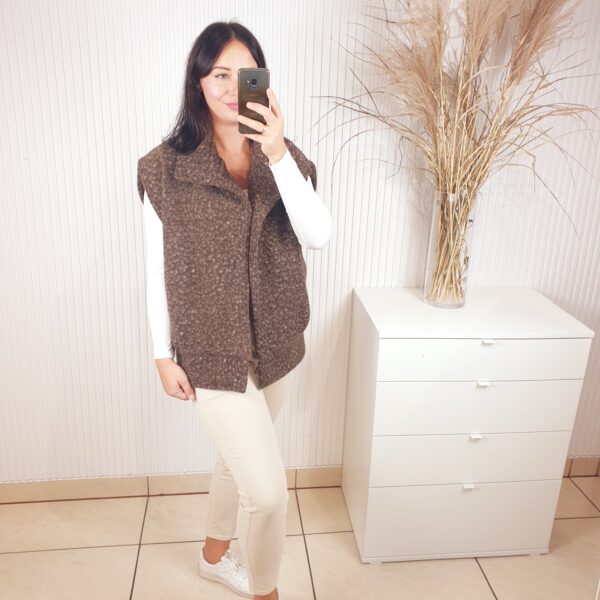Kamizelka o oversizowym fasonie, z kieszeniami i kołnierzem. Posiada podszewkę. Wykonana z melanżowego materiału typu bukla. Idealna do jesiennych stylizacji. Bardzo komfortowa i wygodna w noszeniu.