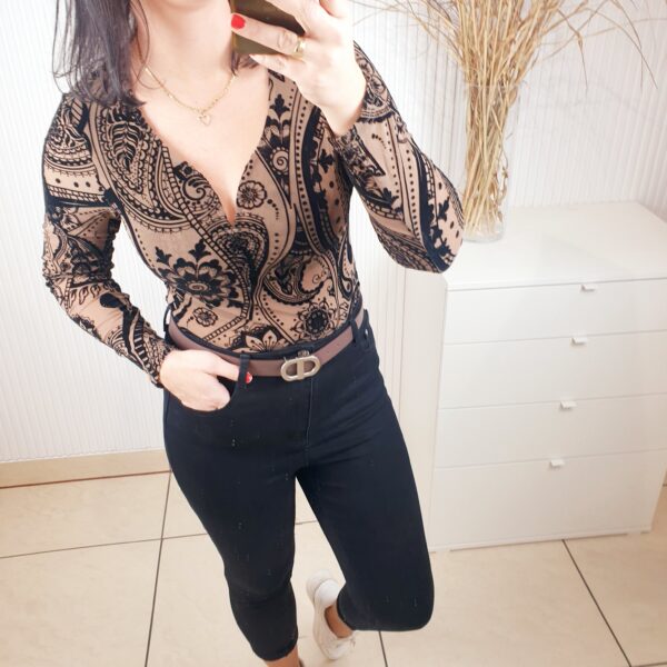 Cudowne body w czarne wzory. Wykonane z delikatnej siateczki. Posiada głęboki dekolt oraz długi rękaw. Bardzo efektowne i oryginalne. Idealne zarówno do spodni jak i do spódnicy.