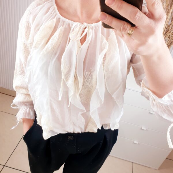 Bluzka z wyszywanymi kwiatami to stylowa propozycja dla kobiet, które lubią subtelne, a jednocześnie wyraziste detale. Przewiewna, wykonana z cienkiego materiału. Model wyróżnia się efektownym wiązaniem przy szyi, które dodaje całości elegancji i dziewczęcego uroku. Cudowne falbanki z przodu dodają lekkości, rękawy zakończone gumką.