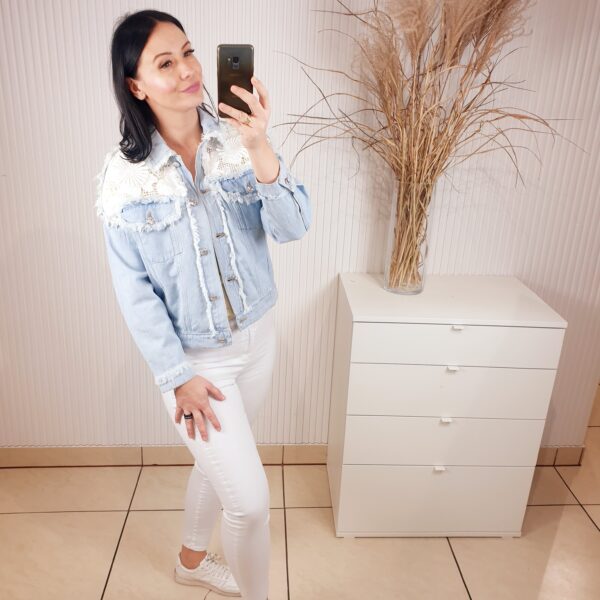 Cudowna, nietuzinkowa kurtka jeansowa z ażurowymi wykończeniami. Posiada z przodu dwie kieszonki, oraz wyszywane białe kwiaty. Cały tył również wykończony białym, ażurowym kwiatowym wzorem. Oryginalna, idealna na chłodniejsze wiosenne poranki oraz wieczory.