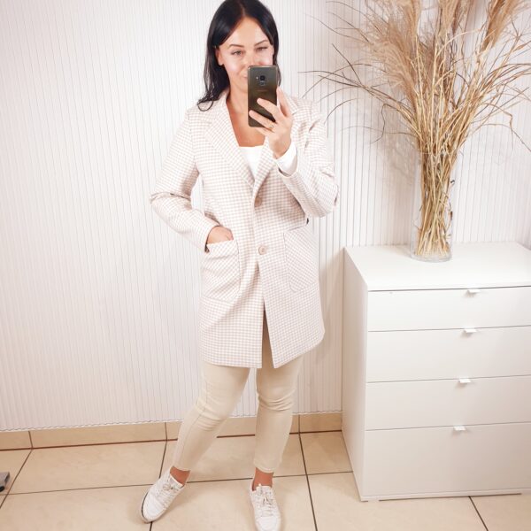 Płaszcz o klasycznym, prostym fasonie zapinany na dwa guziki. Posiada dwie kieszenie z przodu oraz podszewkę. Polska produkcja, wykonany z 70% wełny i 30% akrylu. Cudowny wzór delikatnej beżowo-białej kraty.