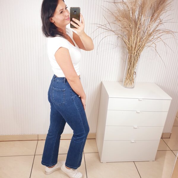 Spodnie o charakterystycznym fasonie, z wyższym stanem, modelujące, z prostą nogawką. W najmodniejszym kolorze sezonu-ciemnym granacie. Idealnie skomponują się zarówno ze sportowym obuwiem jak i bardziej eleganckim typu mokasyny. Komfortowe i wygodne w noszeniu-wykonane z cienkiego jeansu. Z przodu ozdobne złote guziki, posiadają kieszenie z tyłu.