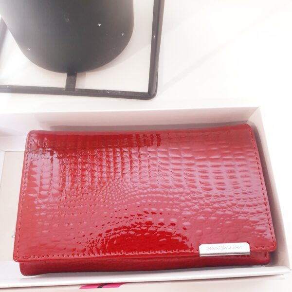 Damski portfel w cudownym odcieniu soczystej czerwieni. Lakierowany, zapinany na zatrzask oraz zamek. Posiada miejsce na bilon, na dowód, na zdjęcie. Wykonany ze skóry naturalnej. Posiada system antykradzieżowy.
