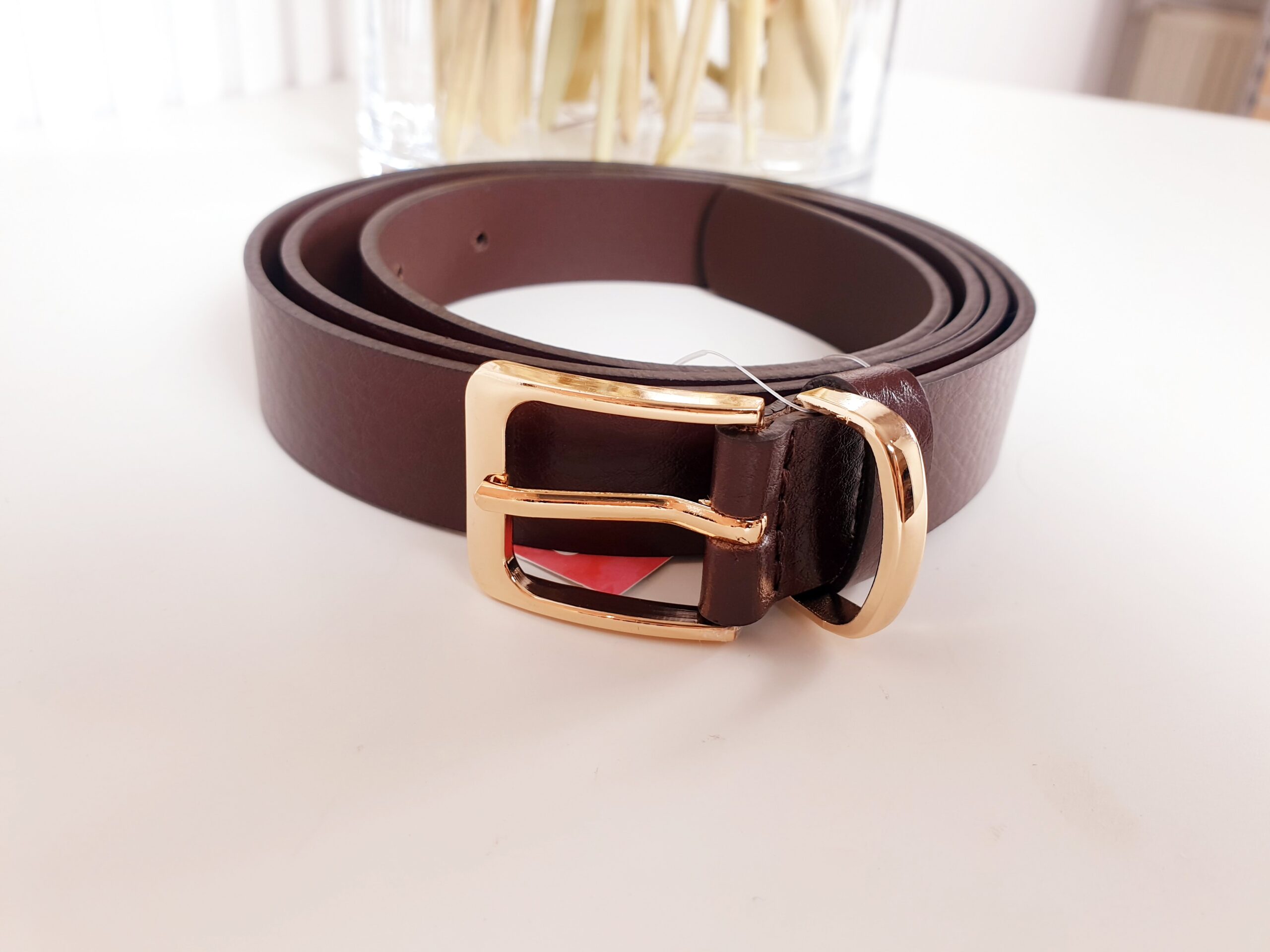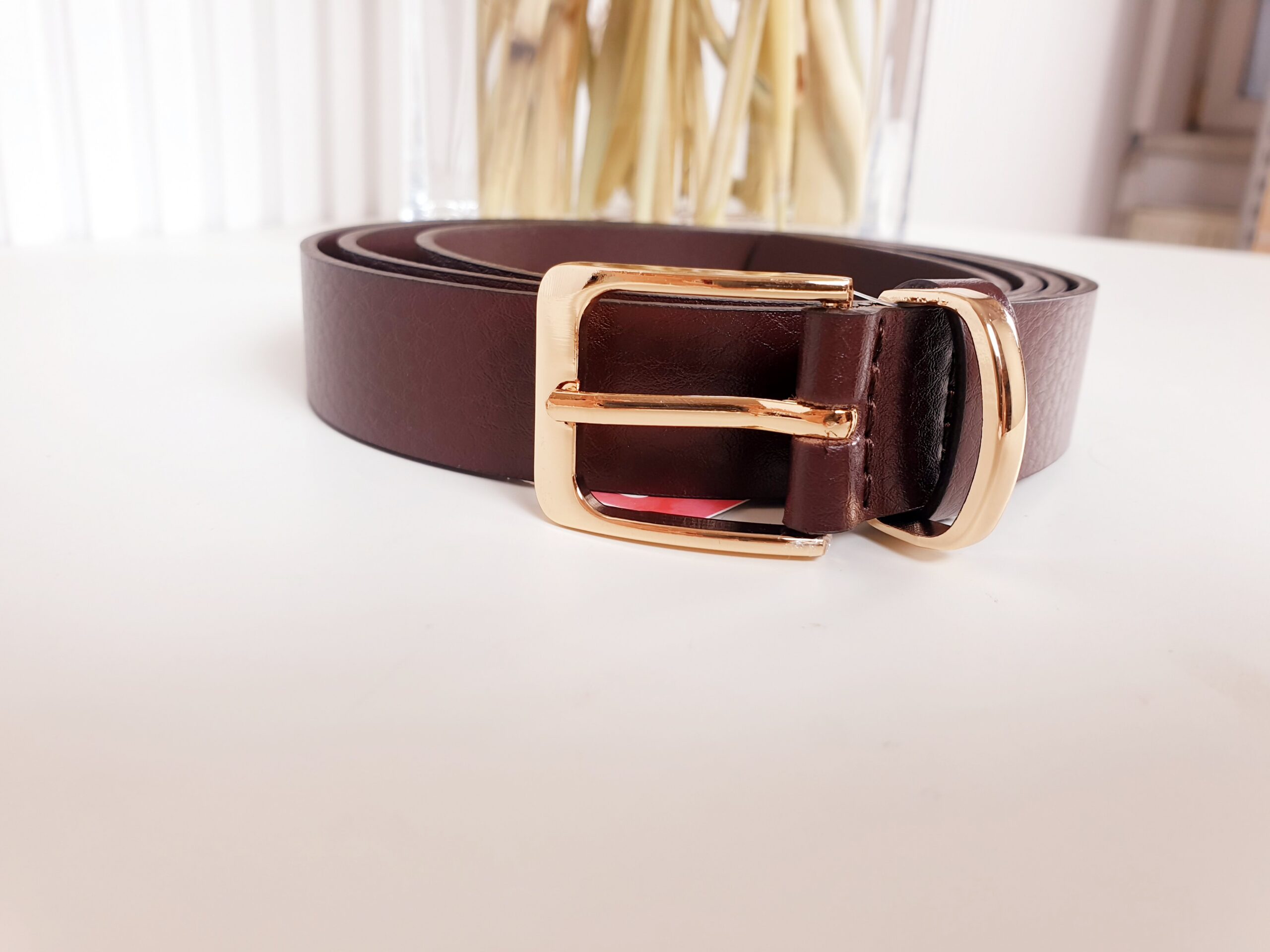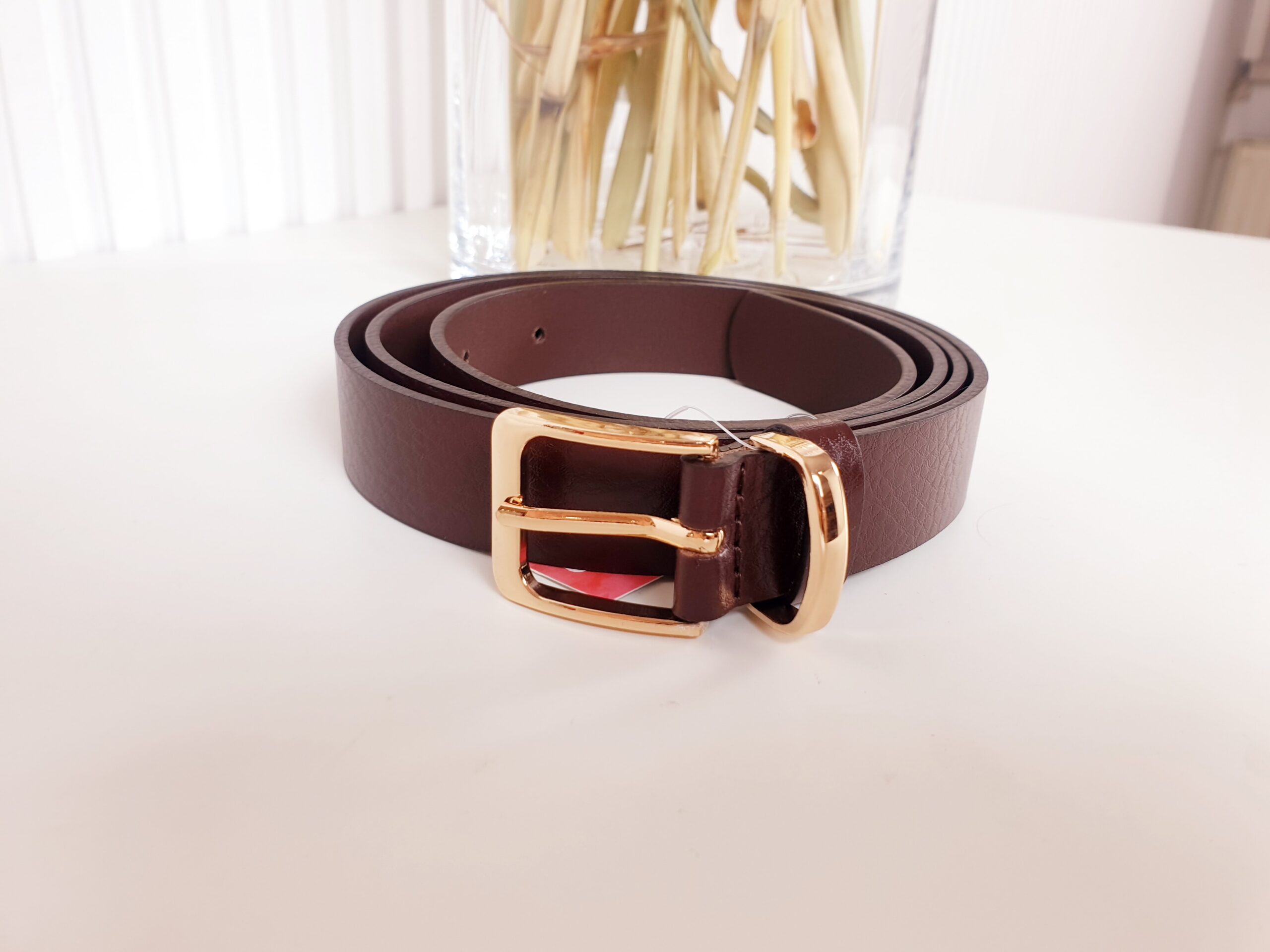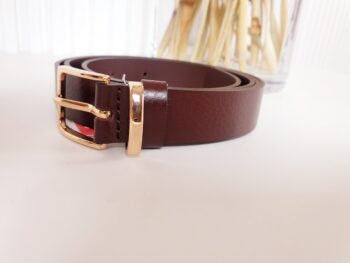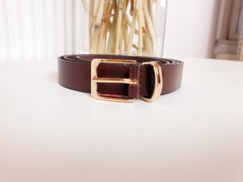 pasek, ma-za, brązowy, złota klamra, pasek damski, pasek skórzany