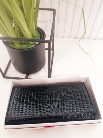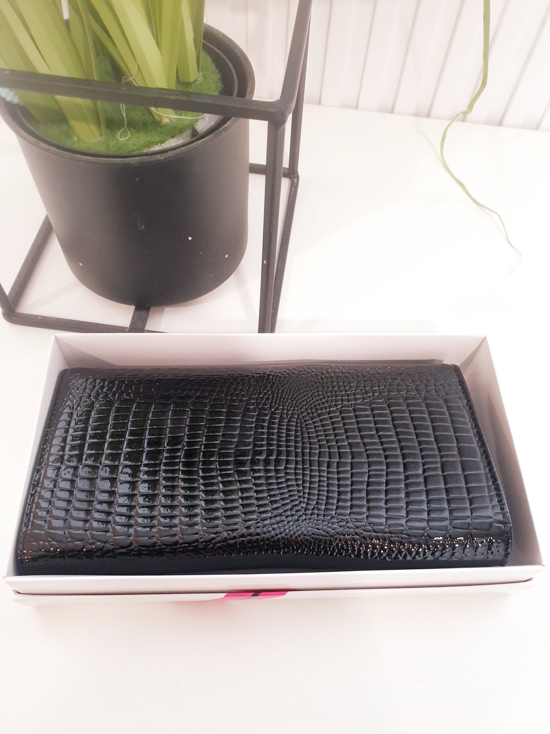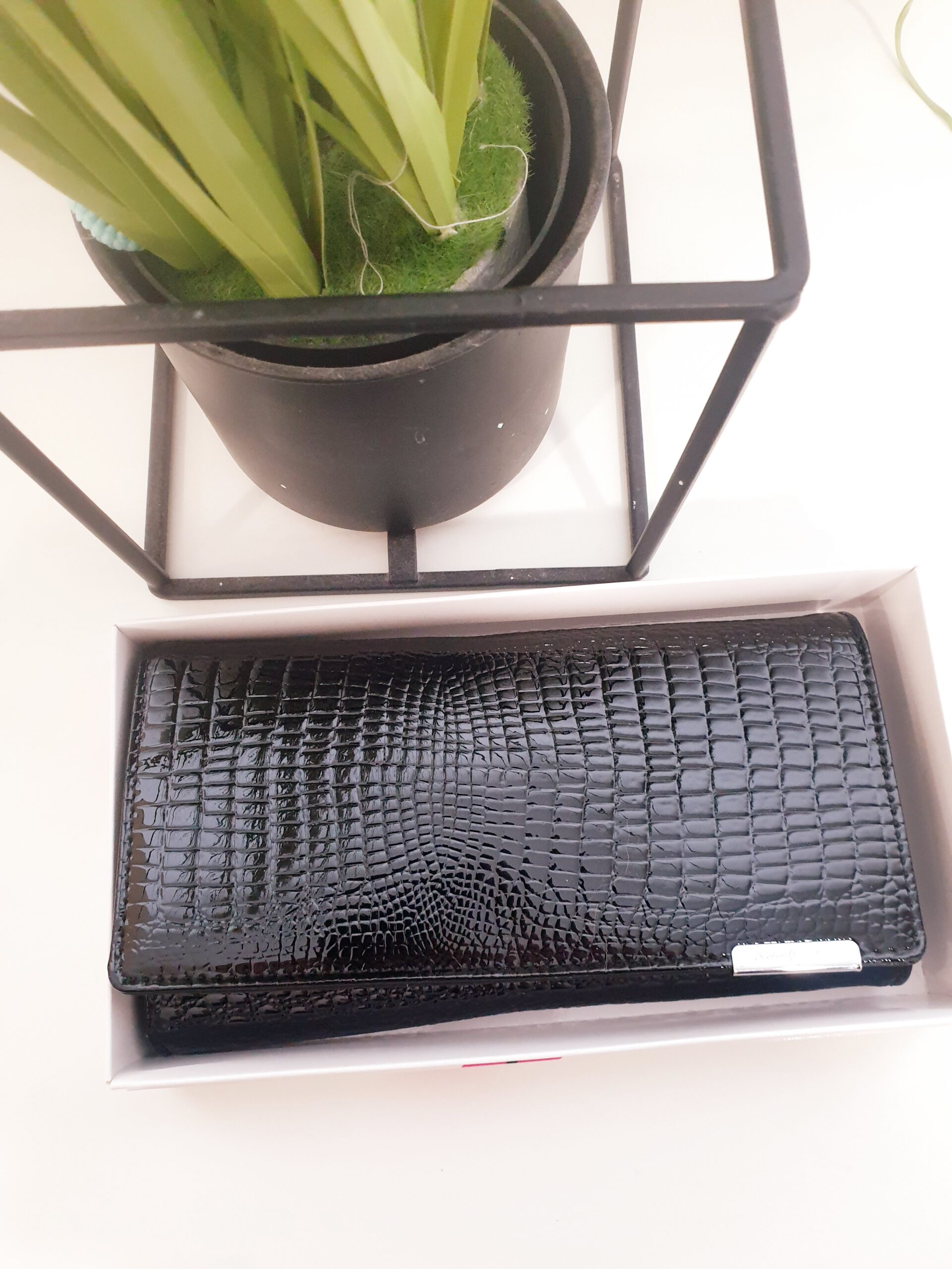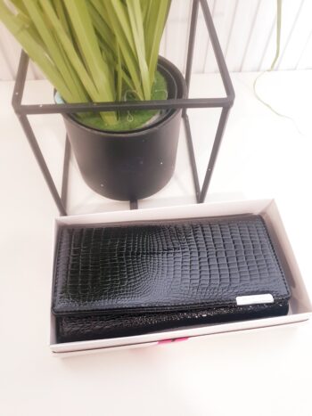 Damski portfel w odcieniu czerni. Lakierowany, zapinany na zatrzask oraz zamek. Posiada miejsce na bilon, na dowód, na zdjęcie. Wykonany ze skóry naturalnej. Posiada system antykradzieżowy.