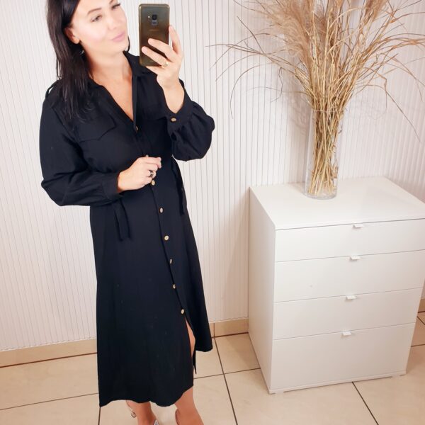 Sukienka w stylu szmizjerki o długości midi. Zapinana na beżowe guziki, posiada długi rękaw. W talii regulacja za pomocą ozdobnych złotych klamerek. Idealna do jesiennych stylizacji.