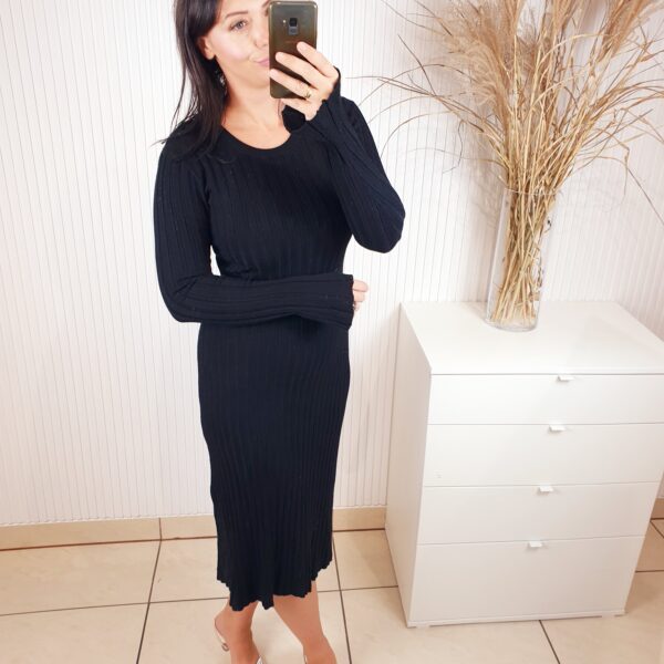 Sukienka dzianinowa o długości midi wykonana z prążkowanego materiału. Posiada okrągły dekolt oraz rozszerzane rękawy. Idealna na chłodniejsze dni. Cudownie sprawdzi się jako baza do jesiennych stylizacji.