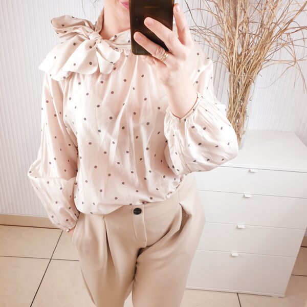 Koszula w groszki to stylowa propozycja dla kobiet, które lubią subtelne, a jednocześnie wyraziste detale. Przewiewna, wykonana z cienkiego materiału. Model wyróżnia się efektownym wiązaniem przy szyi, które dodaje całości elegancji i dziewczęcego uroku. Rękawy zakończone gumką.