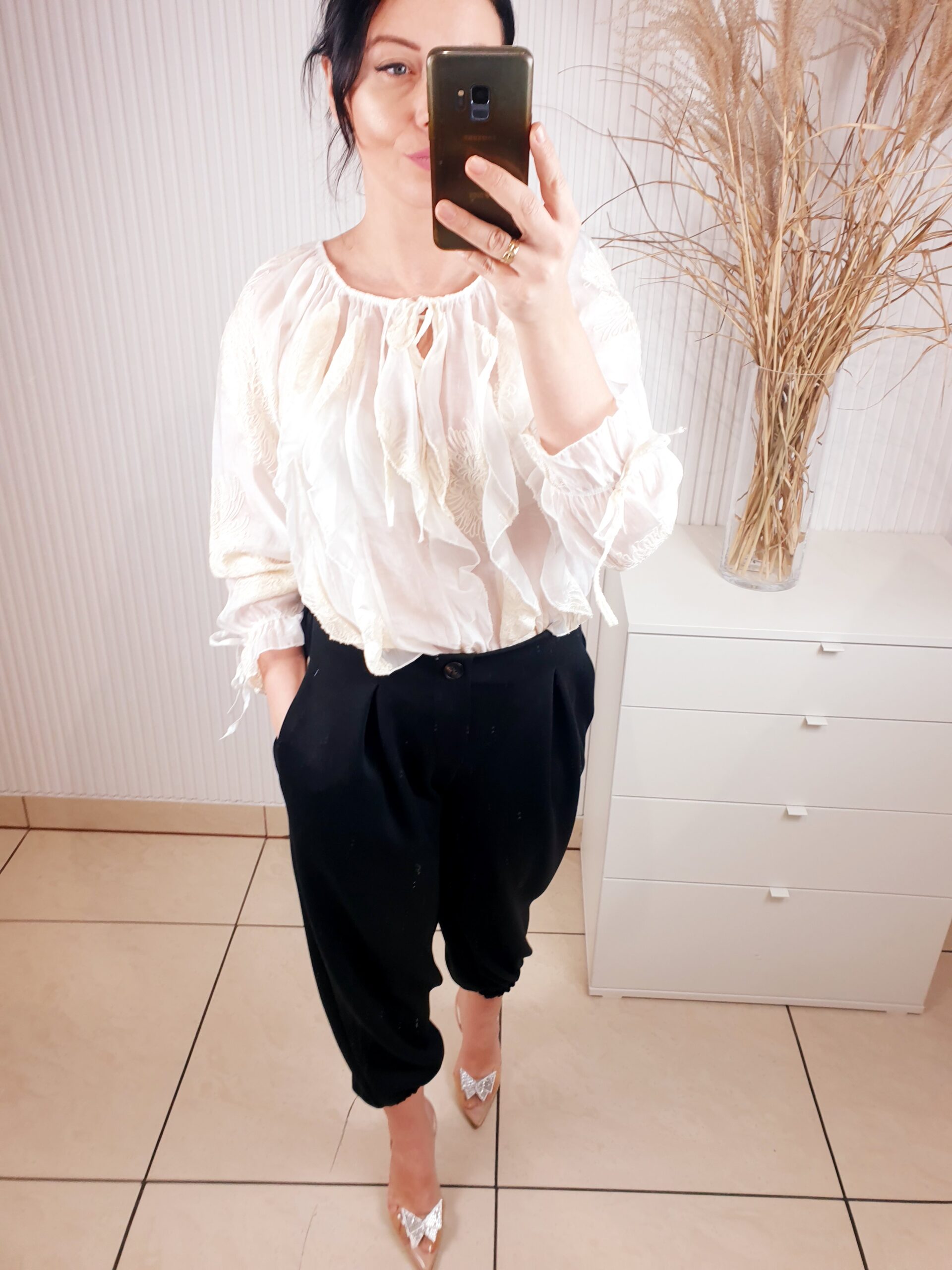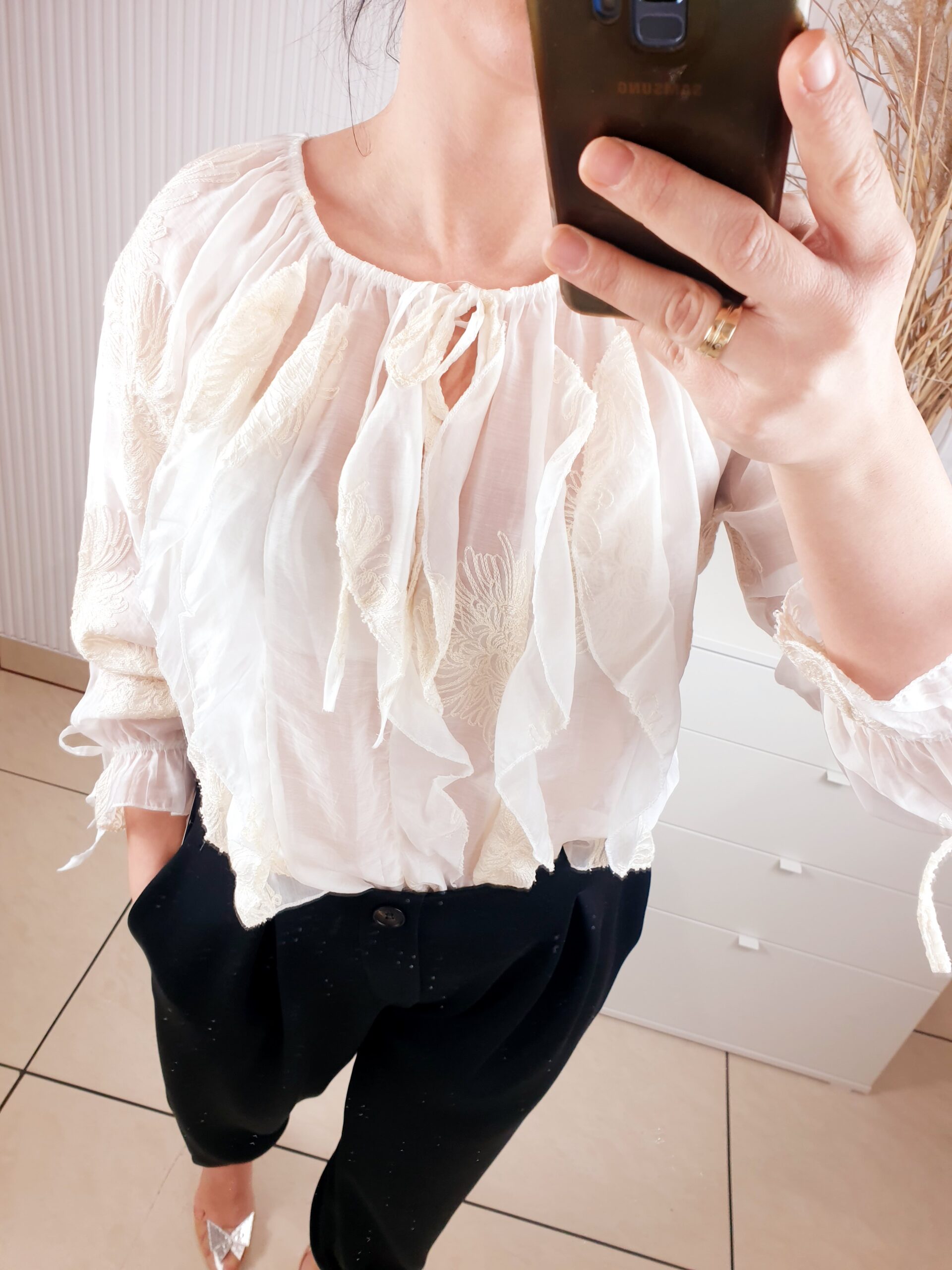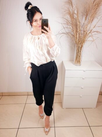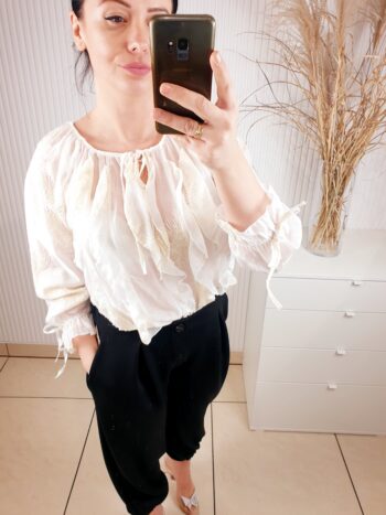 Bluzka z wyszywanymi kwiatami to stylowa propozycja dla kobiet, które lubią subtelne, a jednocześnie wyraziste detale. Przewiewna, wykonana z cienkiego materiału. Model wyróżnia się efektownym wiązaniem przy szyi, które dodaje całości elegancji i dziewczęcego uroku. Cudowne falbanki z przodu dodają lekkości, rękawy zakończone gumką.