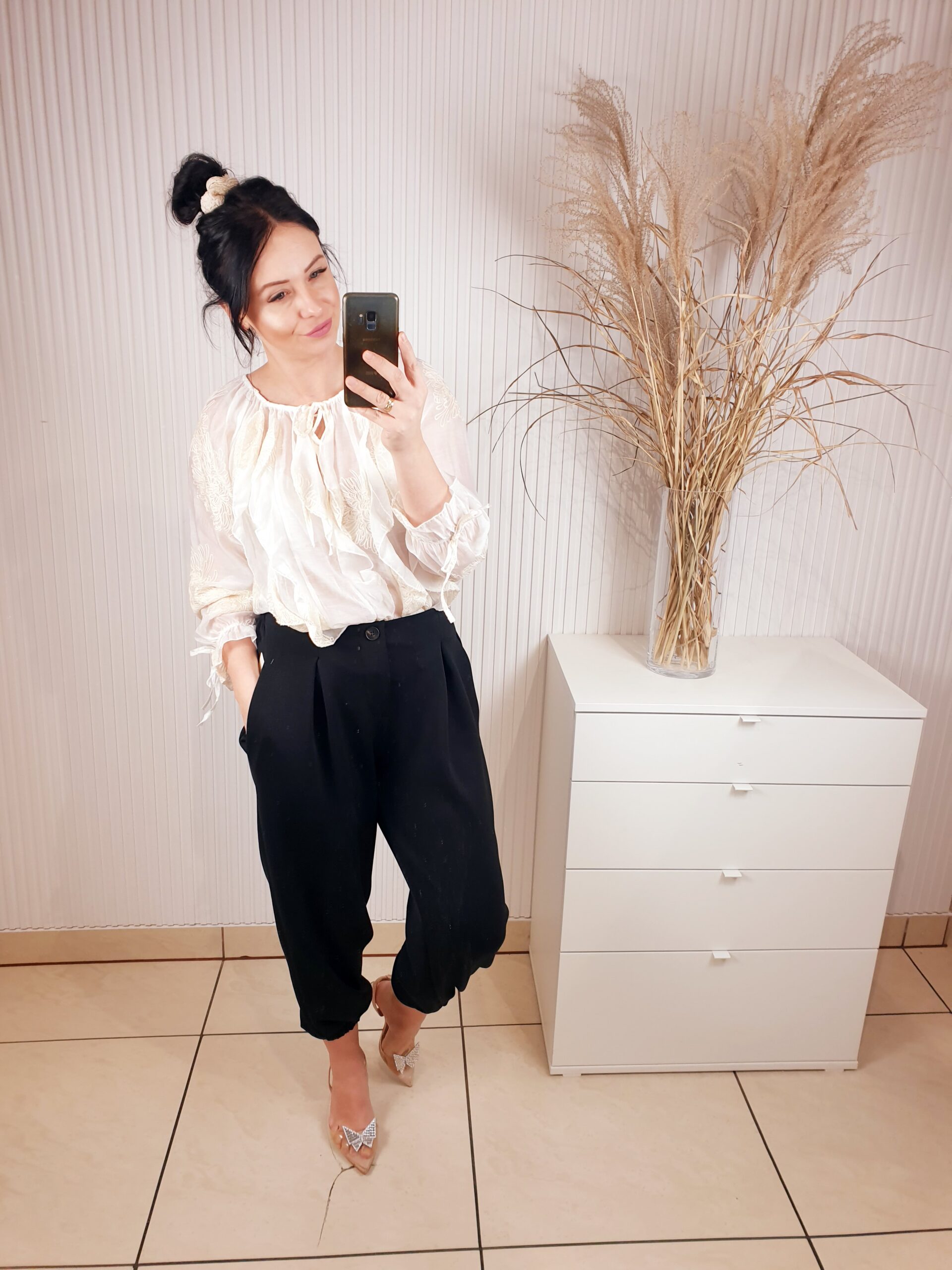 bluzka, wiązana na dekolcie, damska bluzka z wyszywanymi kwitami, bluzka z długim rękawem, bluzka damska w wyzywane kwiaty