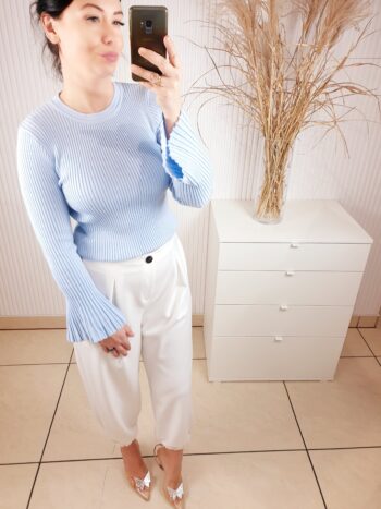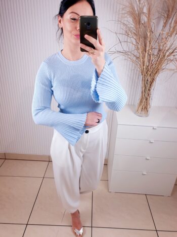 Prążkowana bluzka o dopasowanym fasonie i okrągłym dekoltem pod szyją. Posiada uroczy, rozszerzany rękaw który nadaje jej uroku. Idealna do wiosennych stylizacji, w cudownym kolorze baby blue.