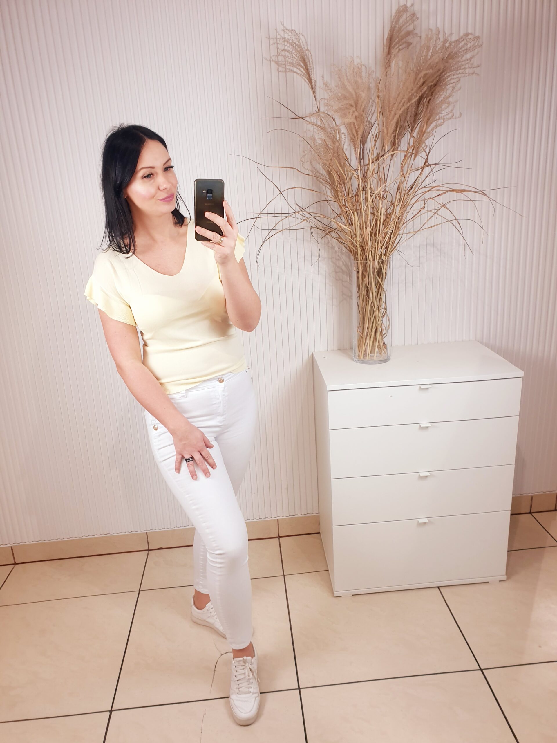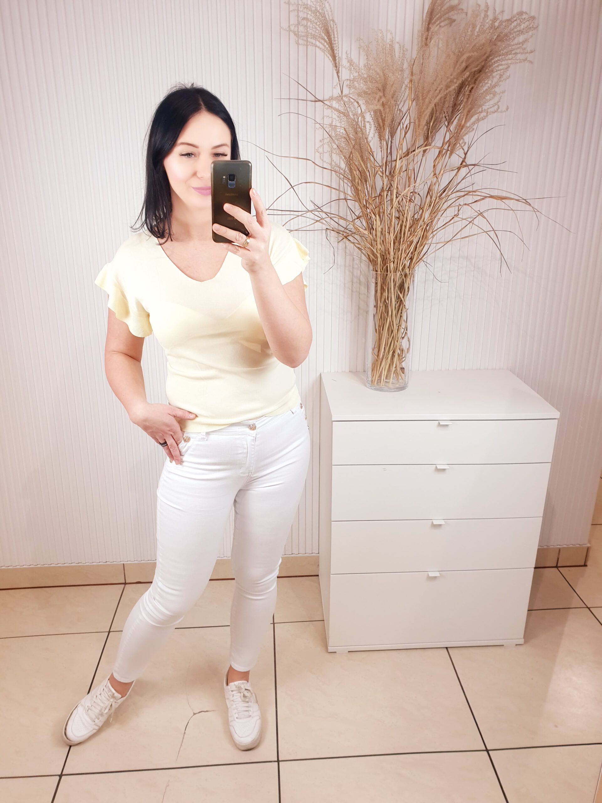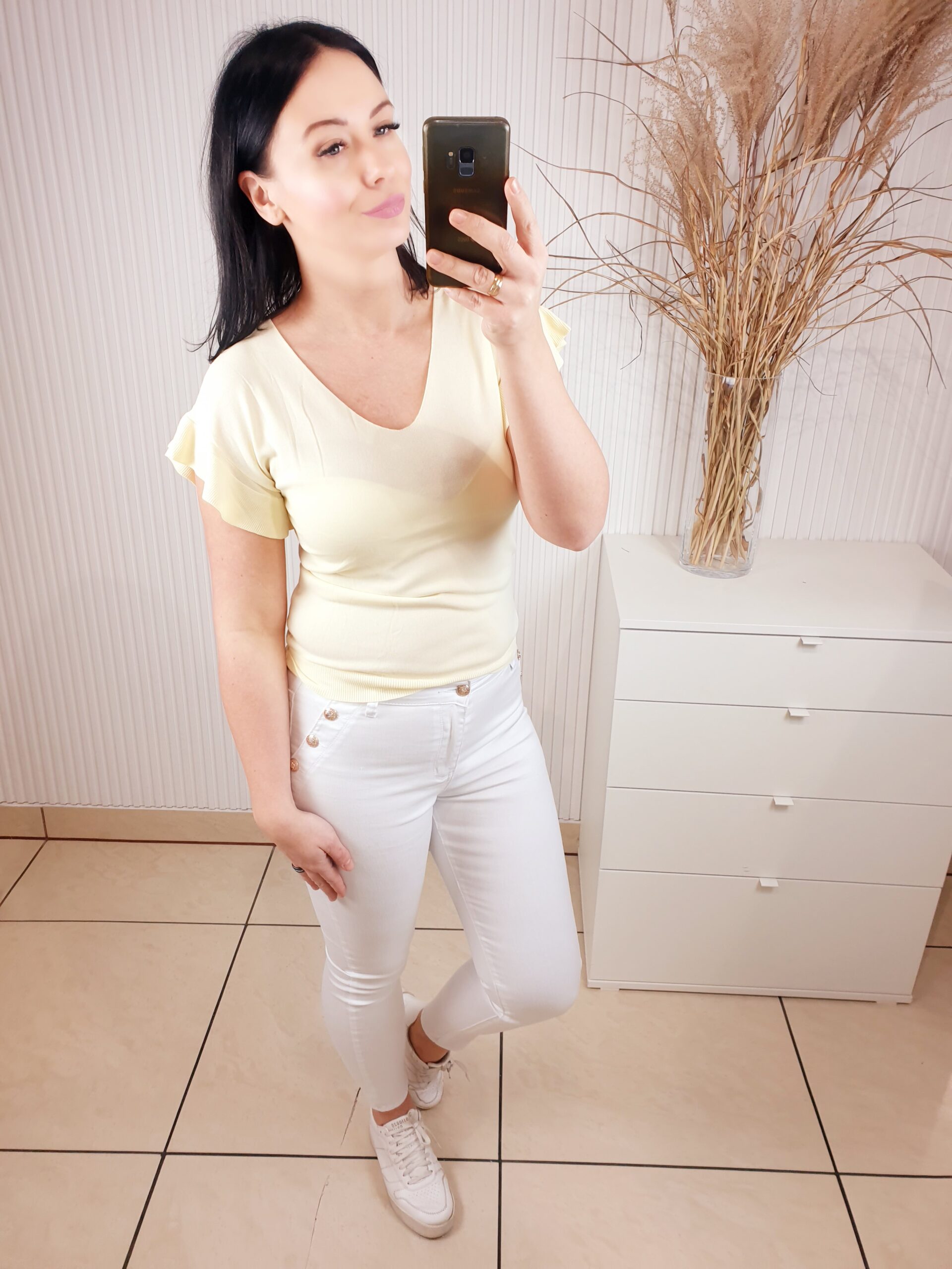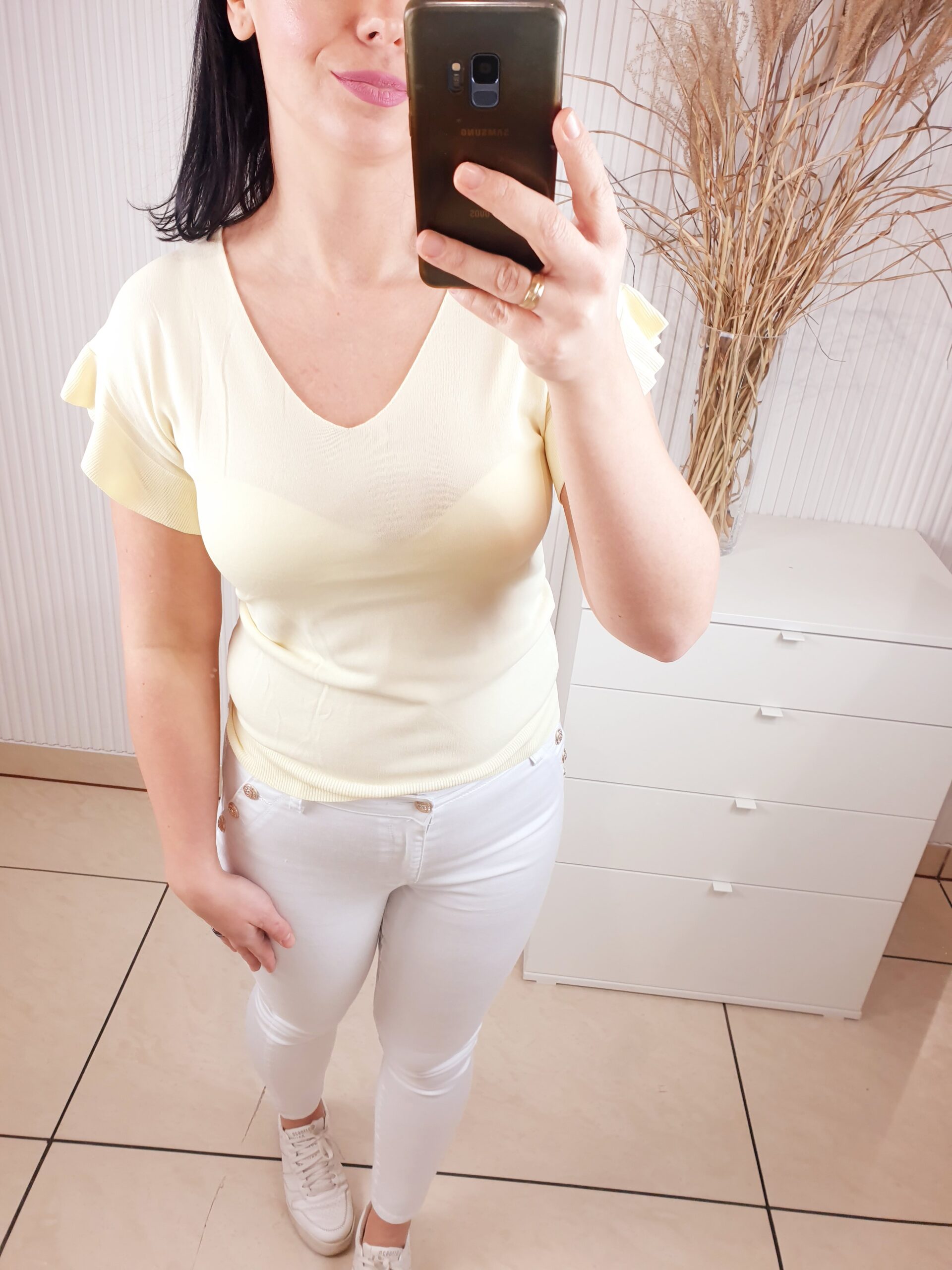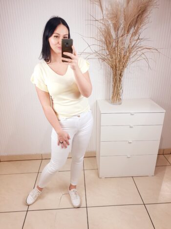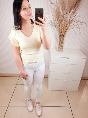 Delikatny sweterek z dekoltem w serek i falbanką przy rękawie. Wykonany z 63% z wiskozy, przyjemny w dotyku. W cudownych wiosennych kolorach, idealnie sprawdzi się w zestawie zarówno ze spodniami jak i spódnicą. Komfortowy i wygodny w noszeniu.