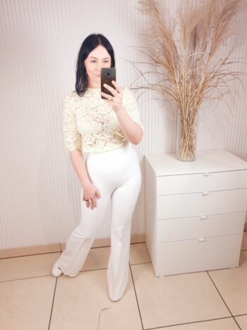 Eleganckie spodnie z wysokim stanem, z długimi rozszerzanymi nogawkami, które posiadają rozcięcia. Z przodu modne przeszycia na całej długości. Idealnie podkreślają sylwetkę, modelują i optycznie wyszczuplają.