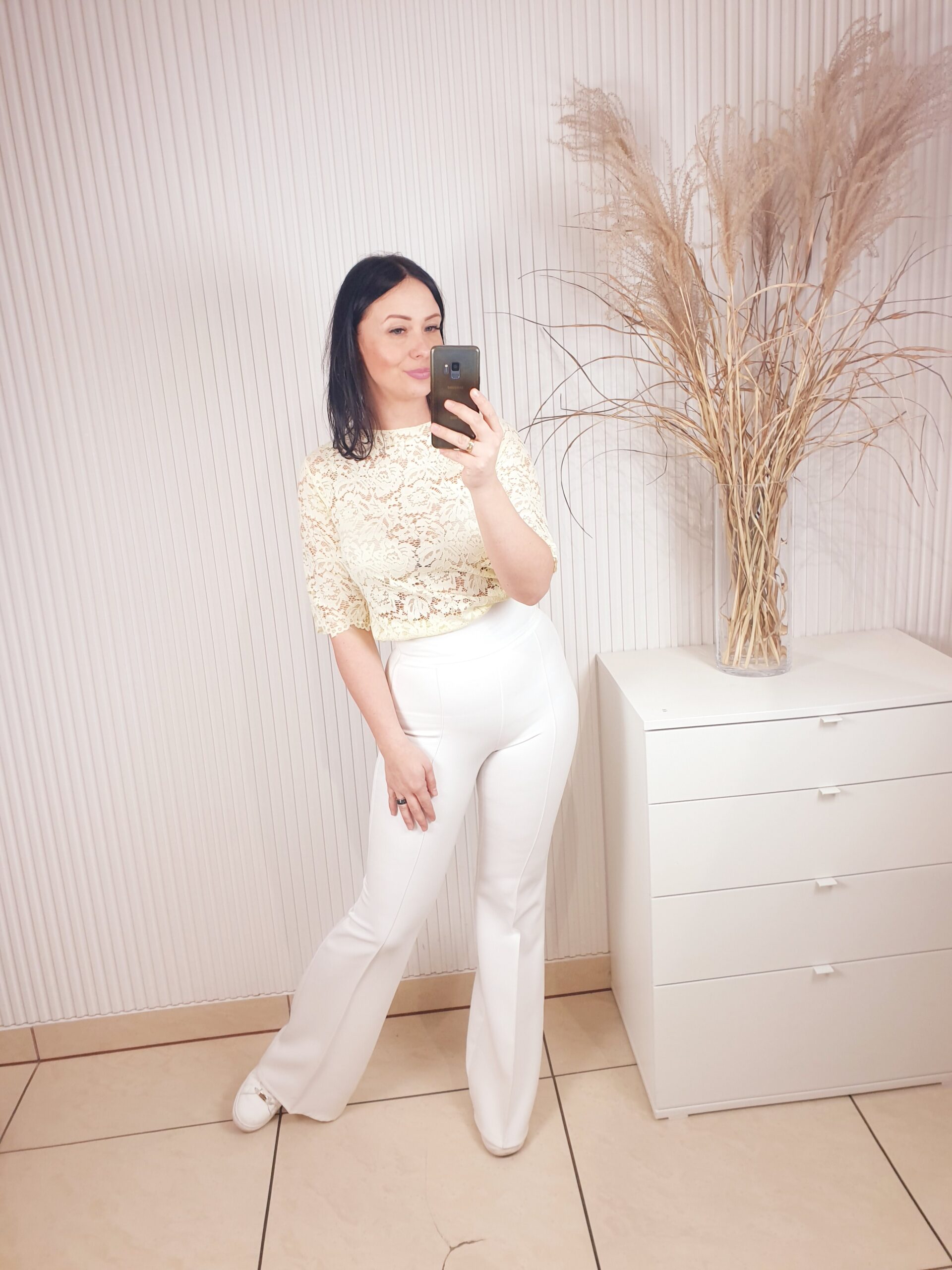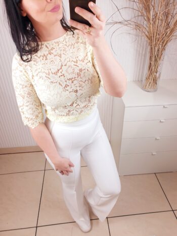 bluzka, koronkowa, biała, z krótkim rękawem, dopasowana, damska koronkowa bluzka