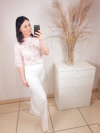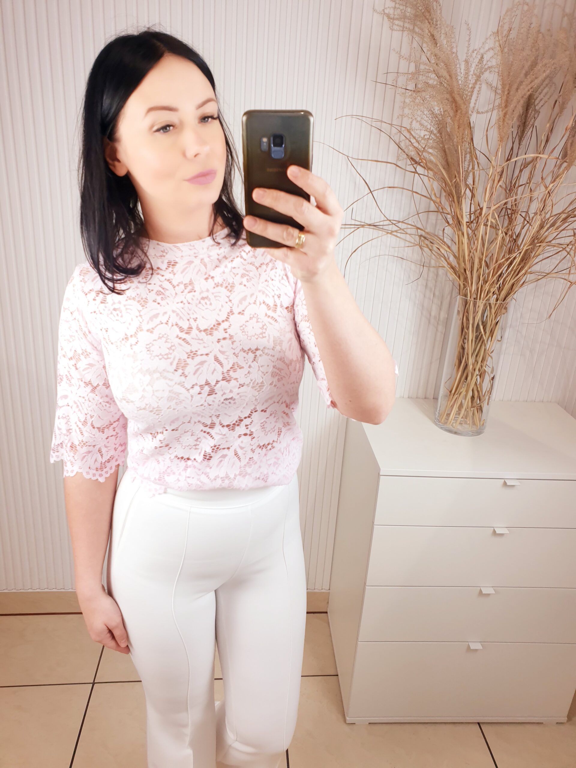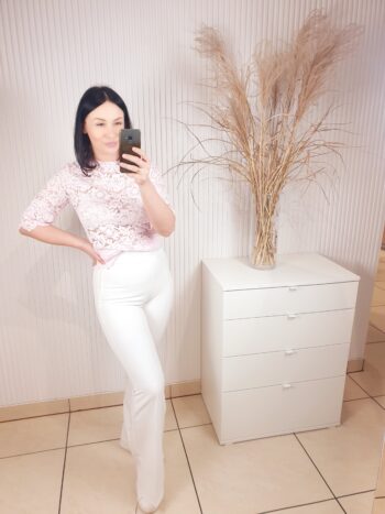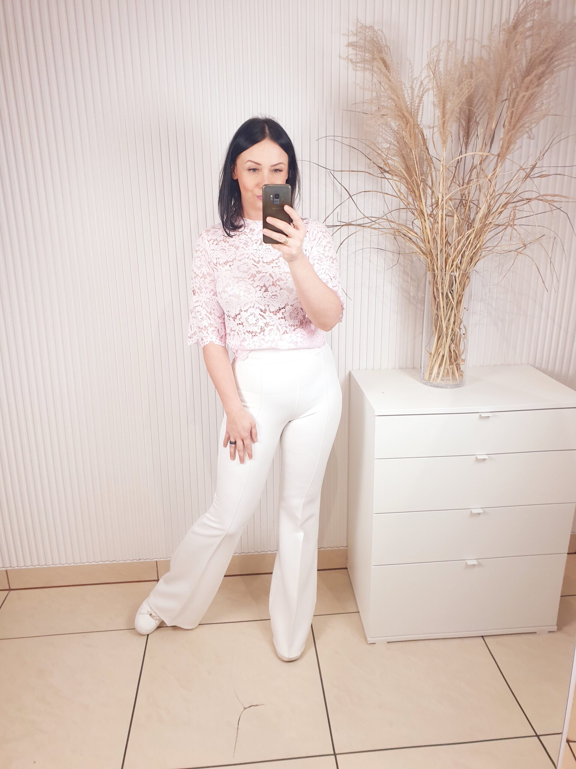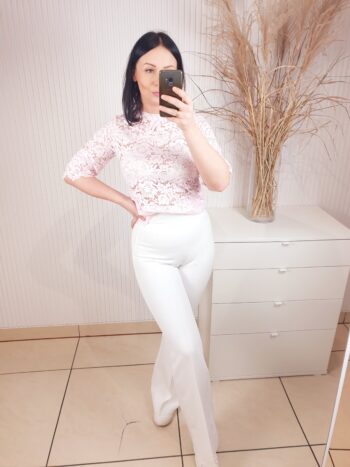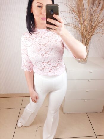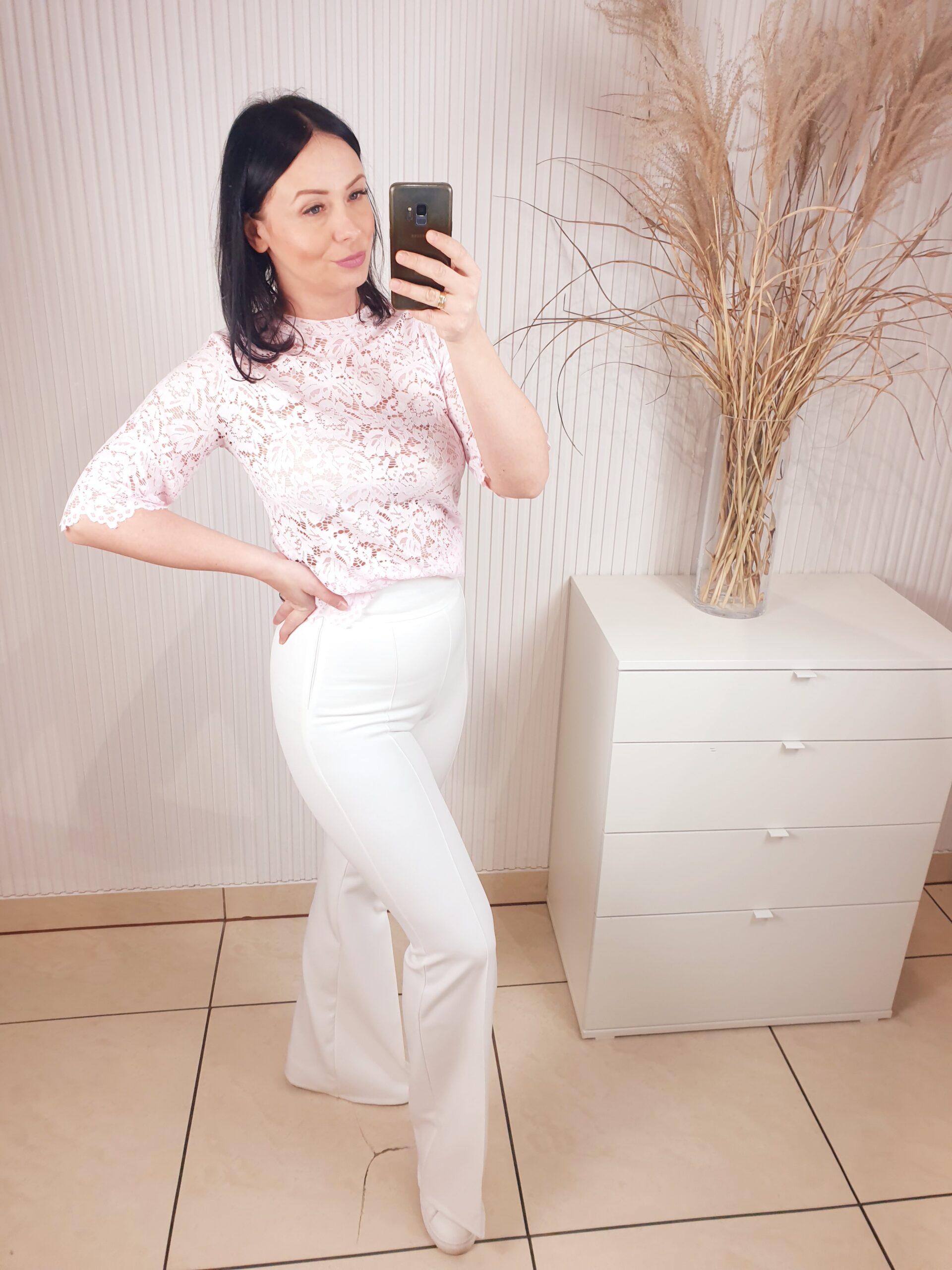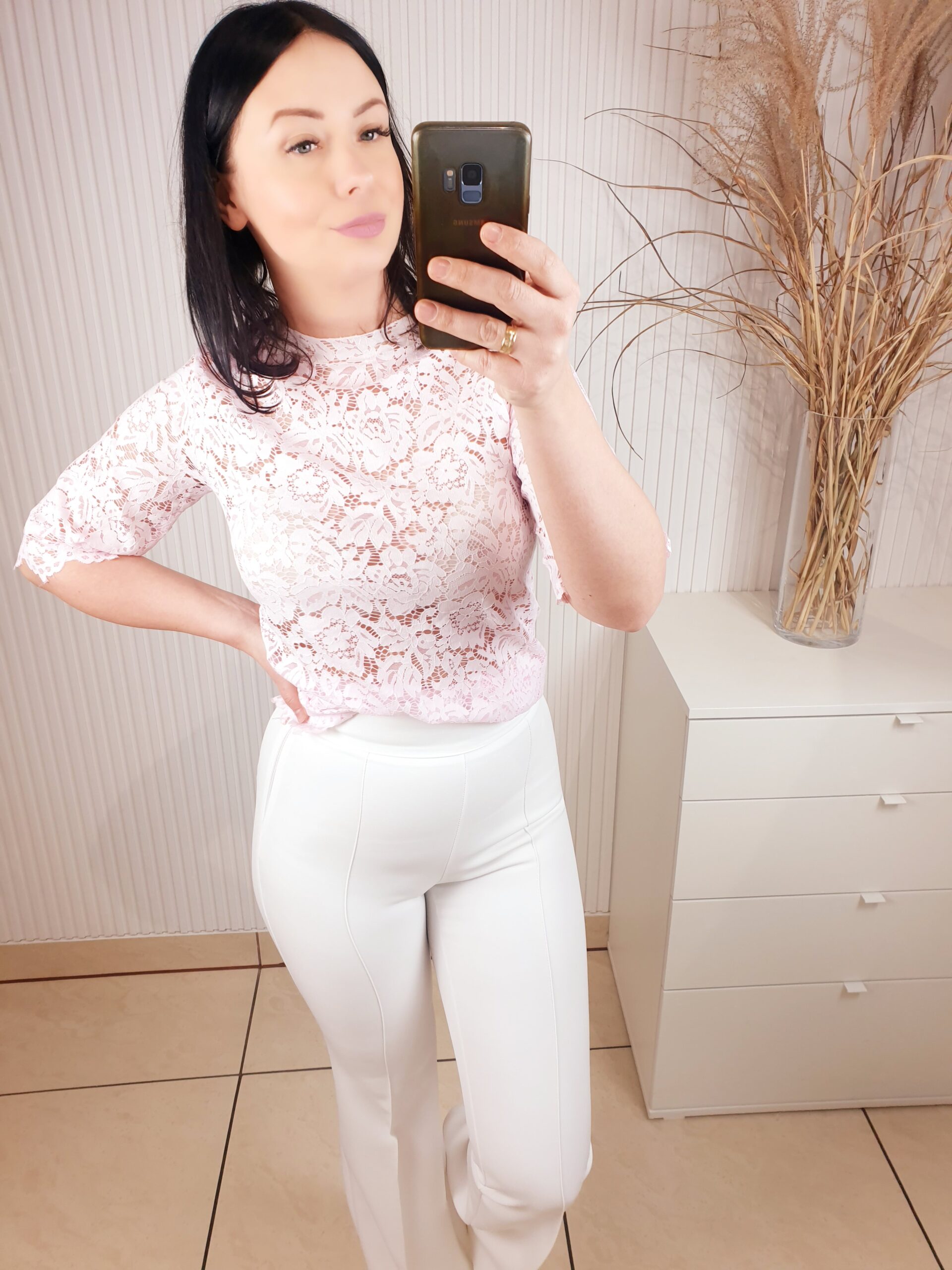 Koronkowa bluzka wykonana z elastycznego, transparentnego materiału. To propozycja o dopasowanym kroju posiadająca zaokrąglony dekolt. Idealna pod marynarkę lub solo. Rozmiar uniwersalny, krótki rękaw.