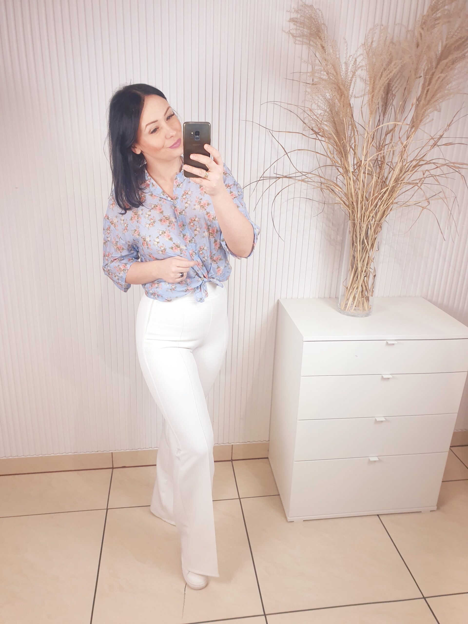 komplet, spodnie, koszula, z czarnymi wykończeniami, spodnie z kieszeniami, koszula zapinana na guziki,