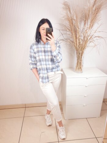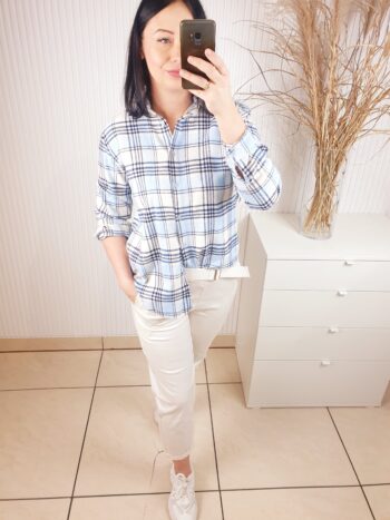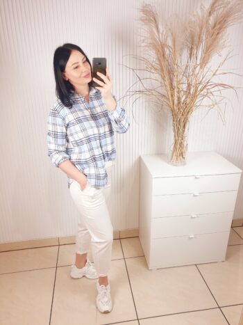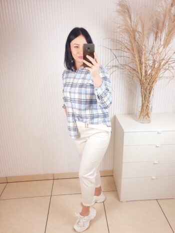 Stylowa koszula damska o luźnym kroju, która łączy klasykę z delikatną kobiecą subtelnością. Zapinana na guziki na całej długości, z klasycznym kołnierzykiem sprawdzi się zarówno w codziennych jak i bardziej formalnych stylizacjach. Wzór w kratę doda całości oryginalnego i wyjątkowego charakteru.