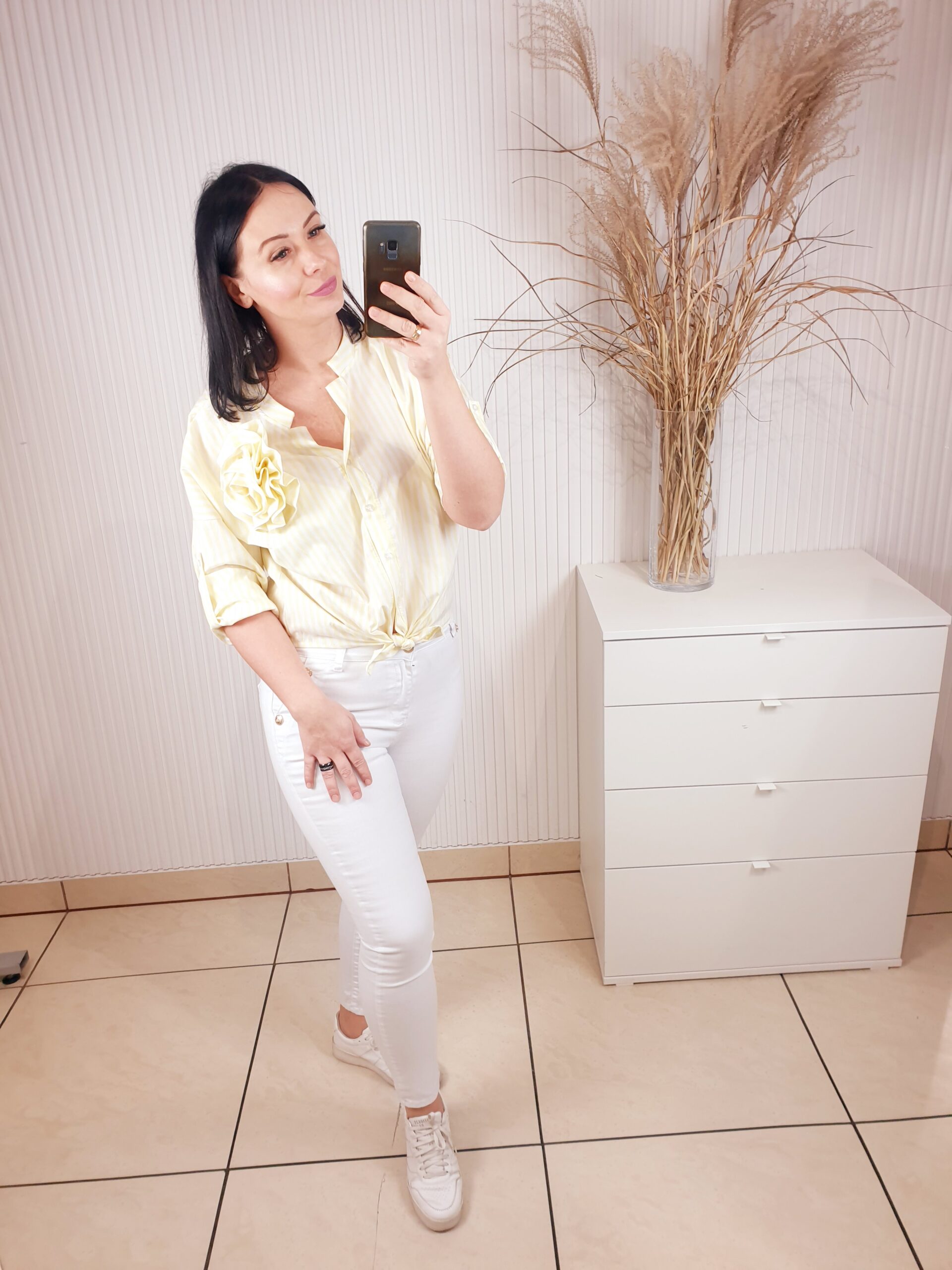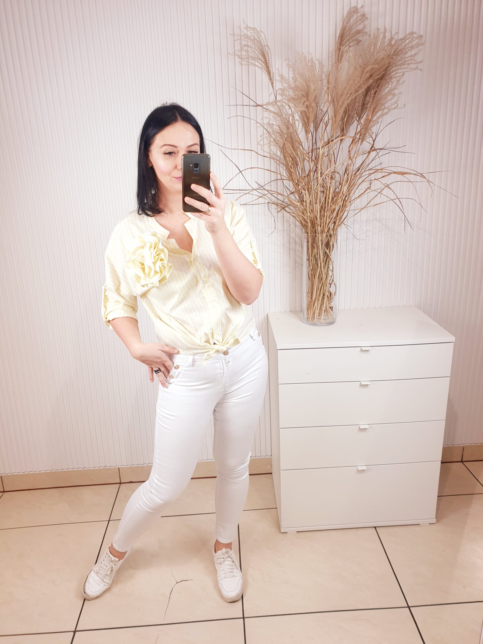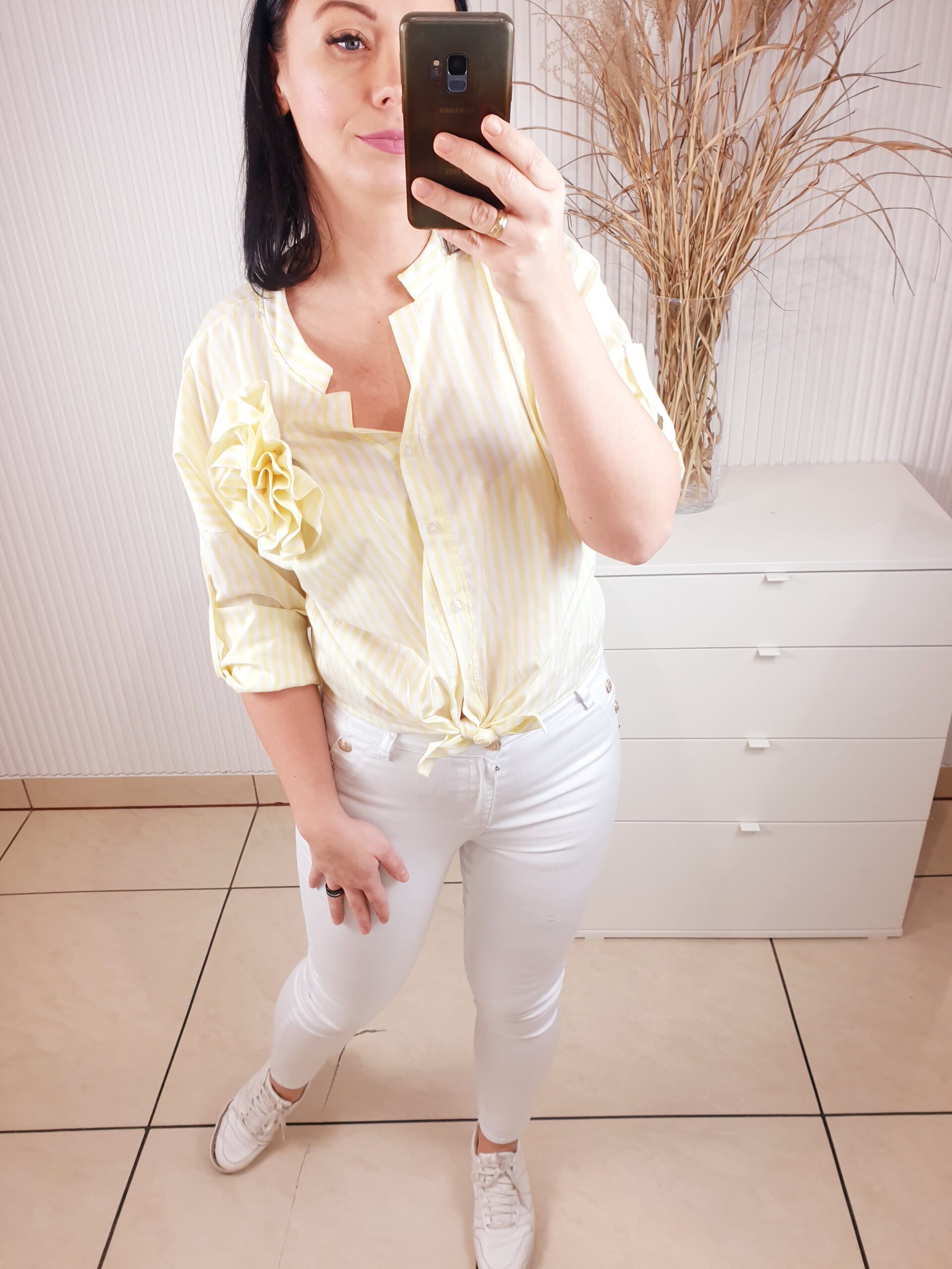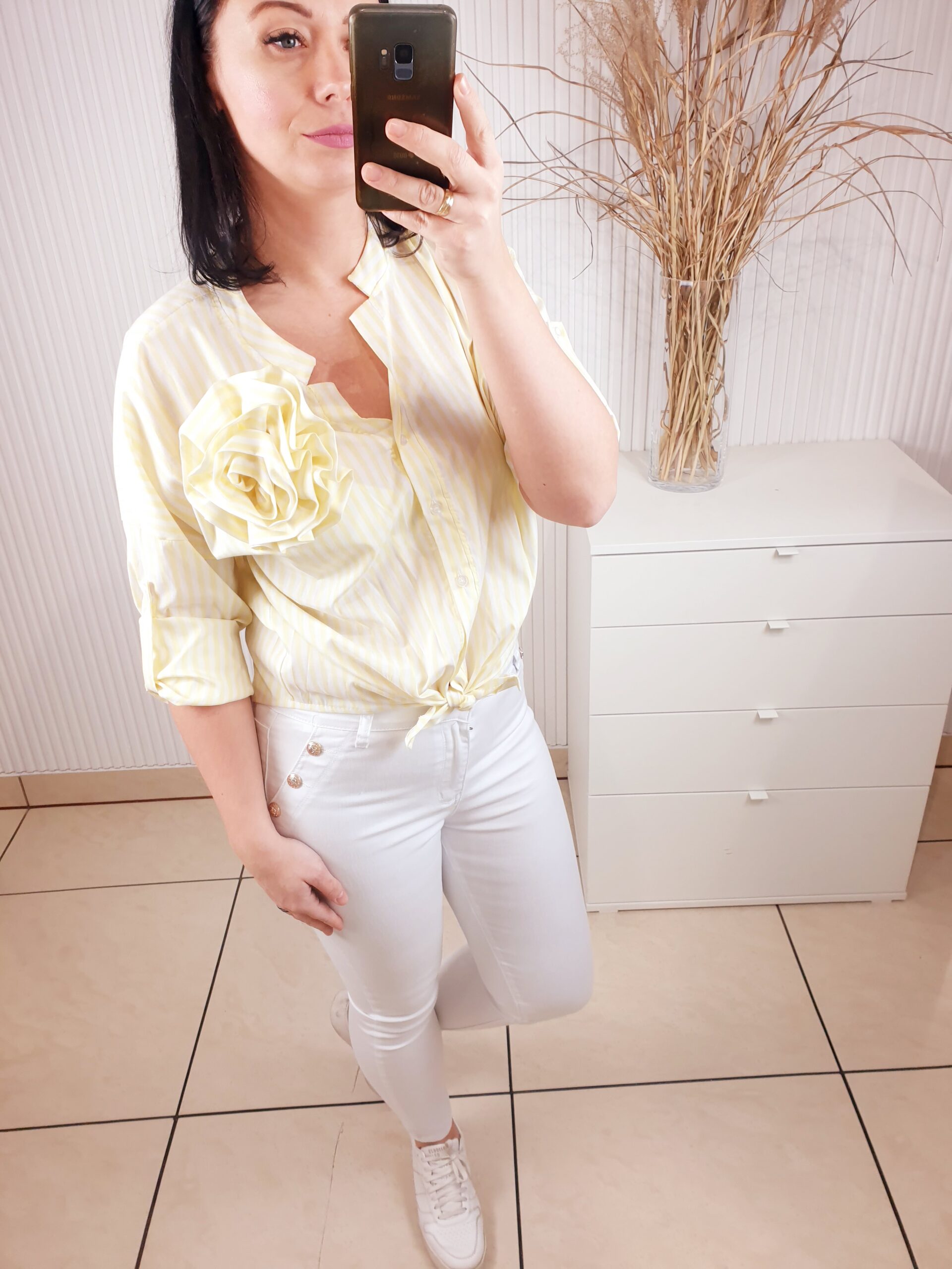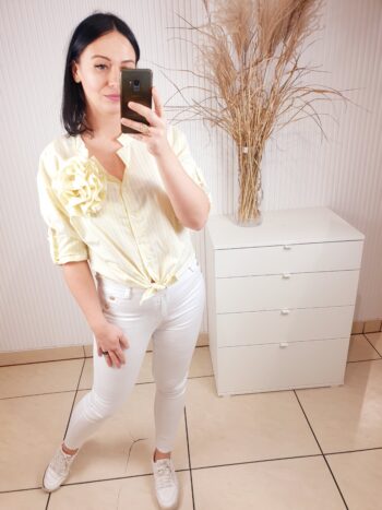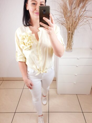 Koszula w paski zapinana na guziki ze stójką oraz z odpinaną różą wykonaną z tego samego materiału. Materiał w paseczki optycznie wyszczupli sylwetkę. Posiada długi rękaw, który możesz podwinąć i przypiąć. Idealna zarówno do sportowych stylizacji jak i tych bardziej eleganckich.