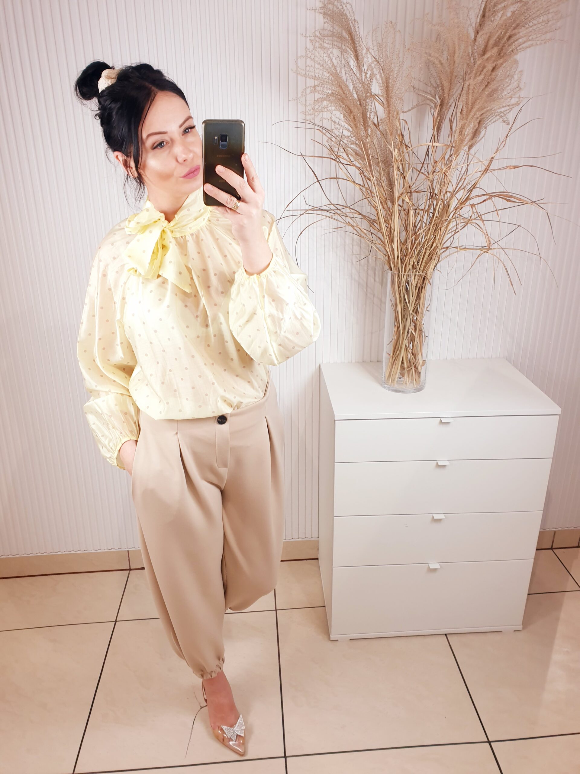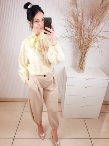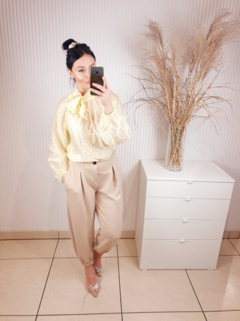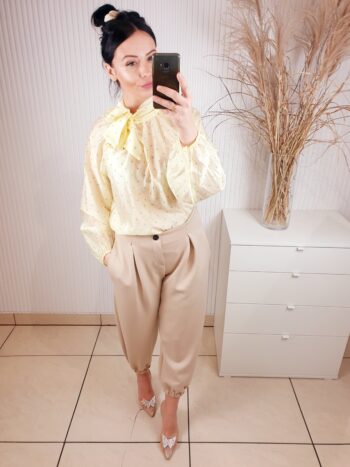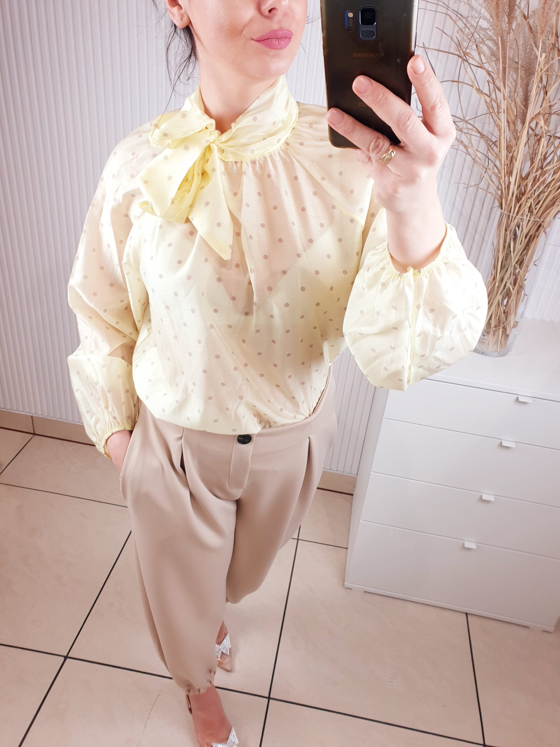 koszula, damska koszula w groszki, wiązana przy szyi, cytrynowa, długi rękaw