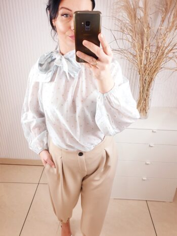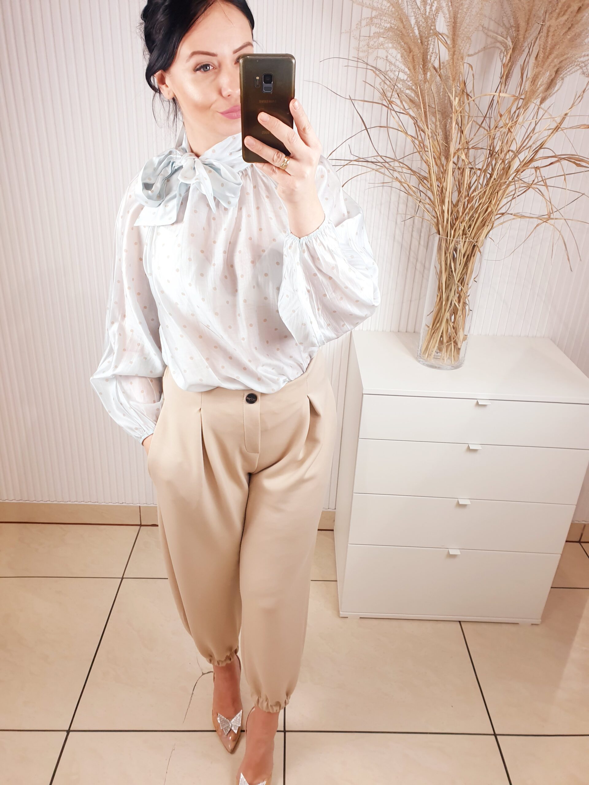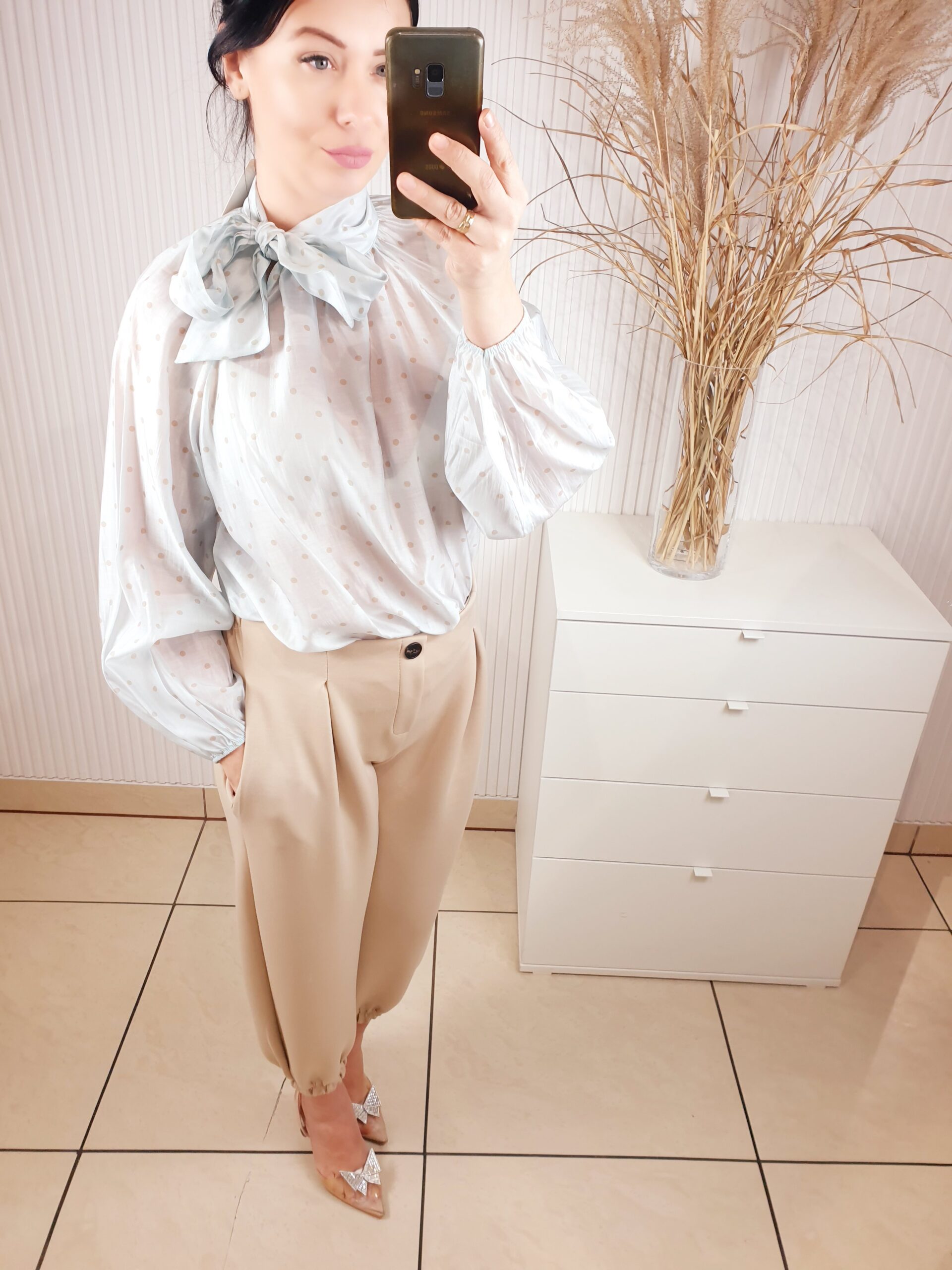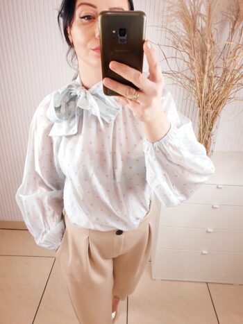 Koszula w groszki to stylowa propozycja dla kobiet, które lubią subtelne, a jednocześnie wyraziste detale. Przewiewna, wykonana z cienkiego materiału. Model wyróżnia się efektownym wiązaniem przy szyi, które dodaje całości elegancji i dziewczęcego uroku. Rękawy zakończone gumką.