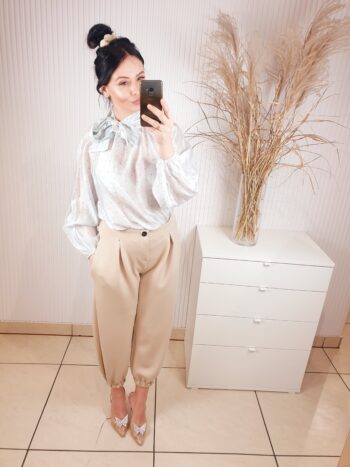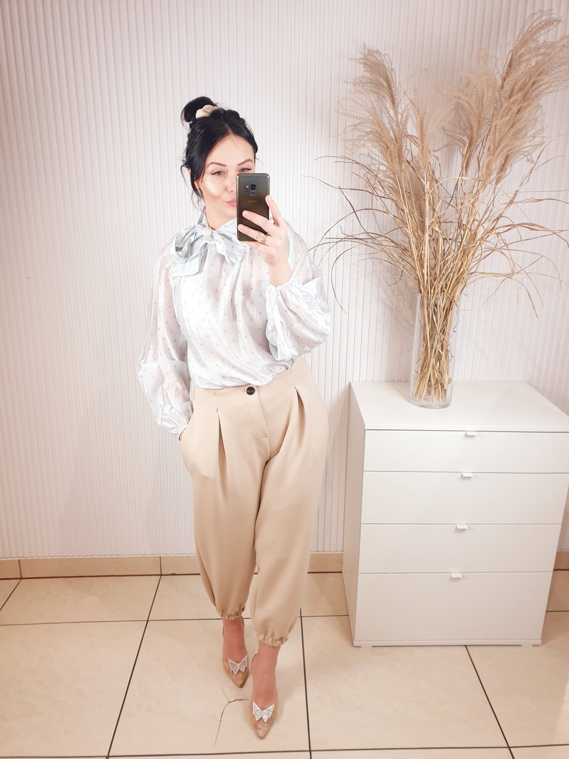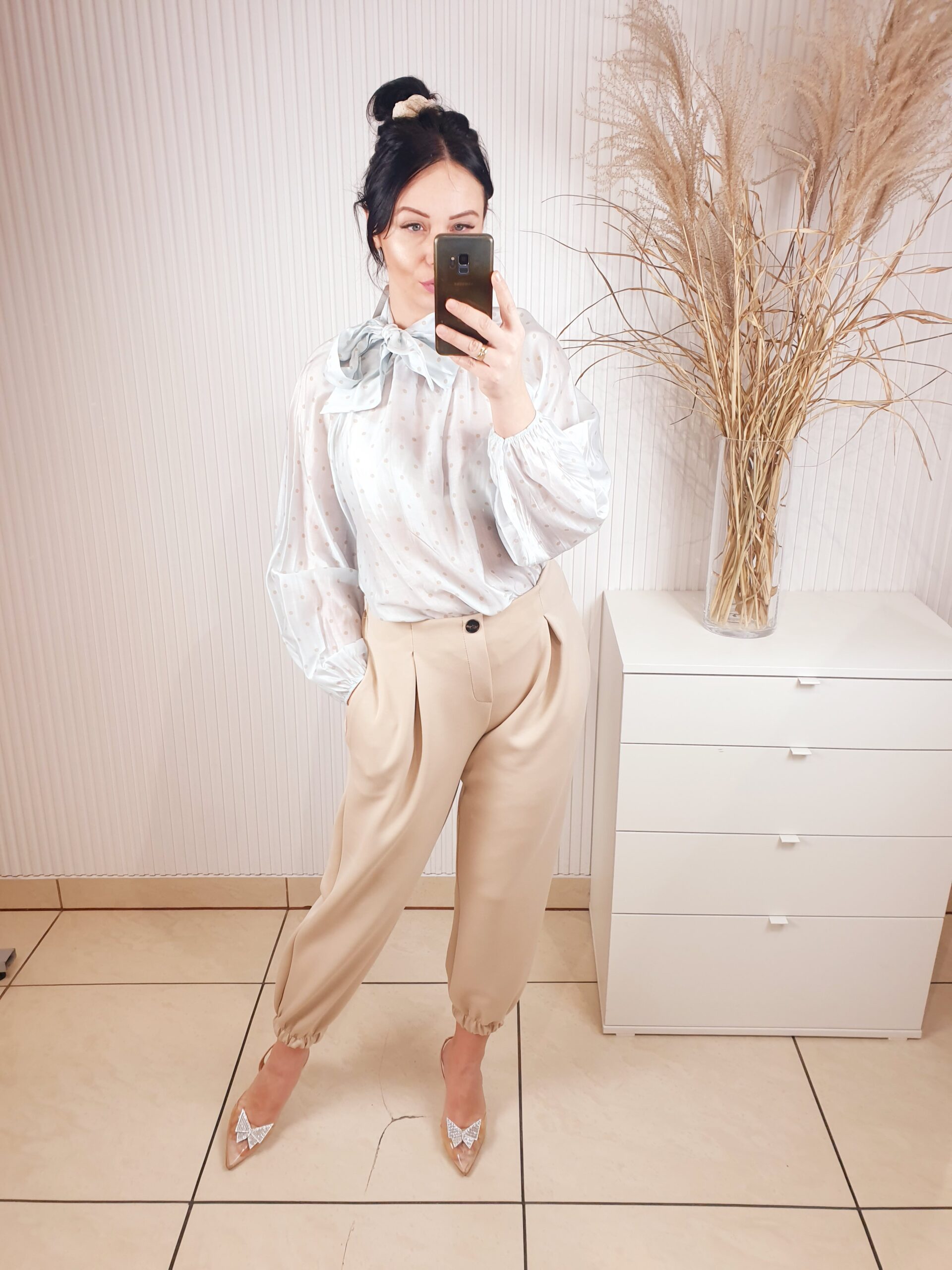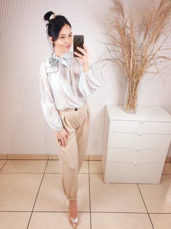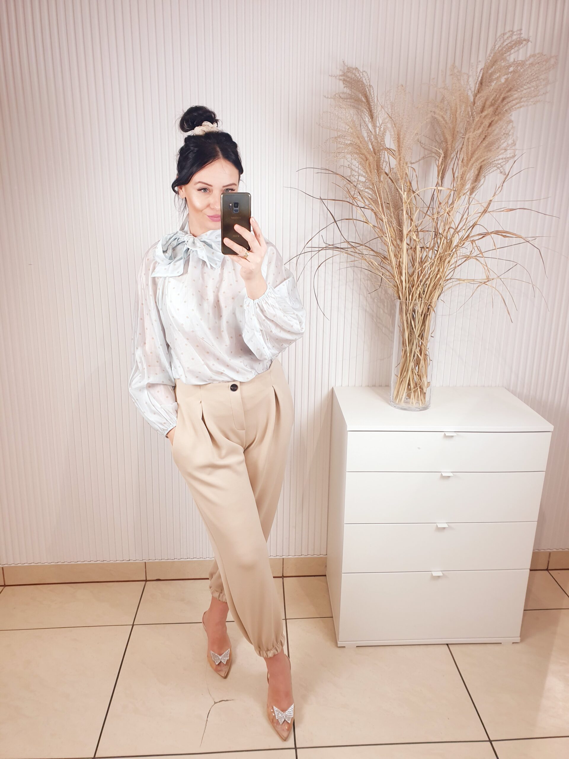 Koszula w groszki to stylowa propozycja dla kobiet, które lubią subtelne, a jednocześnie wyraziste detale. Przewiewna, wykonana z cienkiego materiału. Model wyróżnia się efektownym wiązaniem przy szyi, które dodaje całości elegancji i dziewczęcego uroku. Rękawy zakończone gumką.