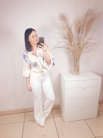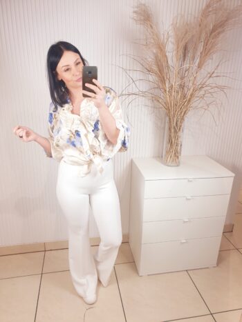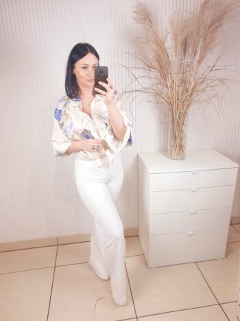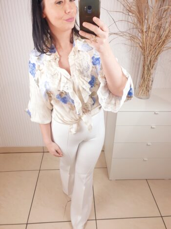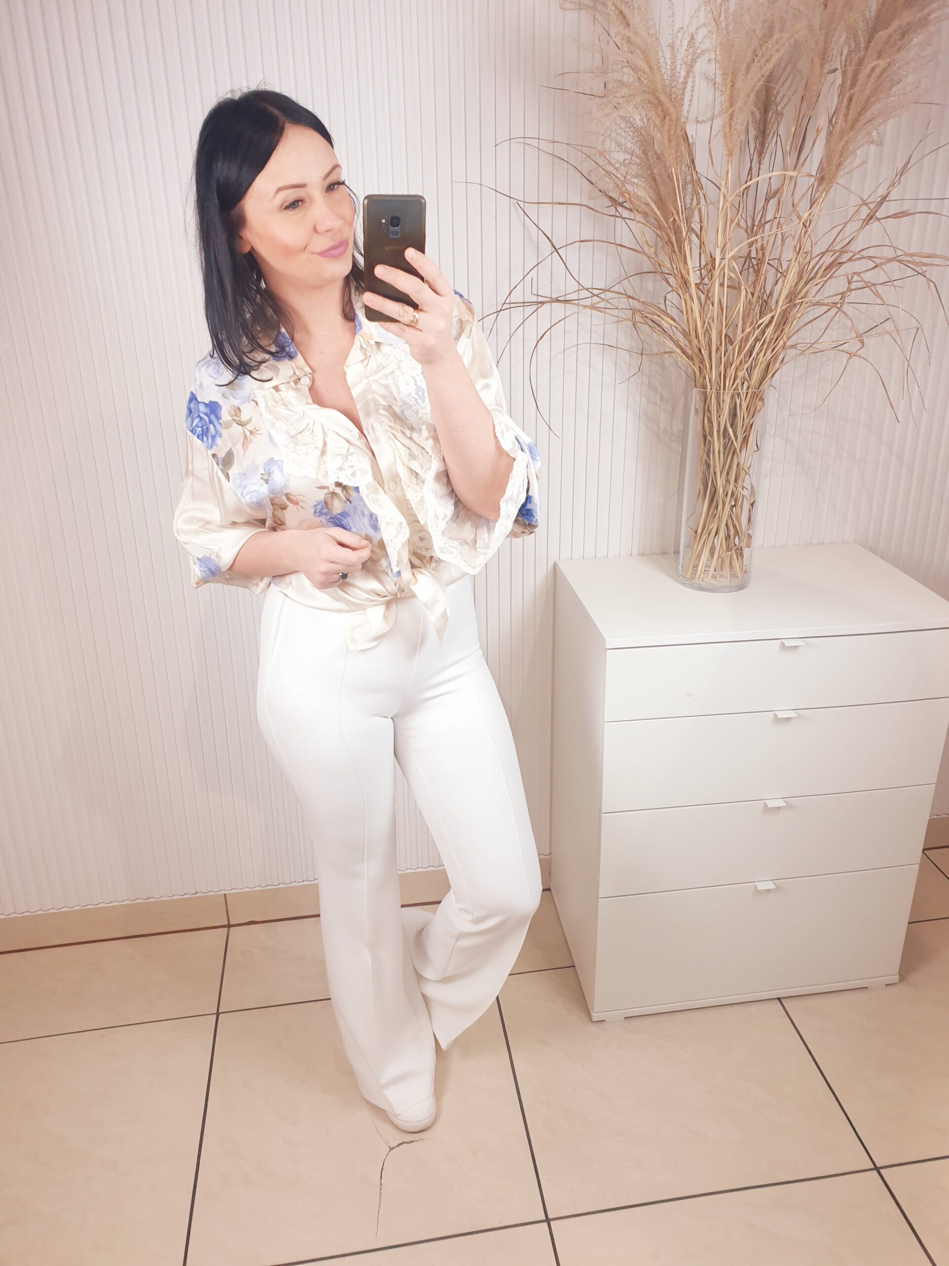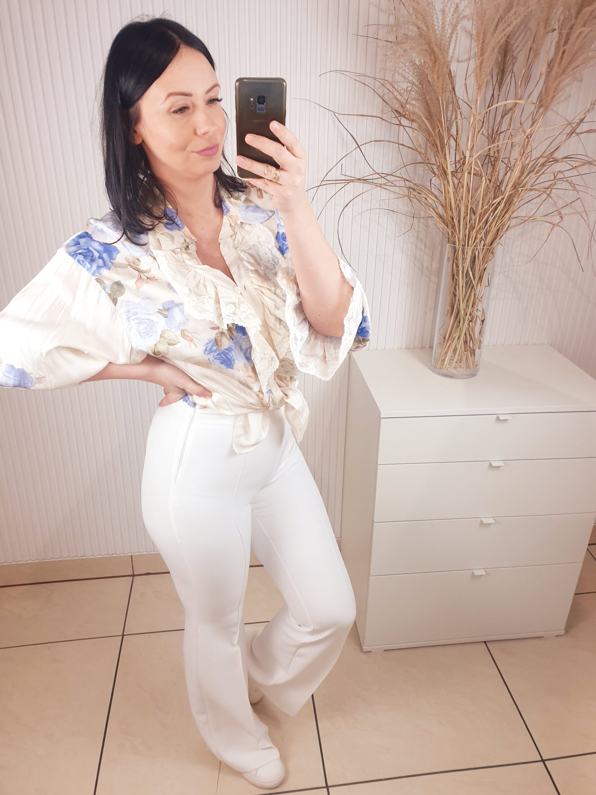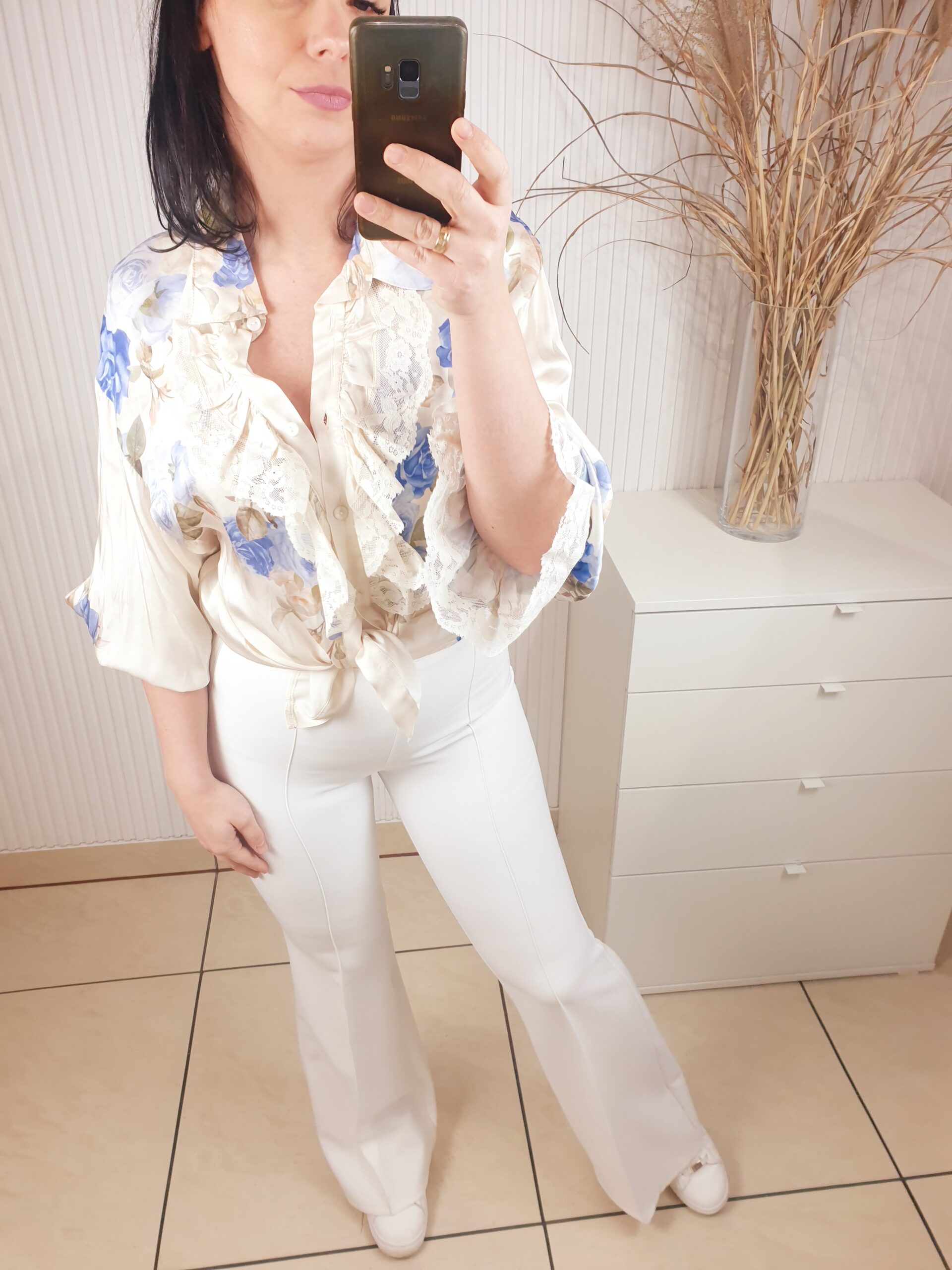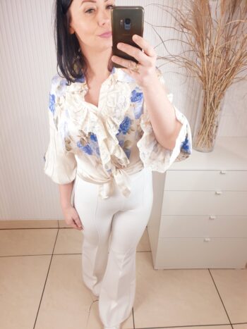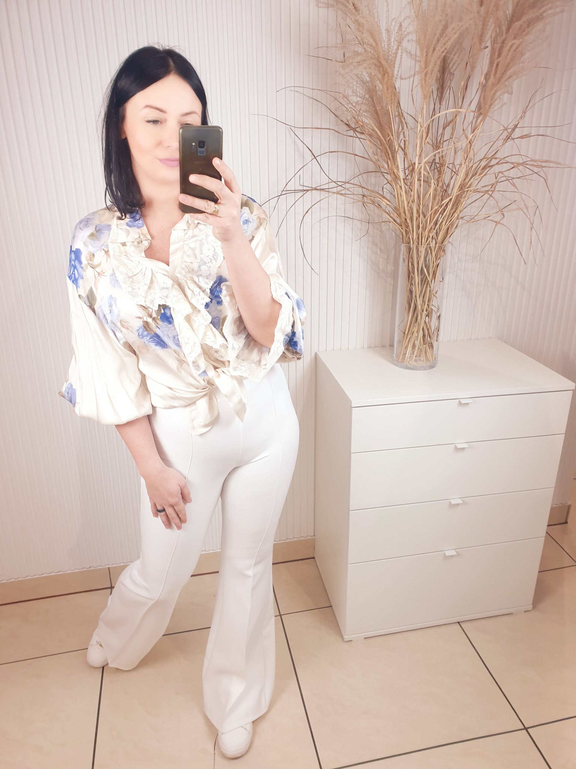 Cudowna koszula z kołnierzykiem, zapinana na guziki w przepiękny kwiatowy wzór. Z przodu posiada żabot wykończony koronką. O oversizowym fasonie, z długim rękawem. Wykonana z przyjemnego materiału-100% wiskozy. Idealna zarówno na co dzień, do pracy jak i na bardziej eleganckie wyjścia.