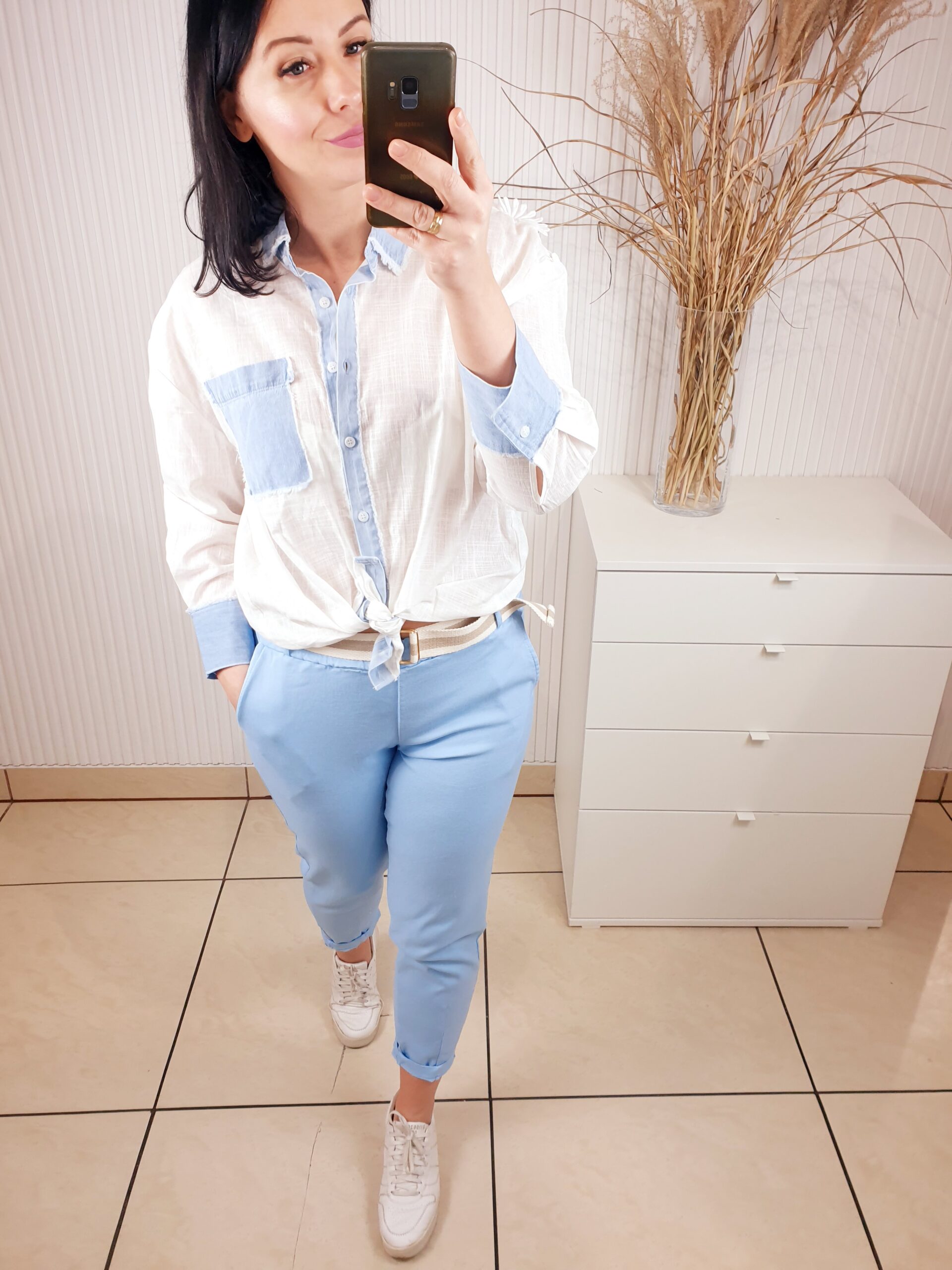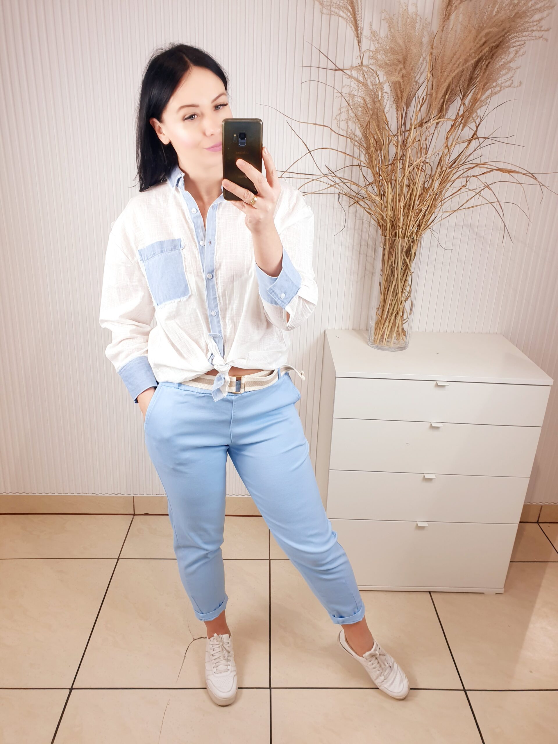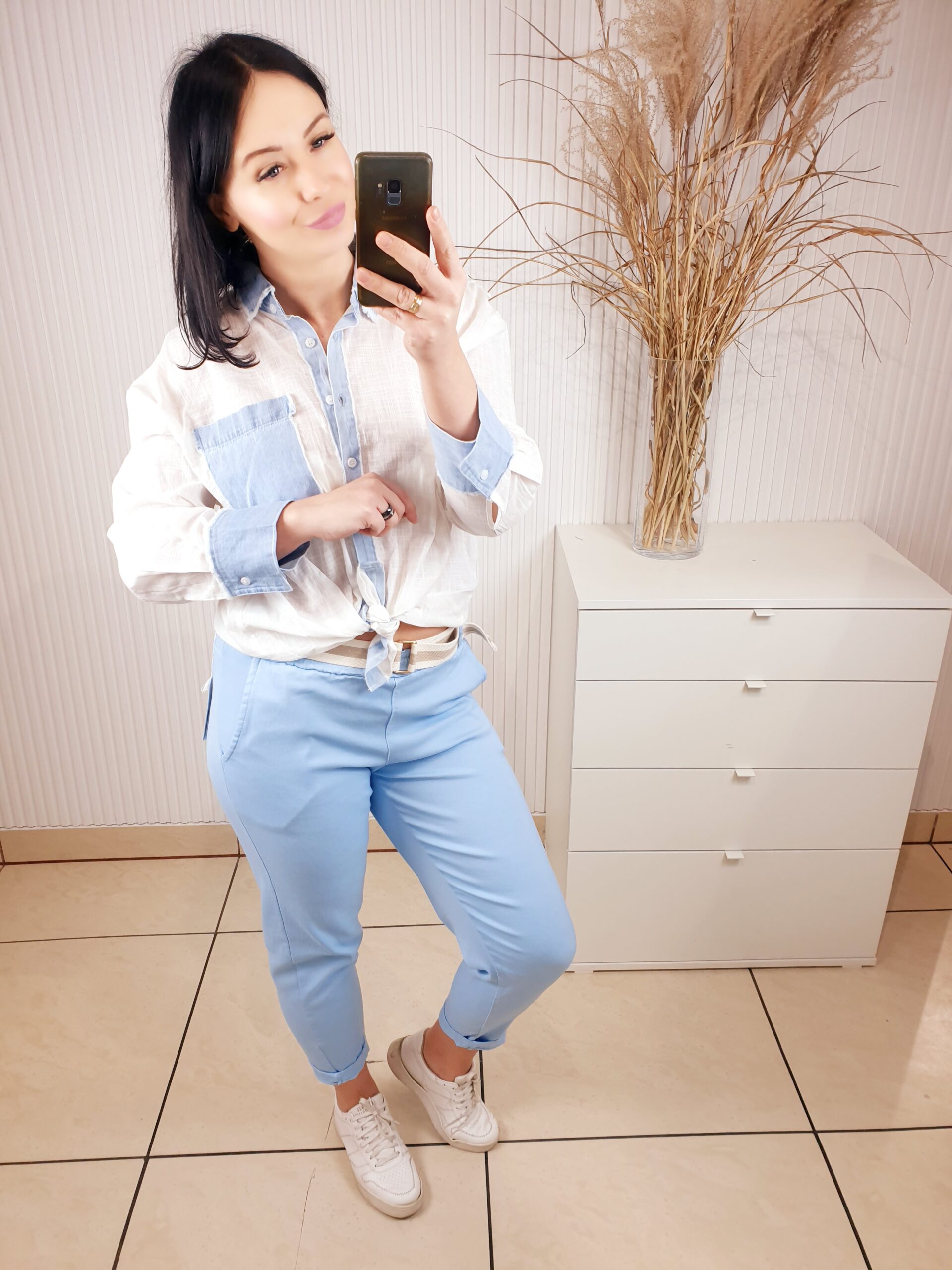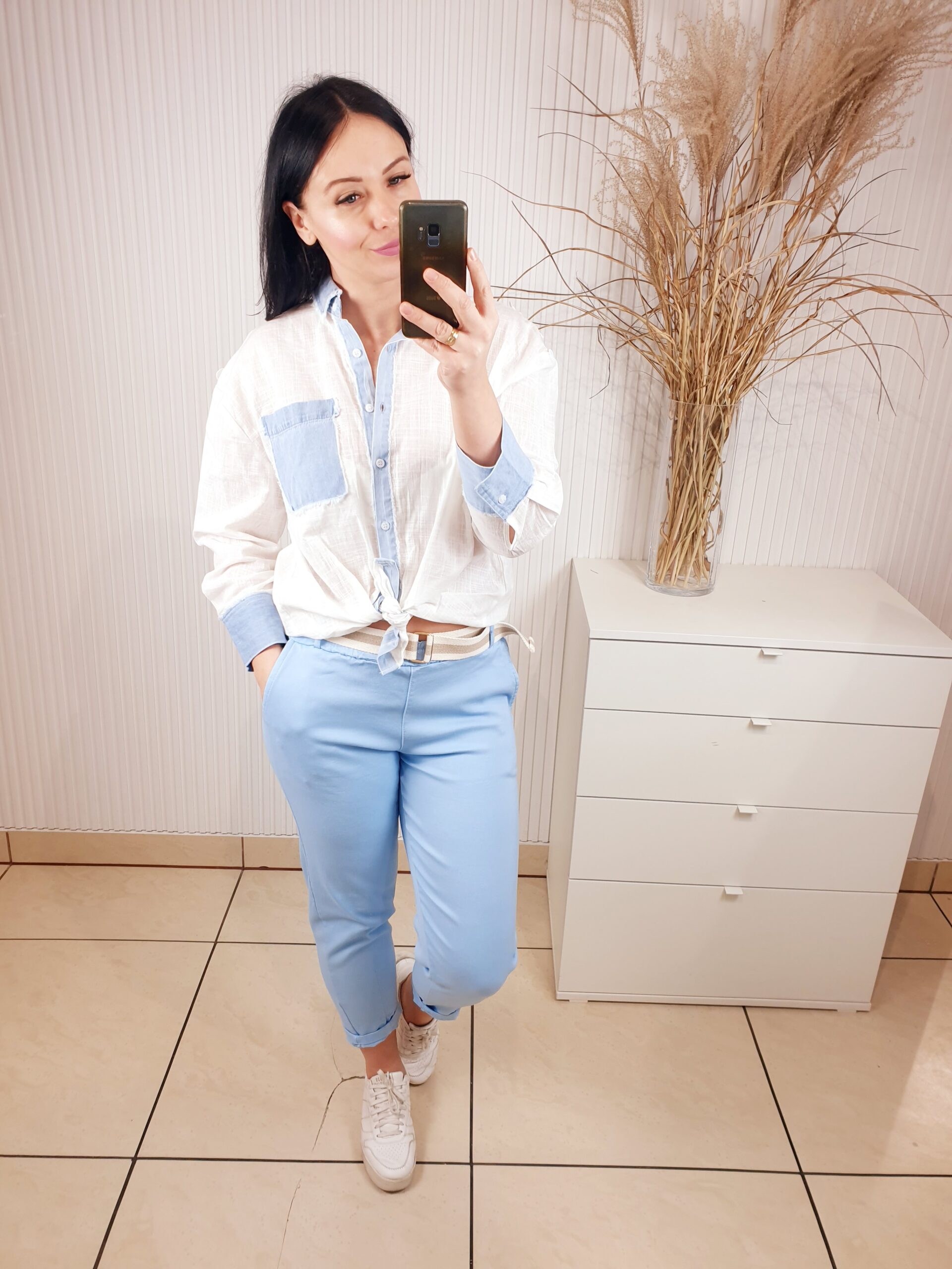 Koszula z jeansowymi akcentami to totalny hit tegorocznego sezonu wiosenno-letniego. Połączenie dwóch materiałów sprawia że jest nietuzinkowa i oryginalna. Z tyłu posiada ażurowe wykończenie w kwiaty, natomiast z przodu kieszonkę oraz kołnierzyk wykończone materiałem typu jeans.