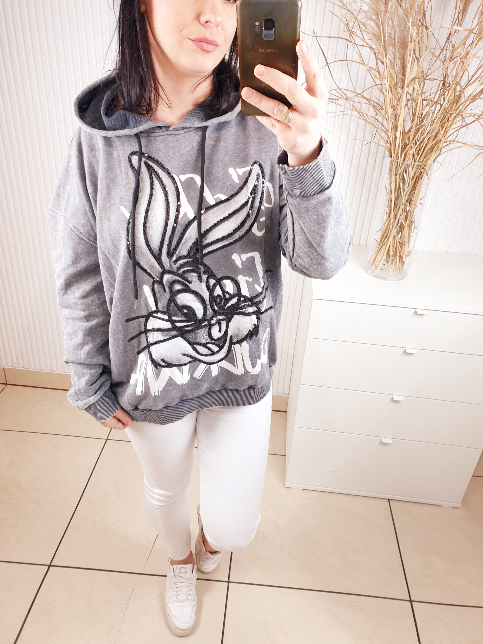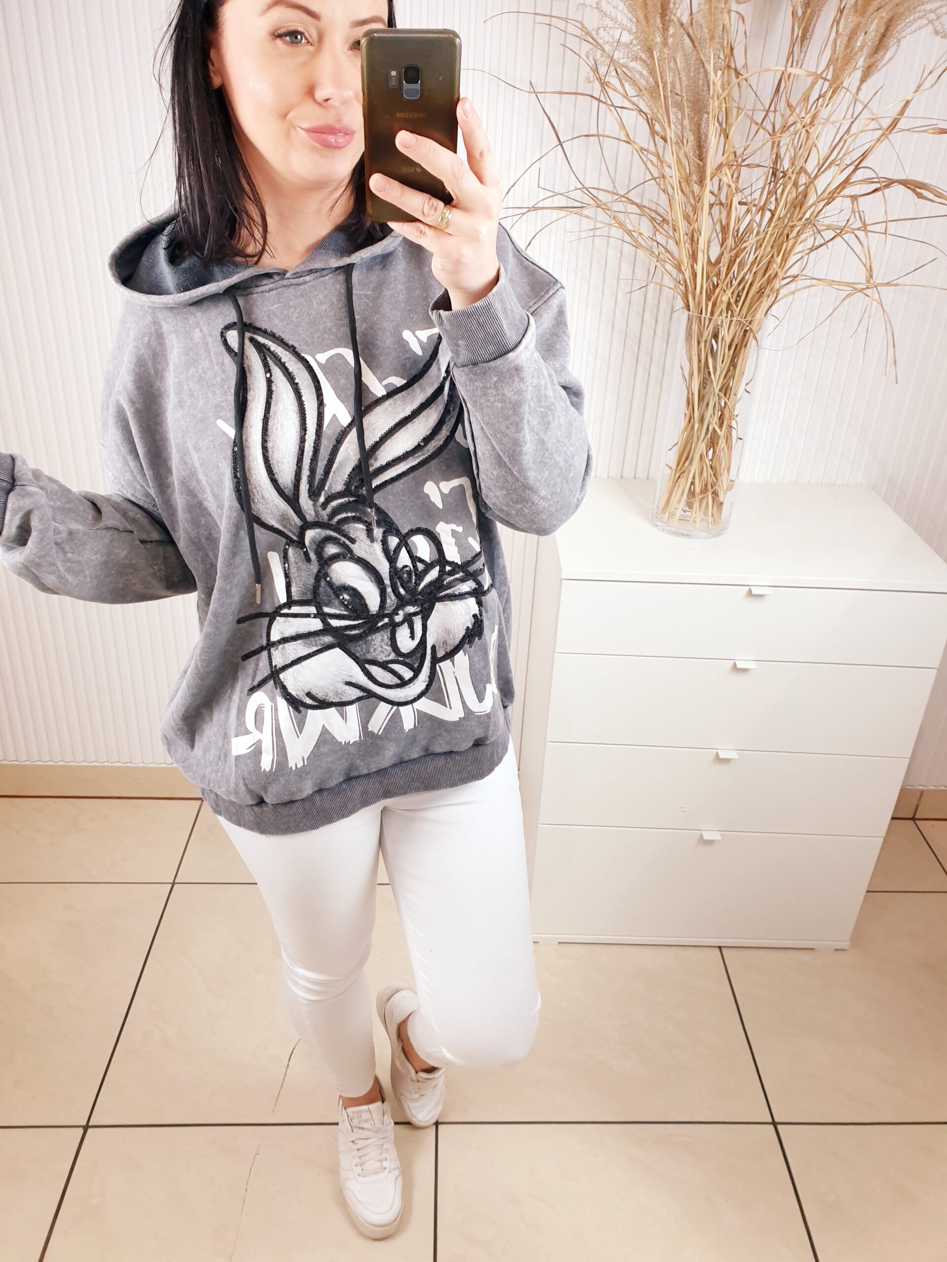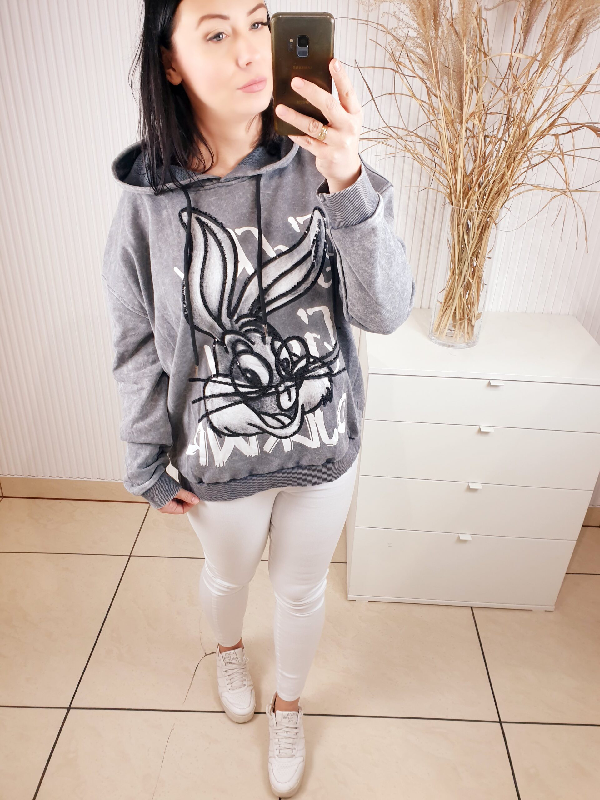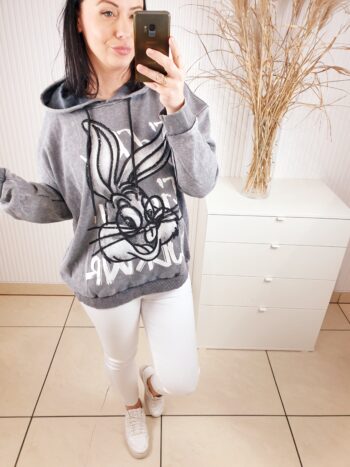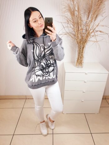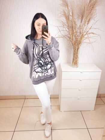 Bluza z kapturem wykonana z dekatyzowanego materiału. Posiada błyszczącą aplikację na przodzie- królika. Bardzo wygodna i komfortowa w noszeniu, a jednocześnie oryginalna i nietuzinkowa.