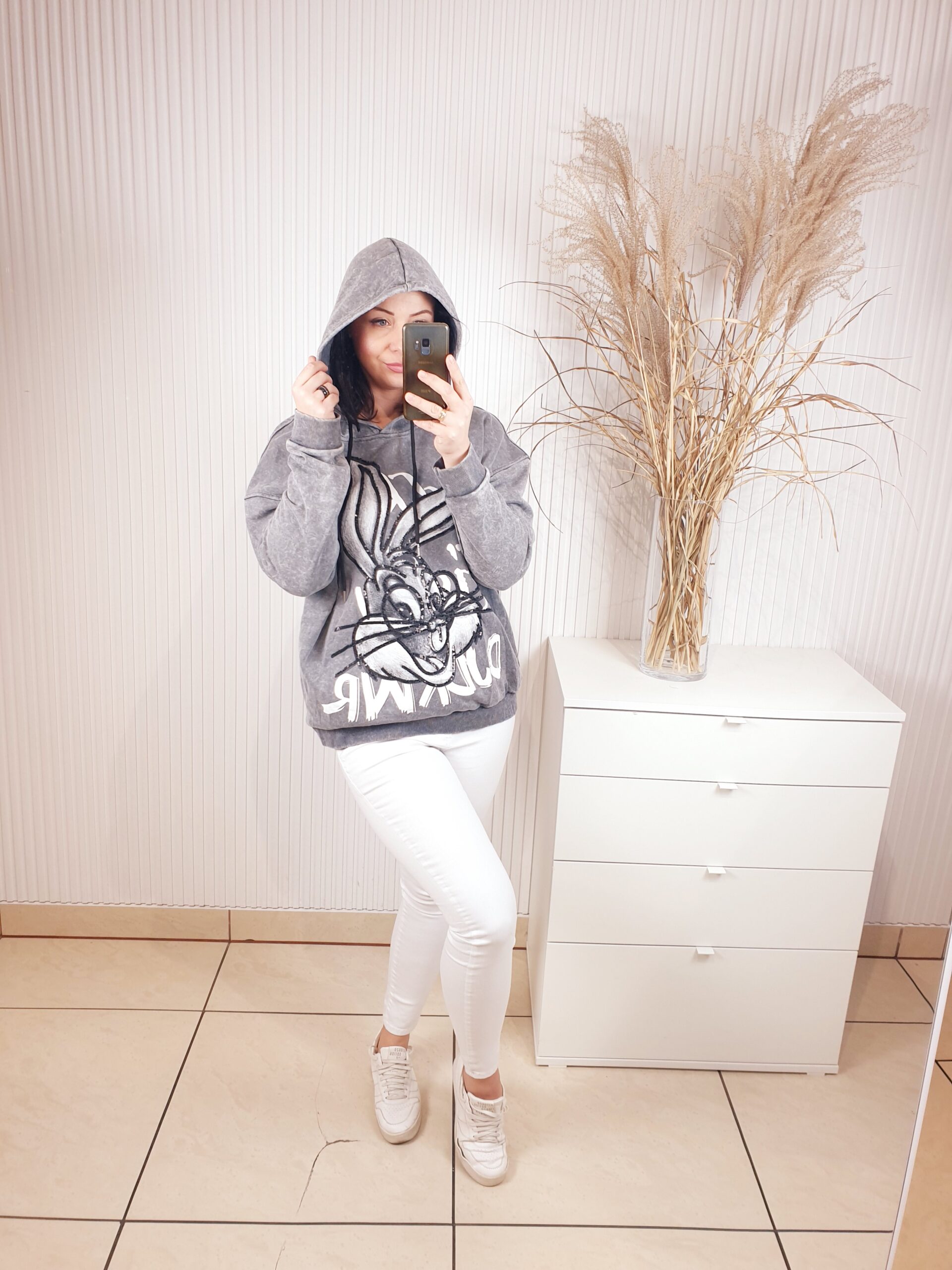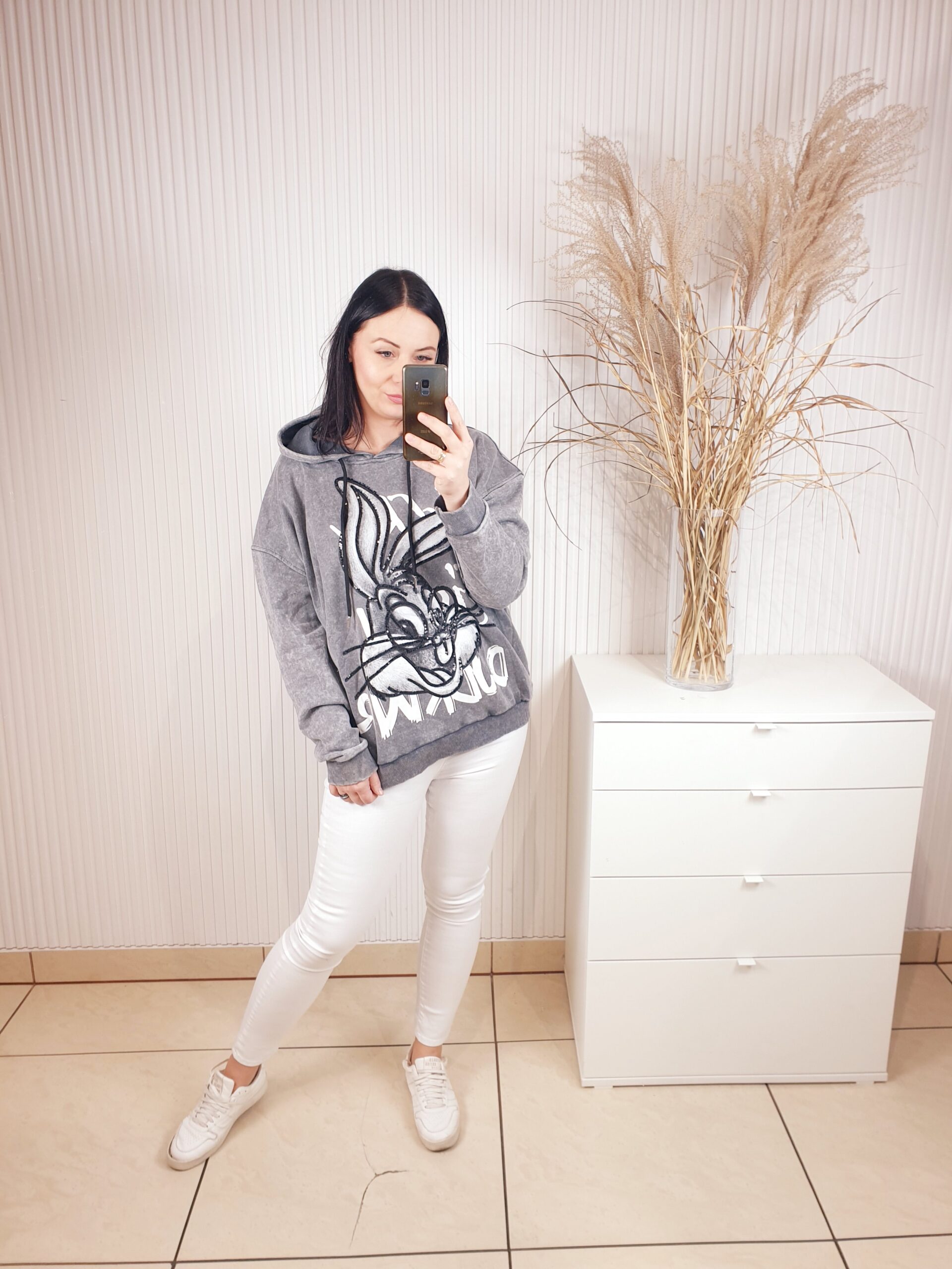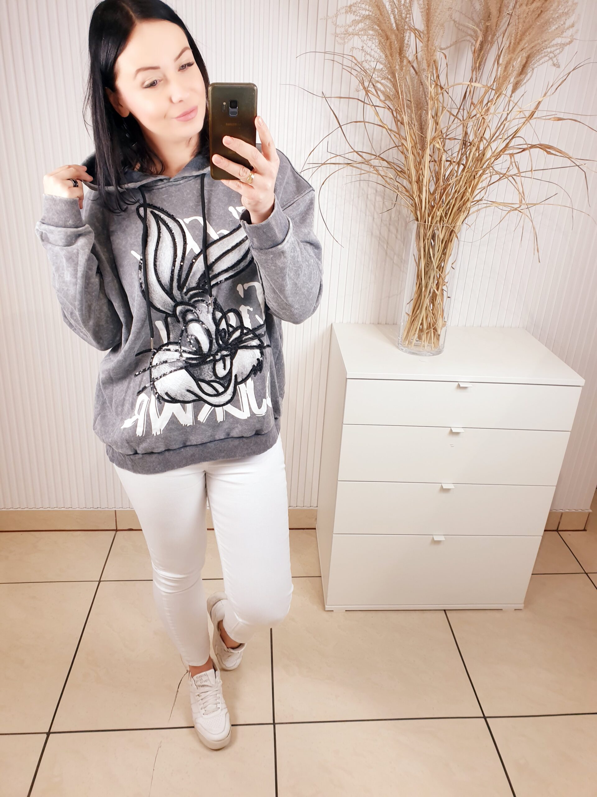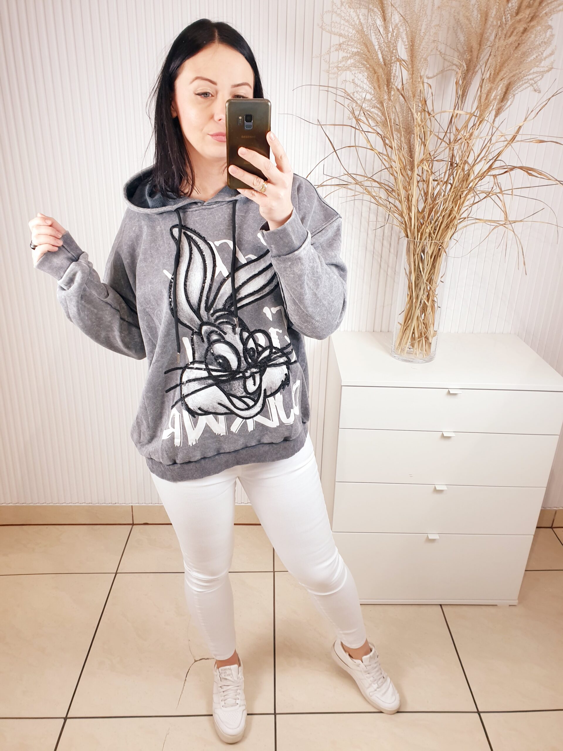Bluza z kapturem wykonana z dekatyzowanego materiału. Posiada błyszczącą aplikację na przodzie- królika. Bardzo wygodna i komfortowa w noszeniu, a jednocześnie oryginalna i nietuzinkowa.