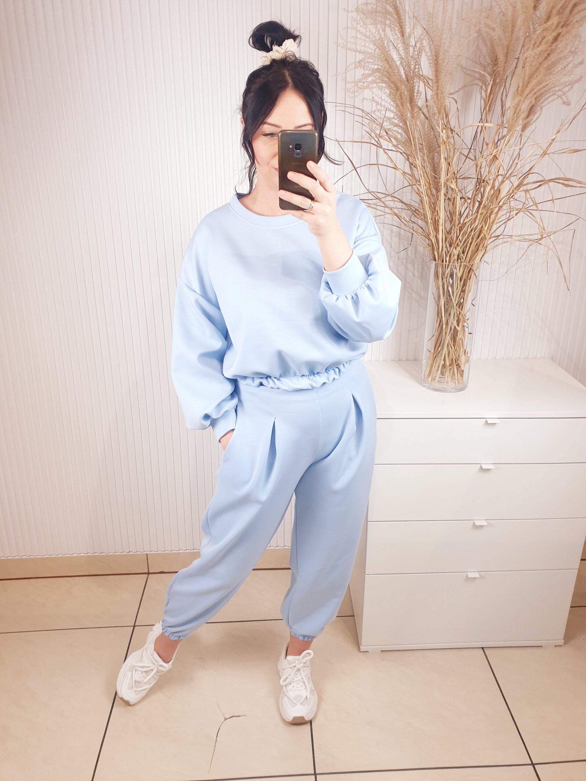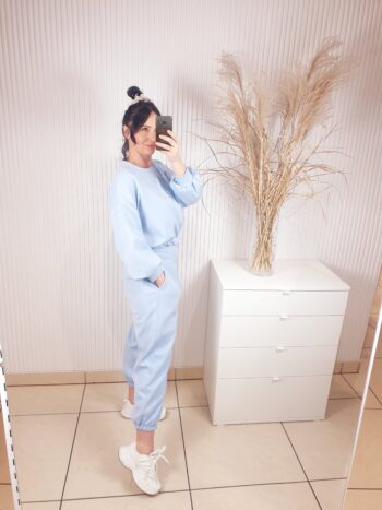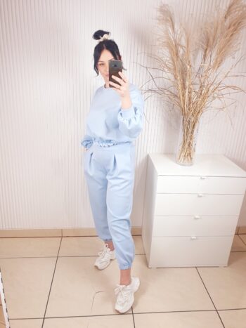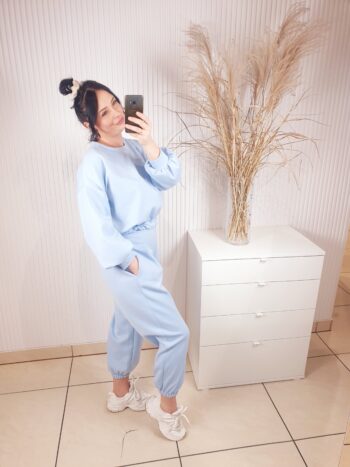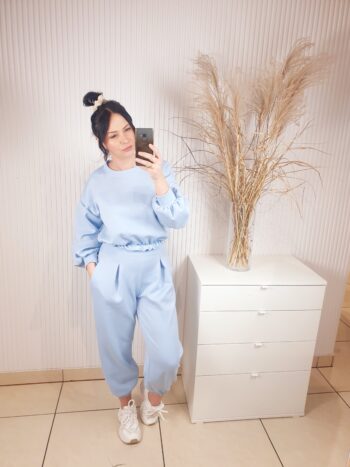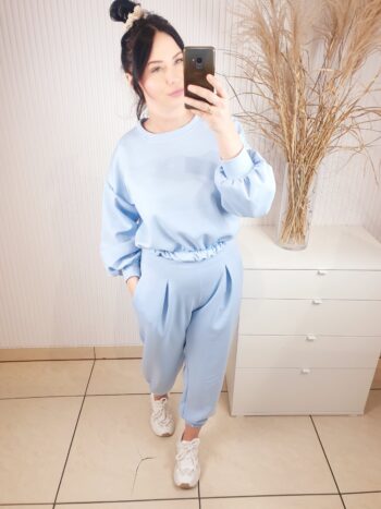 Stylowy komplet dresowy w modnym odcieniu blue, wykonany z przyjemnego w dotyku materiału. Overisezowa bluza z elastycznym wykończeniem oraz spodnie z wysokim stanem tworzą wygodny kobiecy zestaw. Idealny na co dzień, na miasto i w stylu homewear premium.