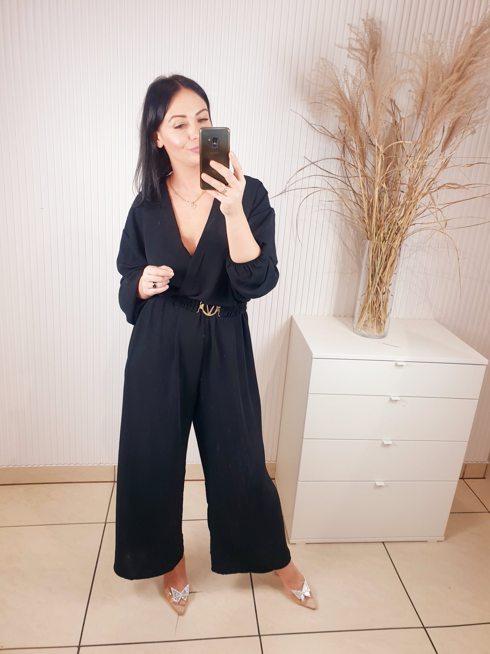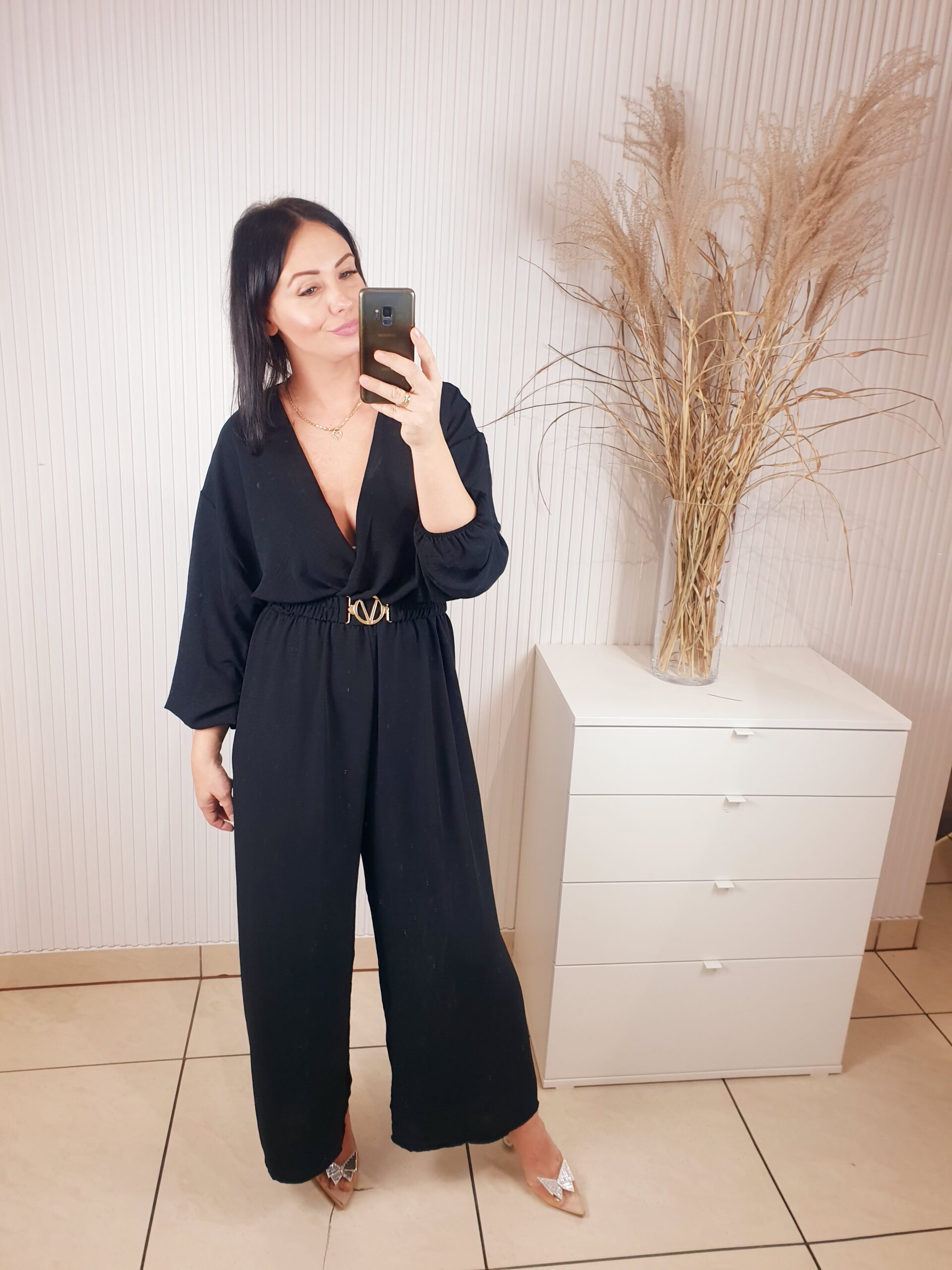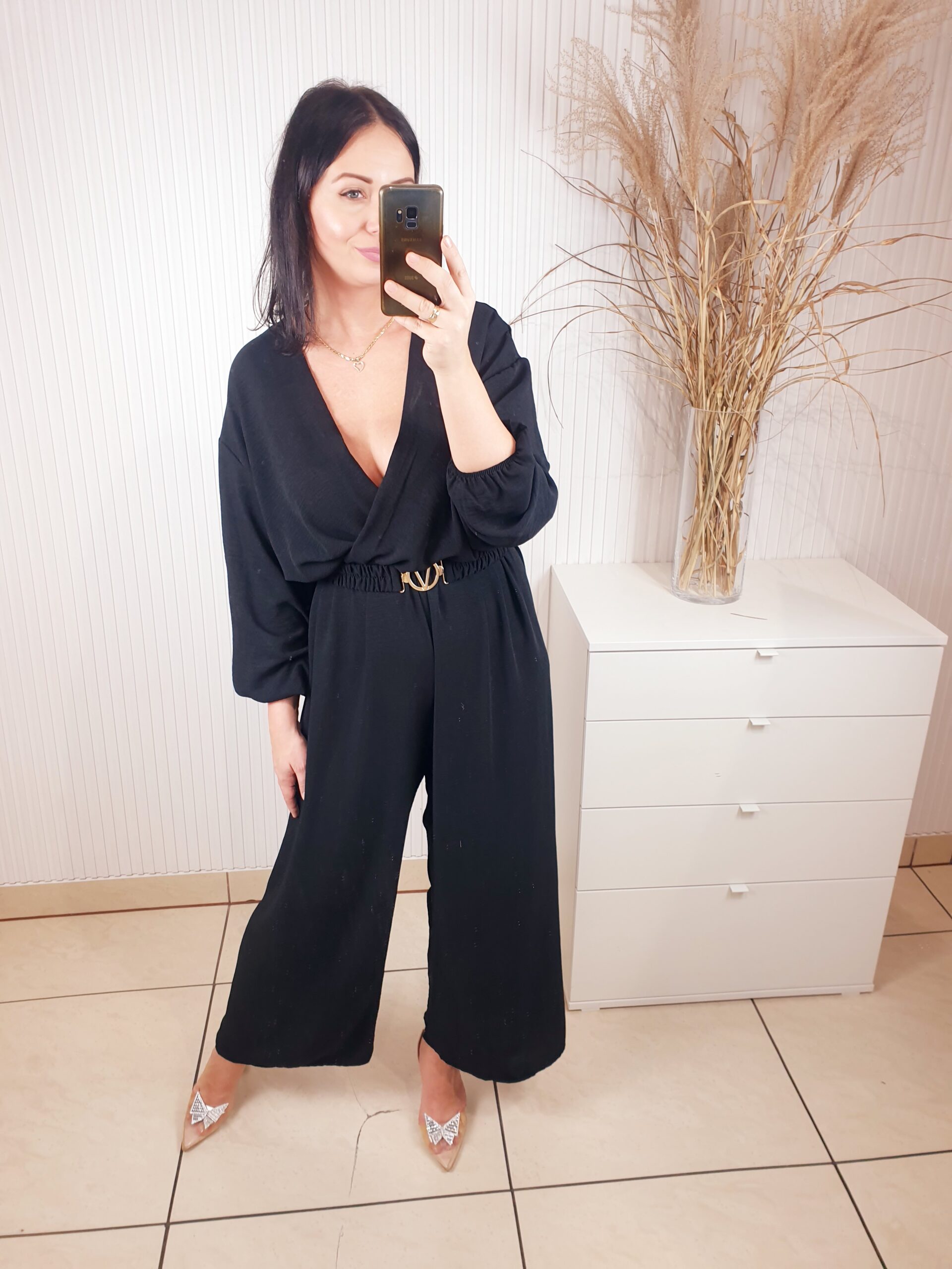 Kobiecy kombinezon z kopertowym dekoltem, długim rękawem i paskiem ze złotą klamrą. Wykonany z lekkiego materiału. Posiada prostą, szeroką nogawkę. Idealny na wyjątkowe okazje, bardzo elegancki i nietuzinkowy- przykuje uwagę innych osób. Rozmiar uniwersalny, większy standard- idealny na większe rozmiary od L do XXL.