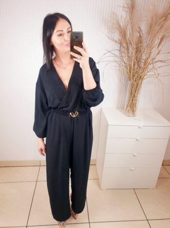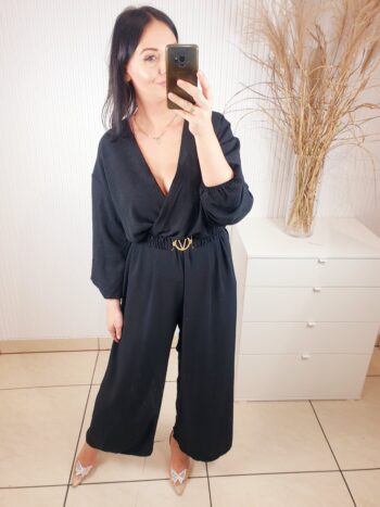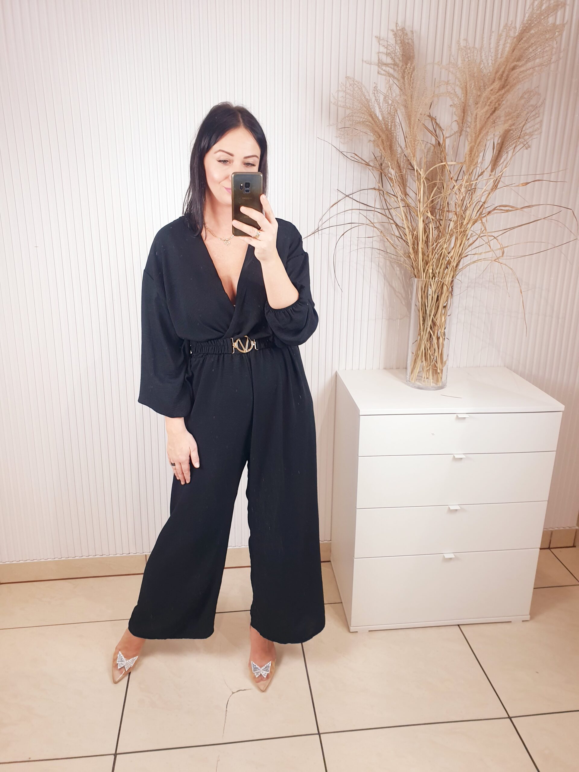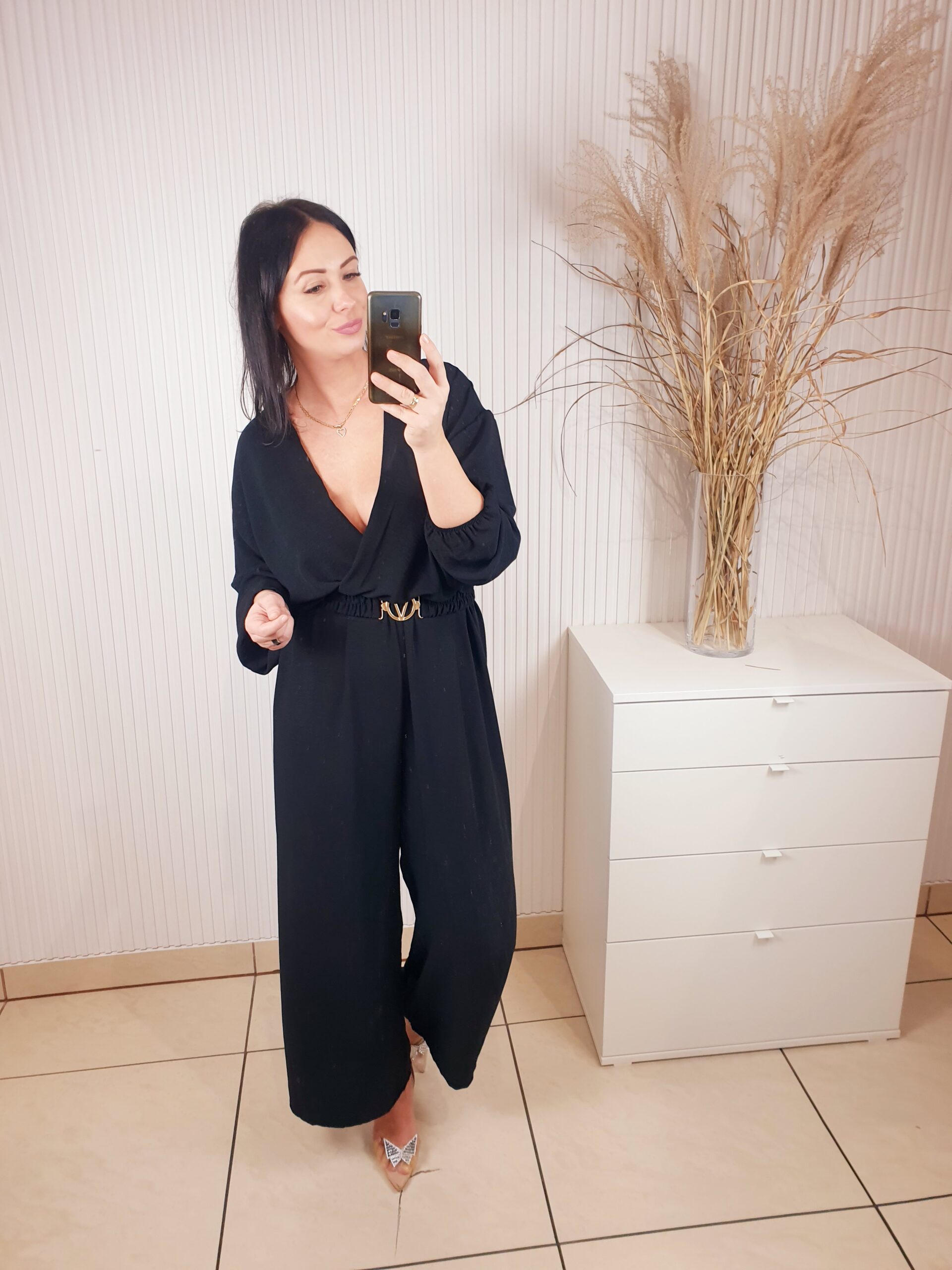 Kobiecy kombinezon z kopertowym dekoltem, długim rękawem i paskiem ze złotą klamrą. Wykonany z lekkiego materiału. Posiada prostą, szeroką nogawkę. Idealny na wyjątkowe okazje, bardzo elegancki i nietuzinkowy- przykuje uwagę innych osób. Rozmiar uniwersalny, większy standard- idealny na większe rozmiary od L do XXL.