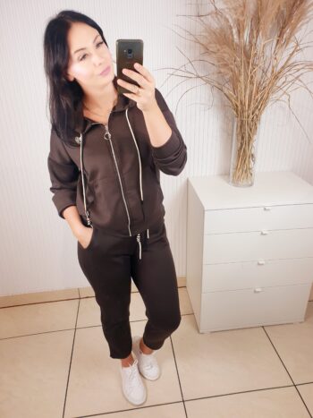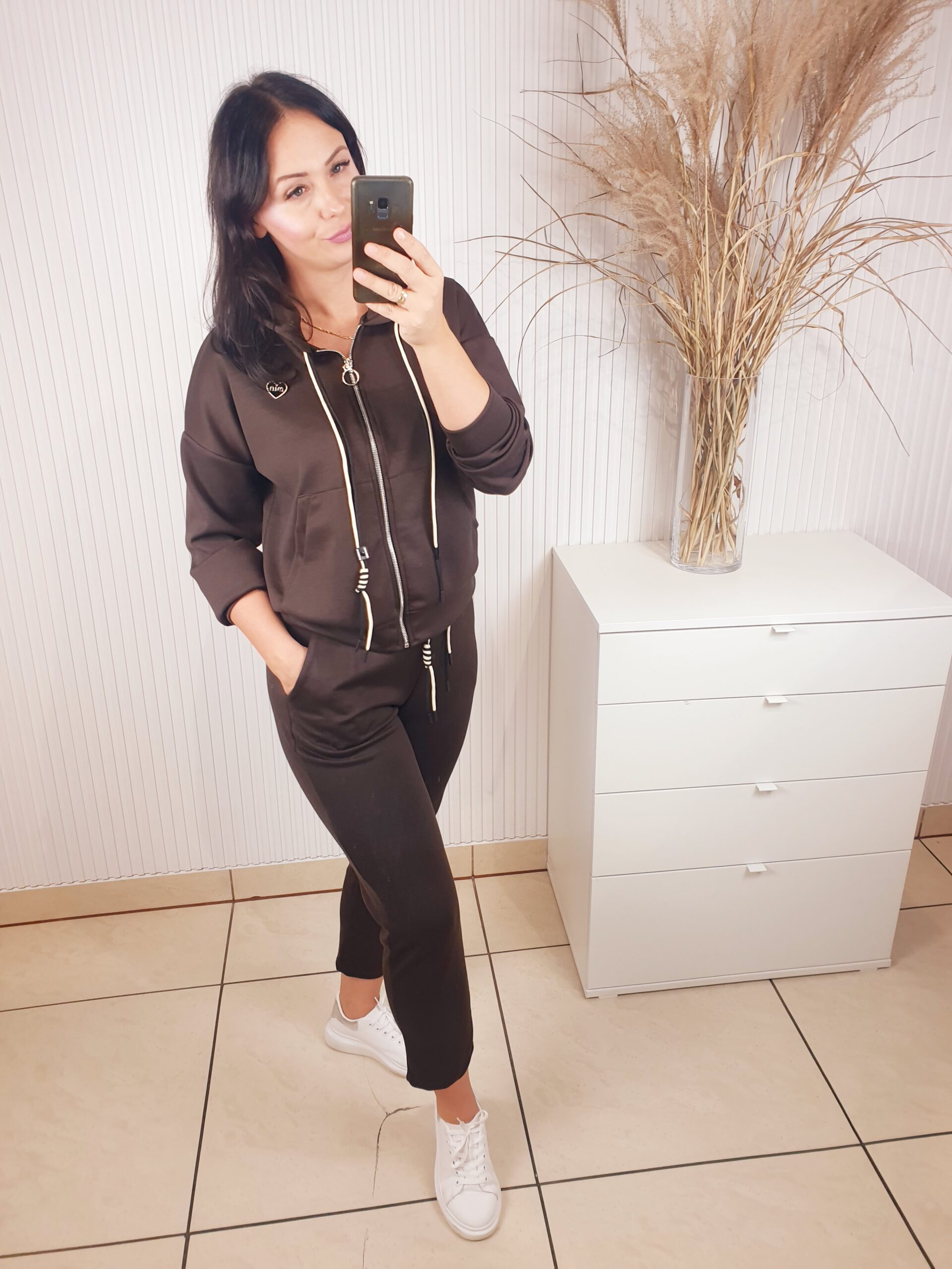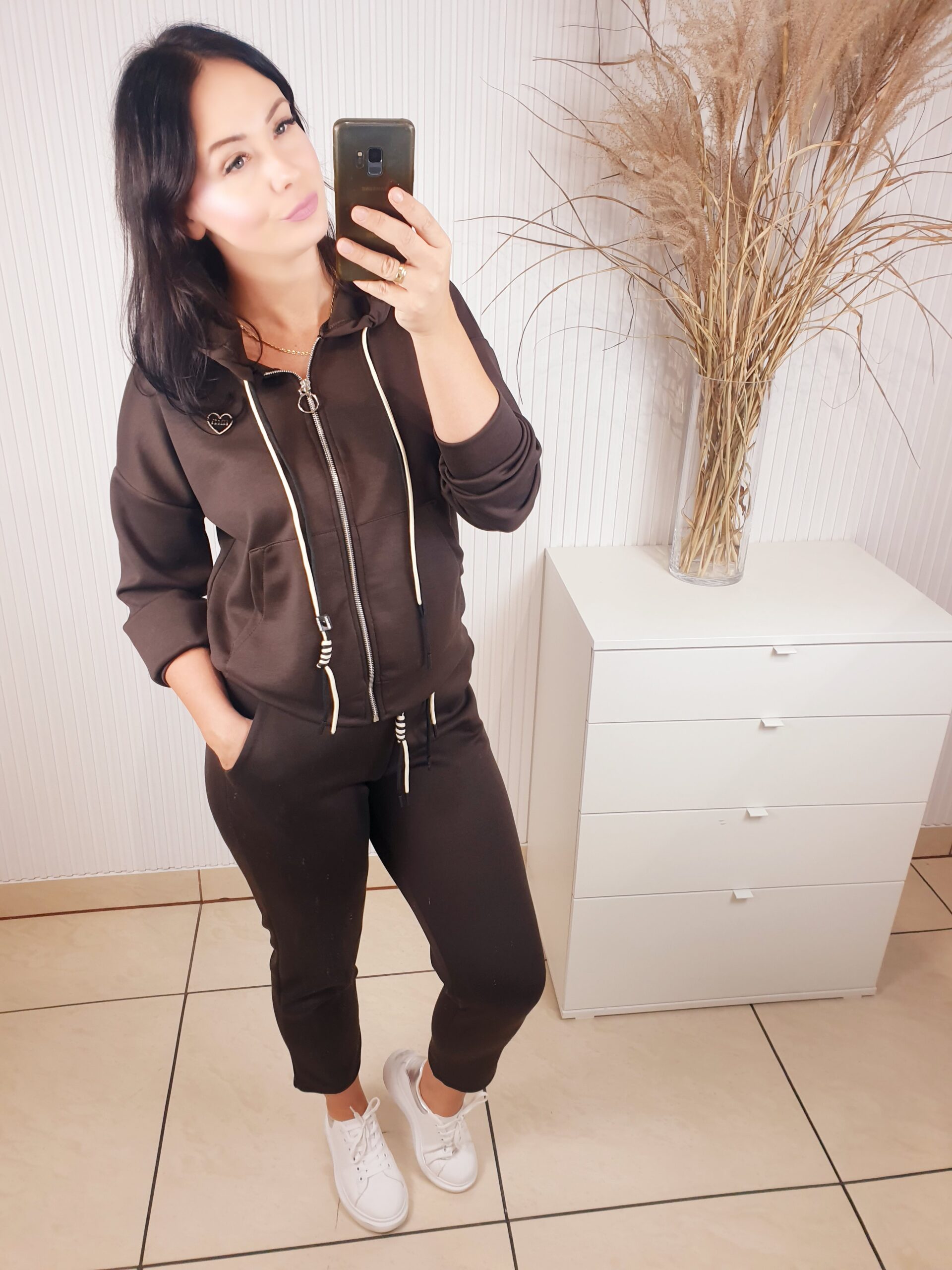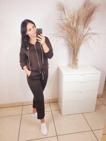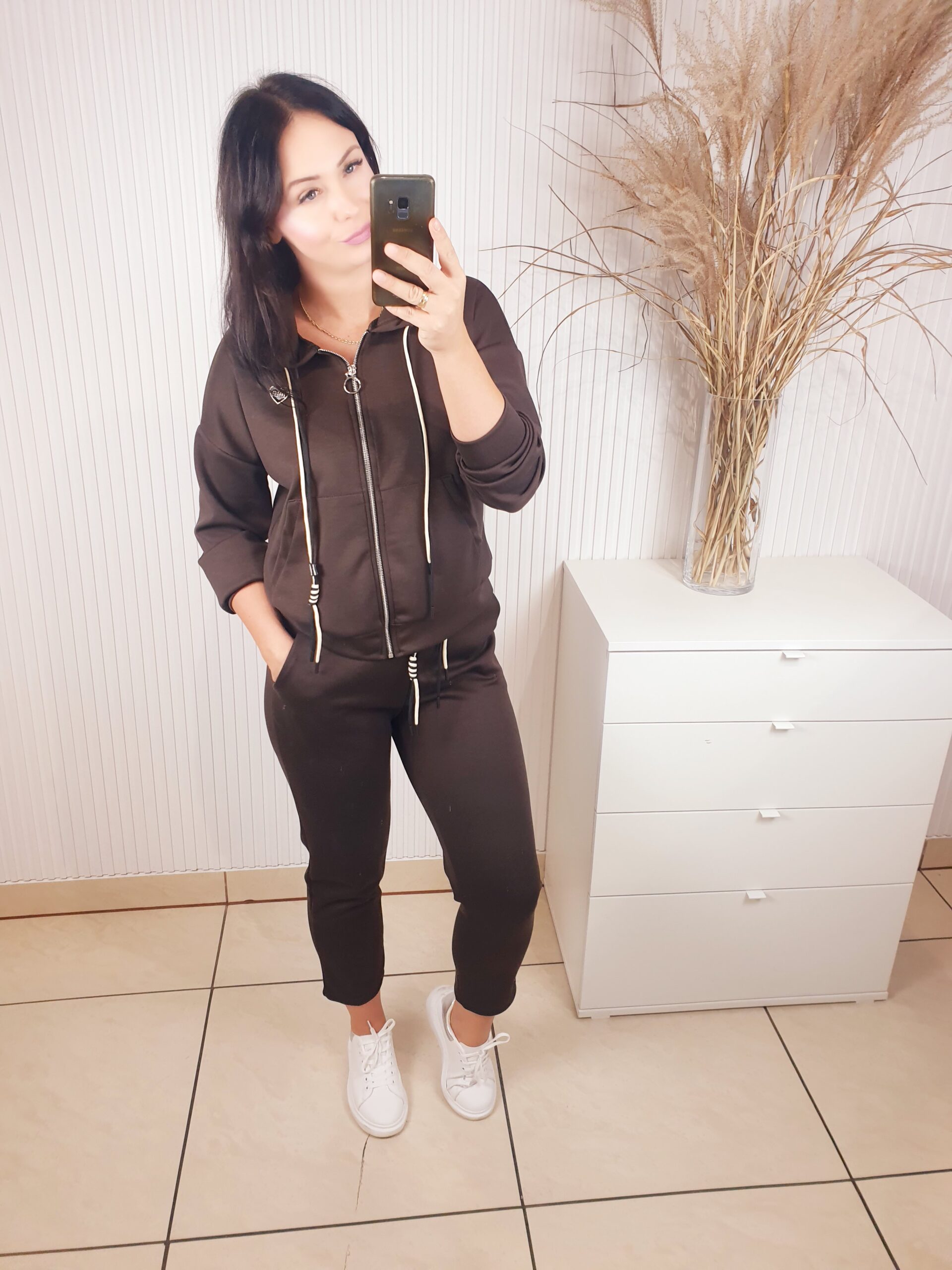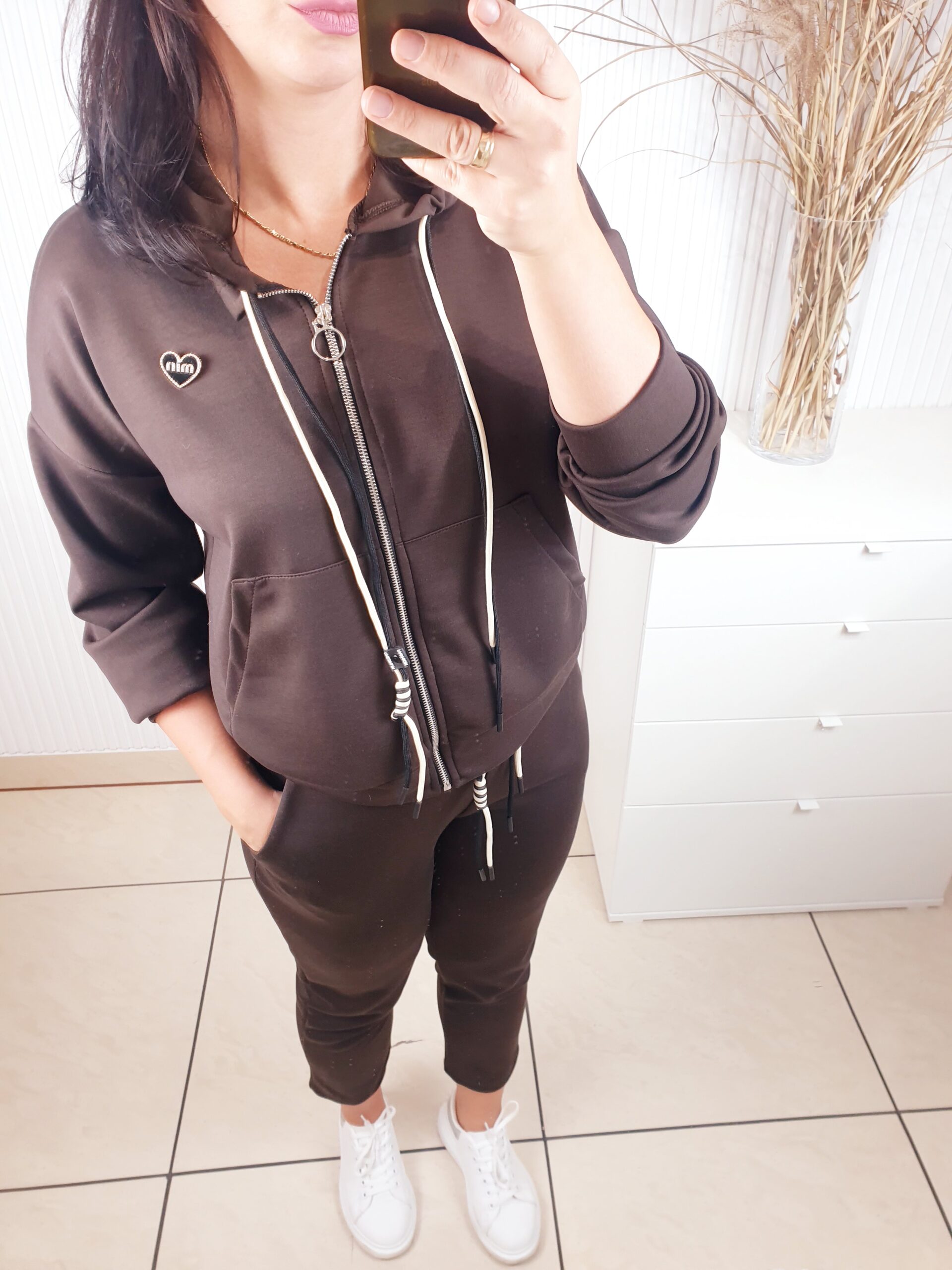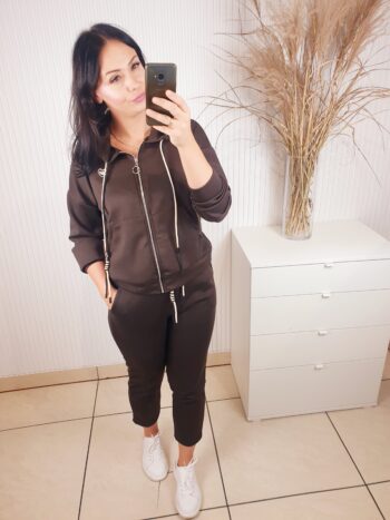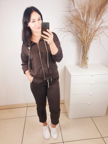 Cudowny komplet składający się z bluzy zapinanej na zamek i spodni o luźniejszym kroju. Całość wykonana z materiału typu masełko- bardzo lekkiego i przyjemnego w dotyku. Spodnie posiadają gumkę w pasie, po bokach kieszenie oraz ściągacz u dołu. Komfortowy i wygodny w noszeniu.