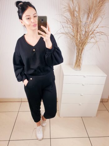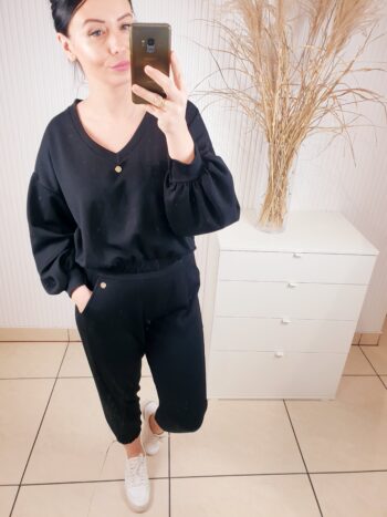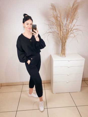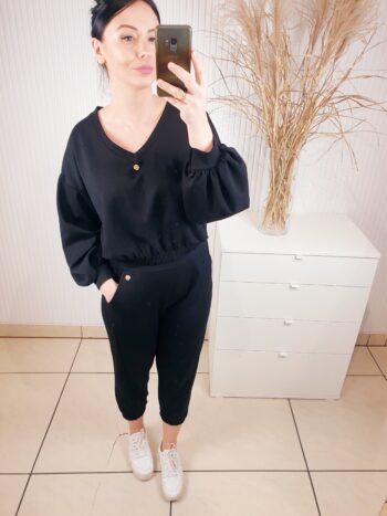 Cudowny komplet składający się z oversizowej bluzy w serek i spodni o luźniejszym kroju. Całość wykonana z materiału typu masełko- bardzo lekkiego i przyjemnego w dotyku. Spodnie posiadają gumkę w pasie, po bokach kieszenie oraz ściągacz u dołu. Komfortowy i wygodny w noszeniu.