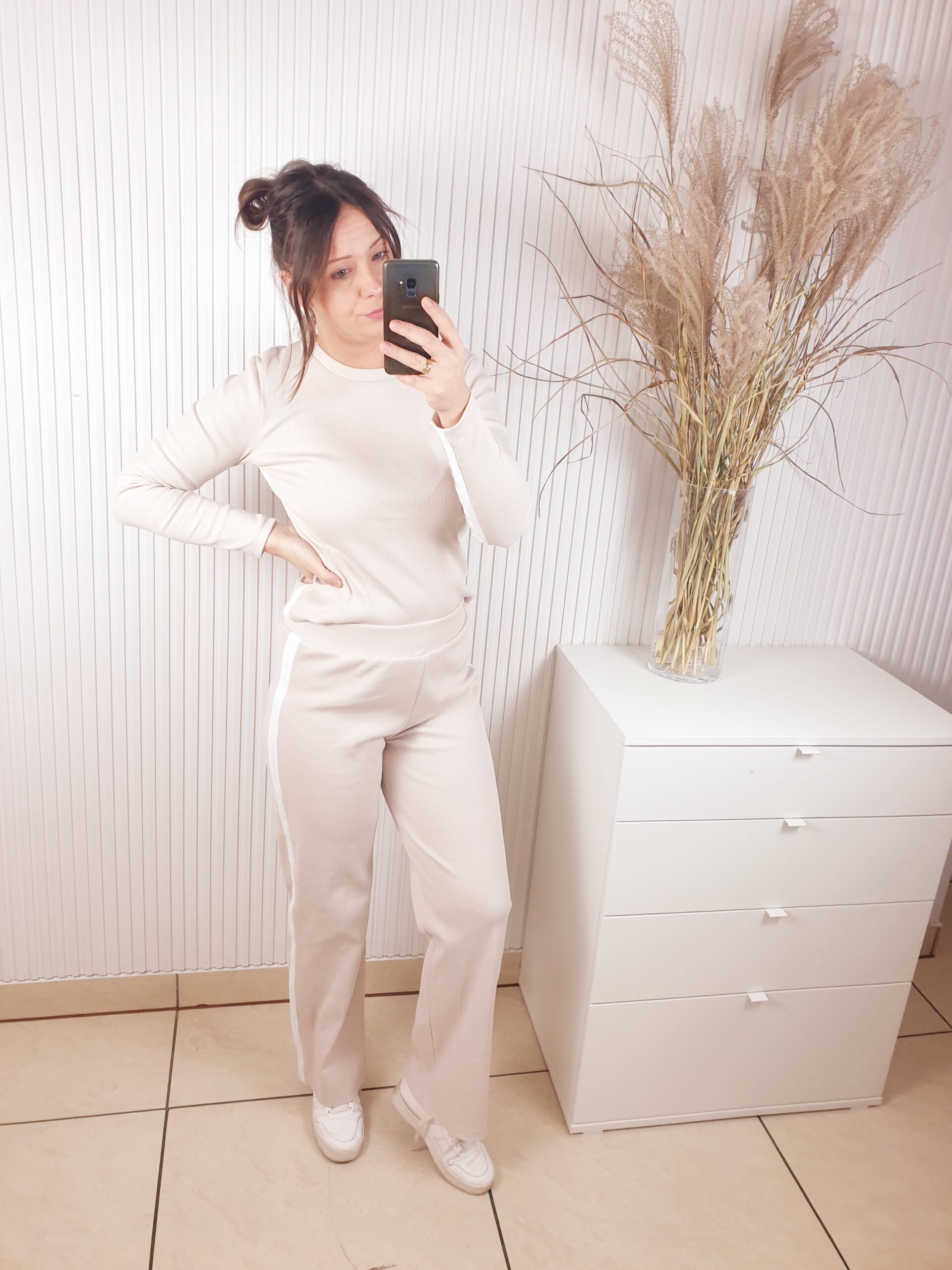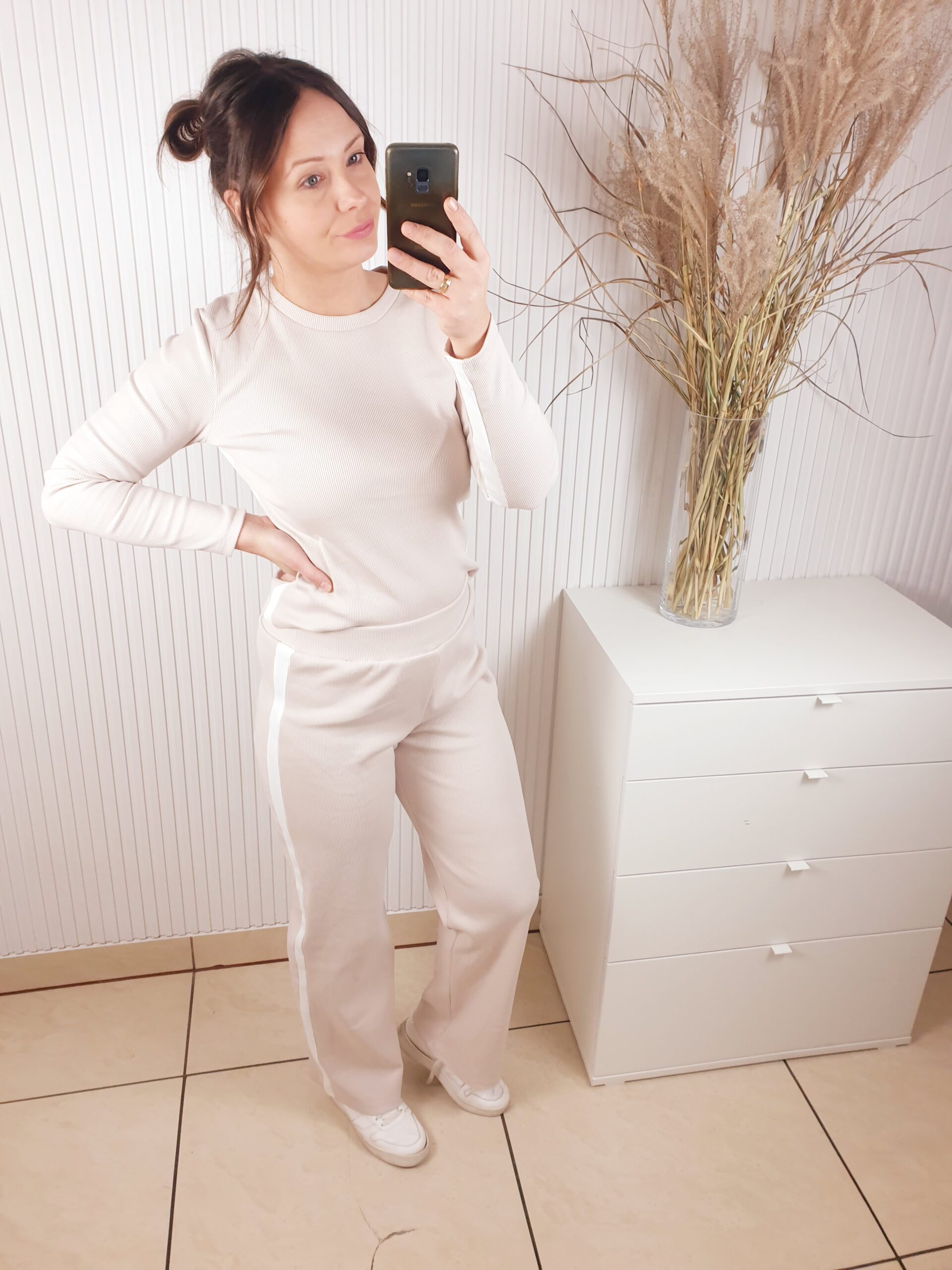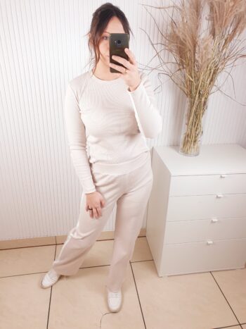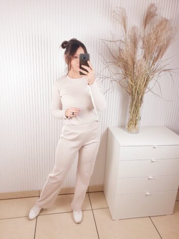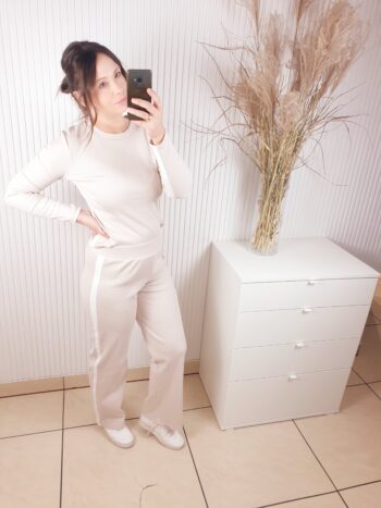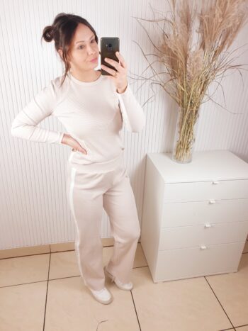 Komplet wykonany z prążkowanego materiału. Bluzka z długim rękawem, ozdobiona lampasami, które dodają sportowego akcentu. Poduszki na ramionach podkreślają sylwetkę. Spodnie z szerokim pasem i prostą nogawką. Całość wykonana z cienkiej bawełny.