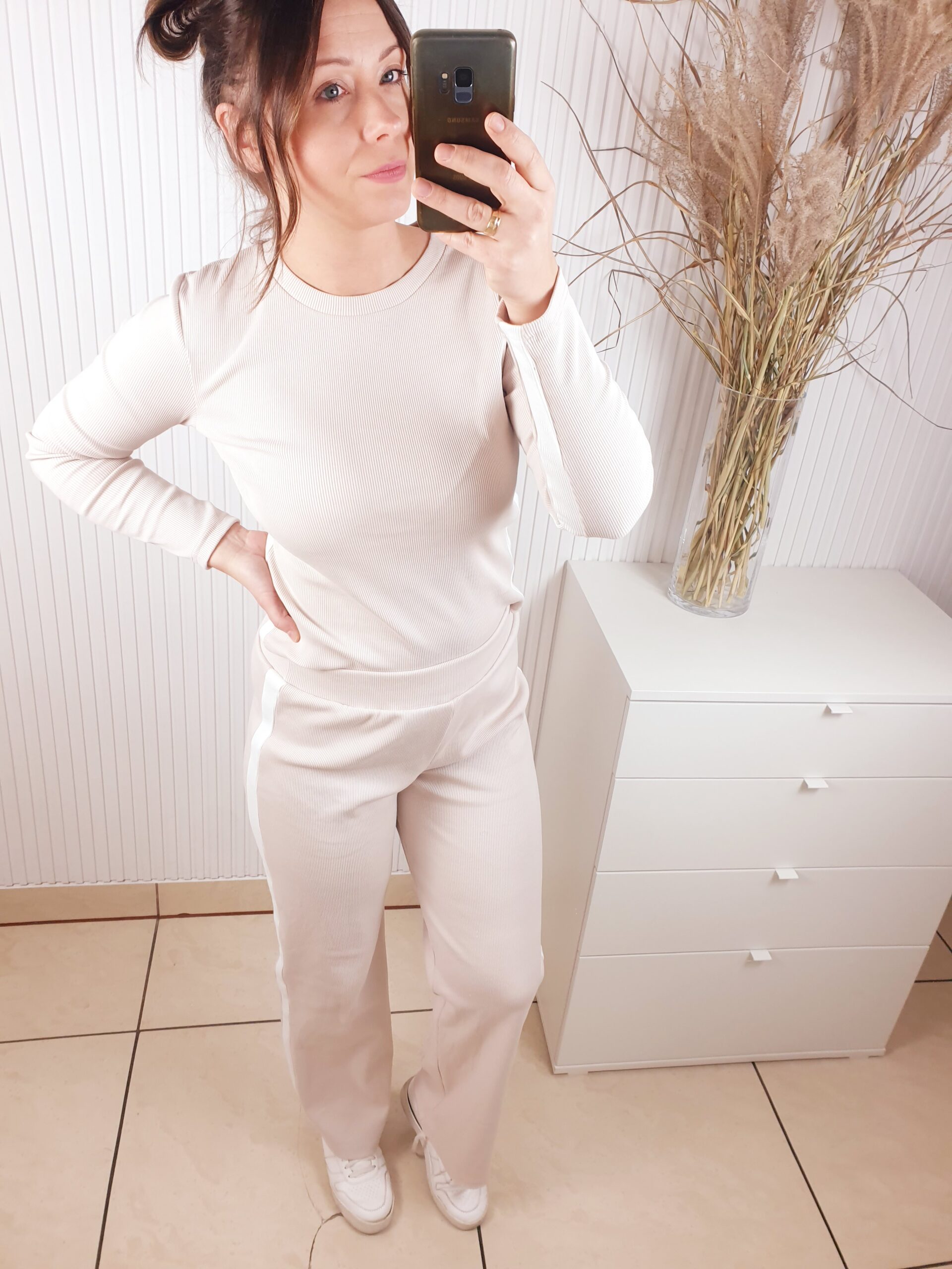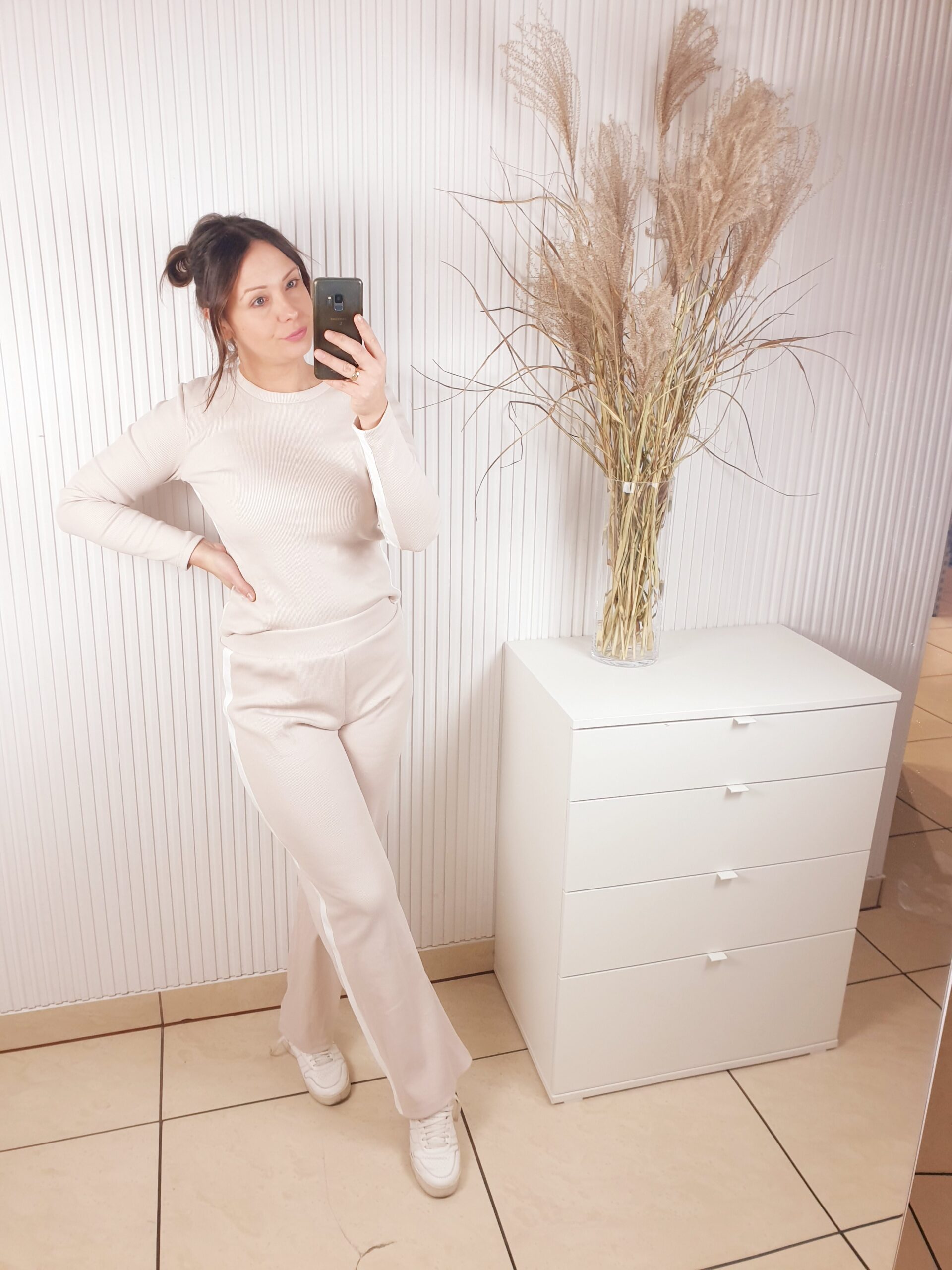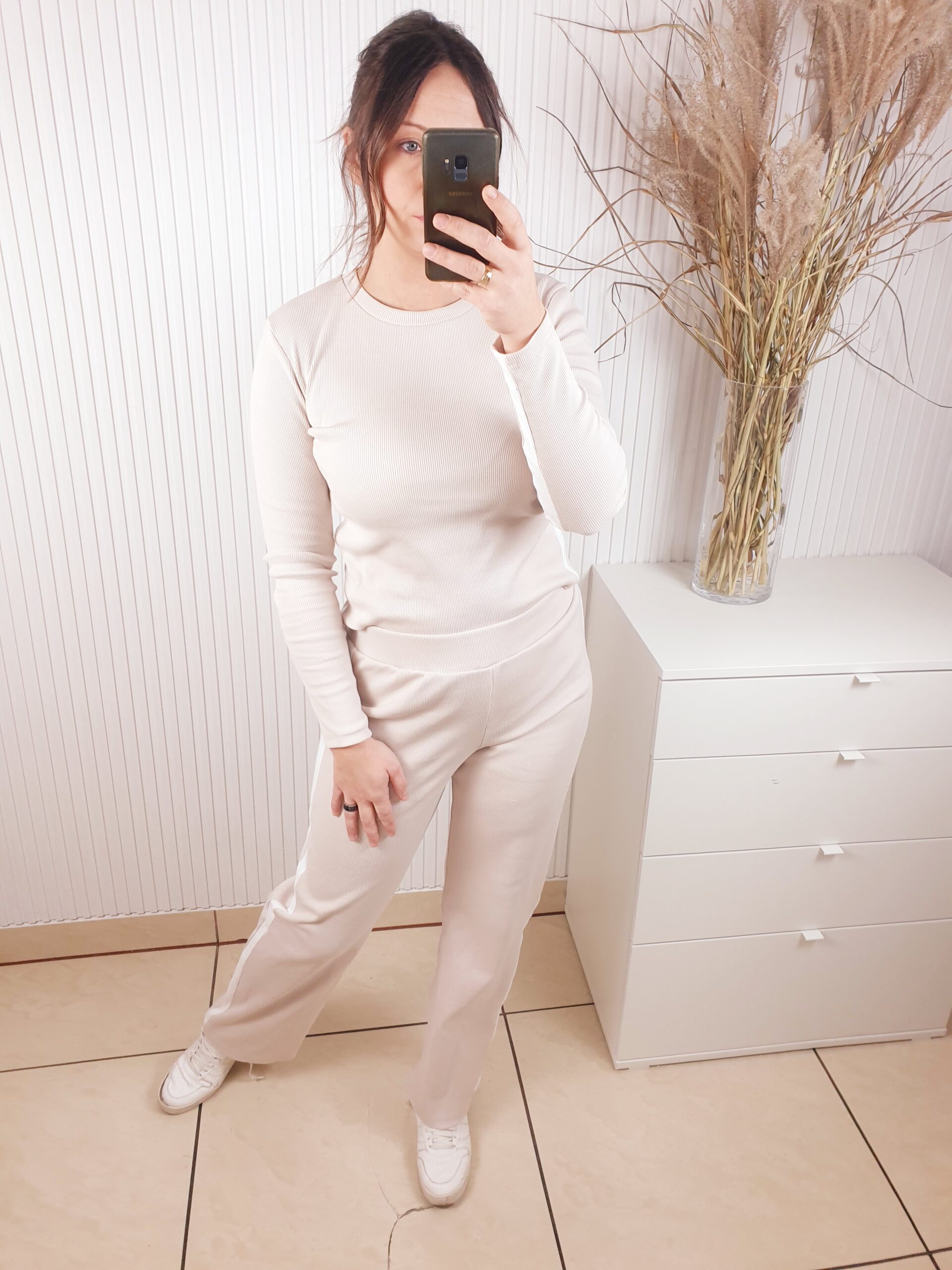 Komplet wykonany z prążkowanego materiału. Bluzka z długim rękawem, ozdobiona lampasami, które dodają sportowego akcentu. Poduszki na ramionach podkreślają sylwetkę. Spodnie z szerokim pasem i prostą nogawką. Całość wykonana z cienkiej bawełny.