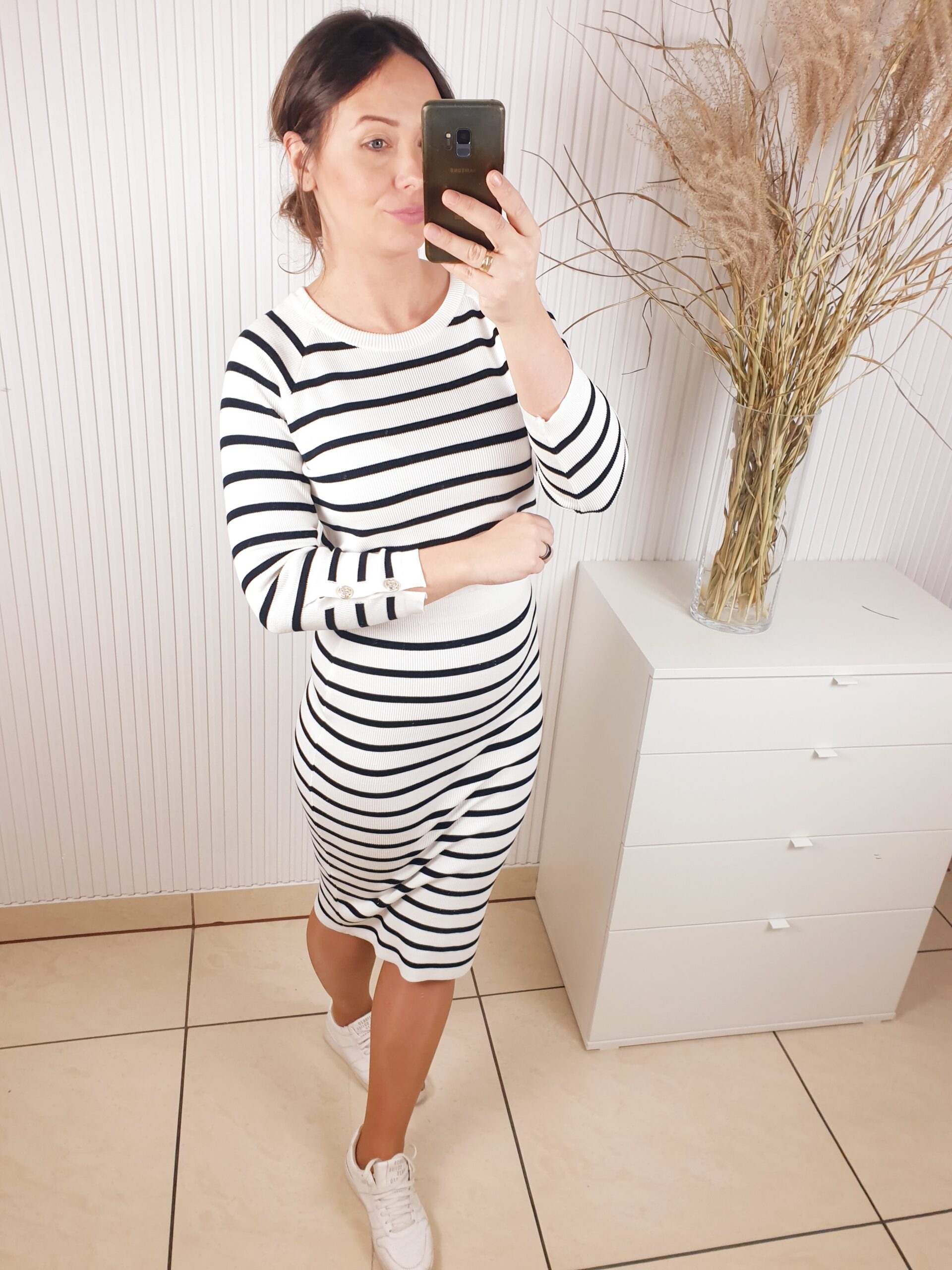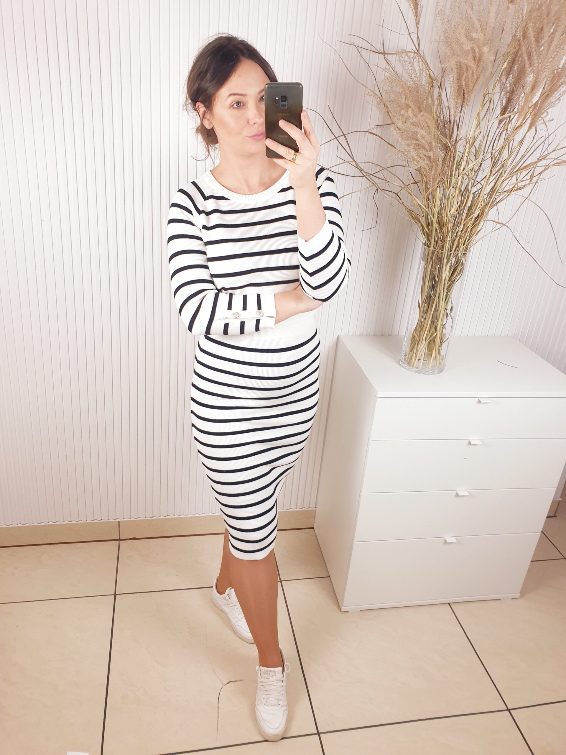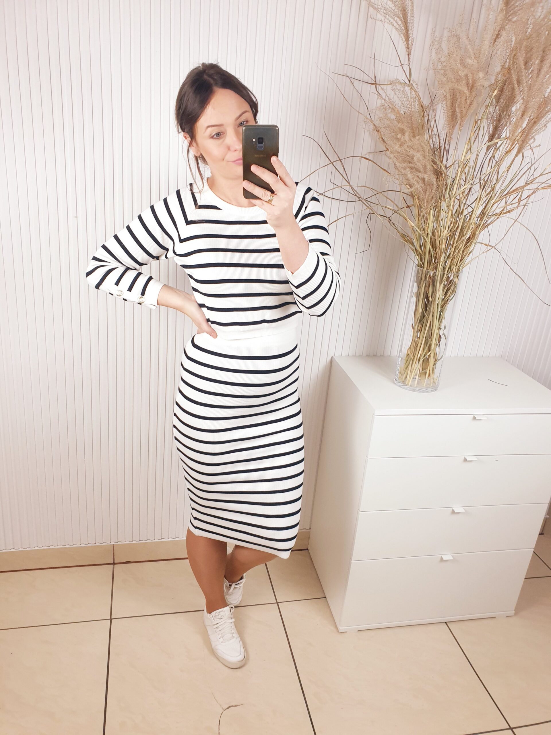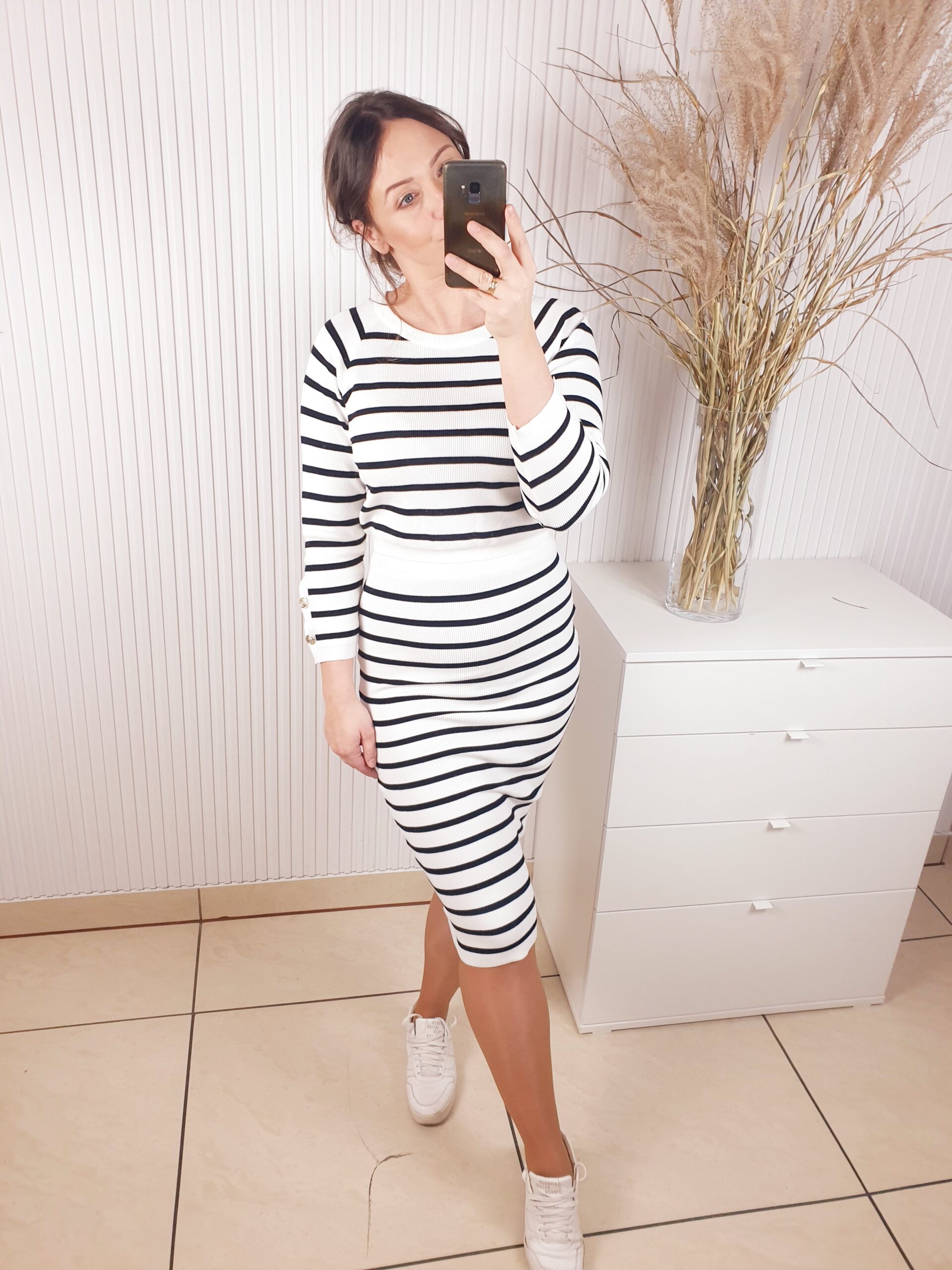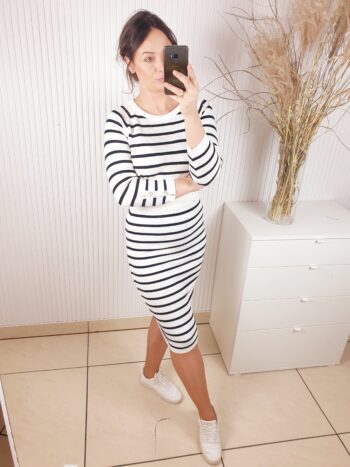 komplet, La Blanche, komplet w paski, dzianinowy, spódnica i sweterek,