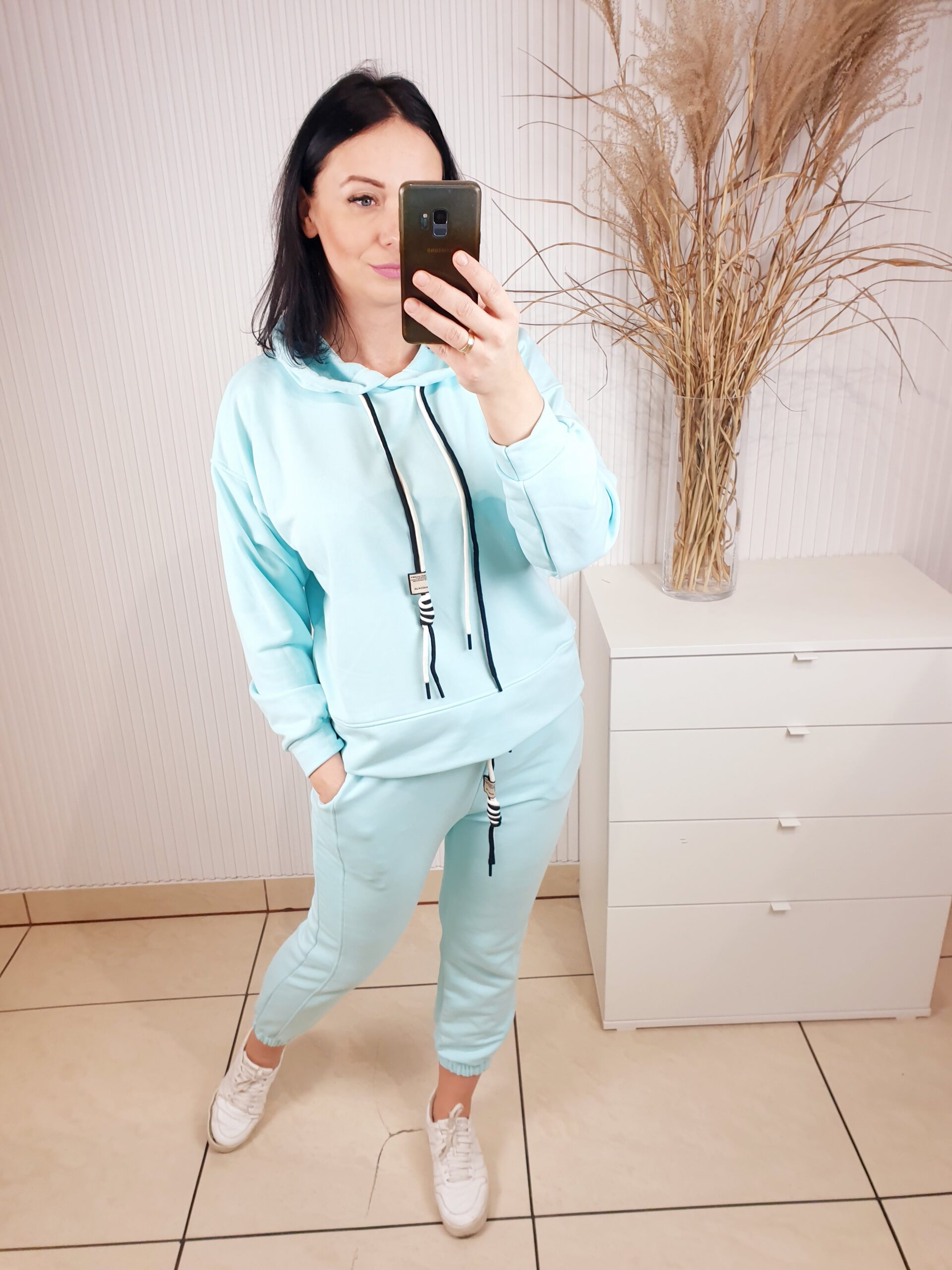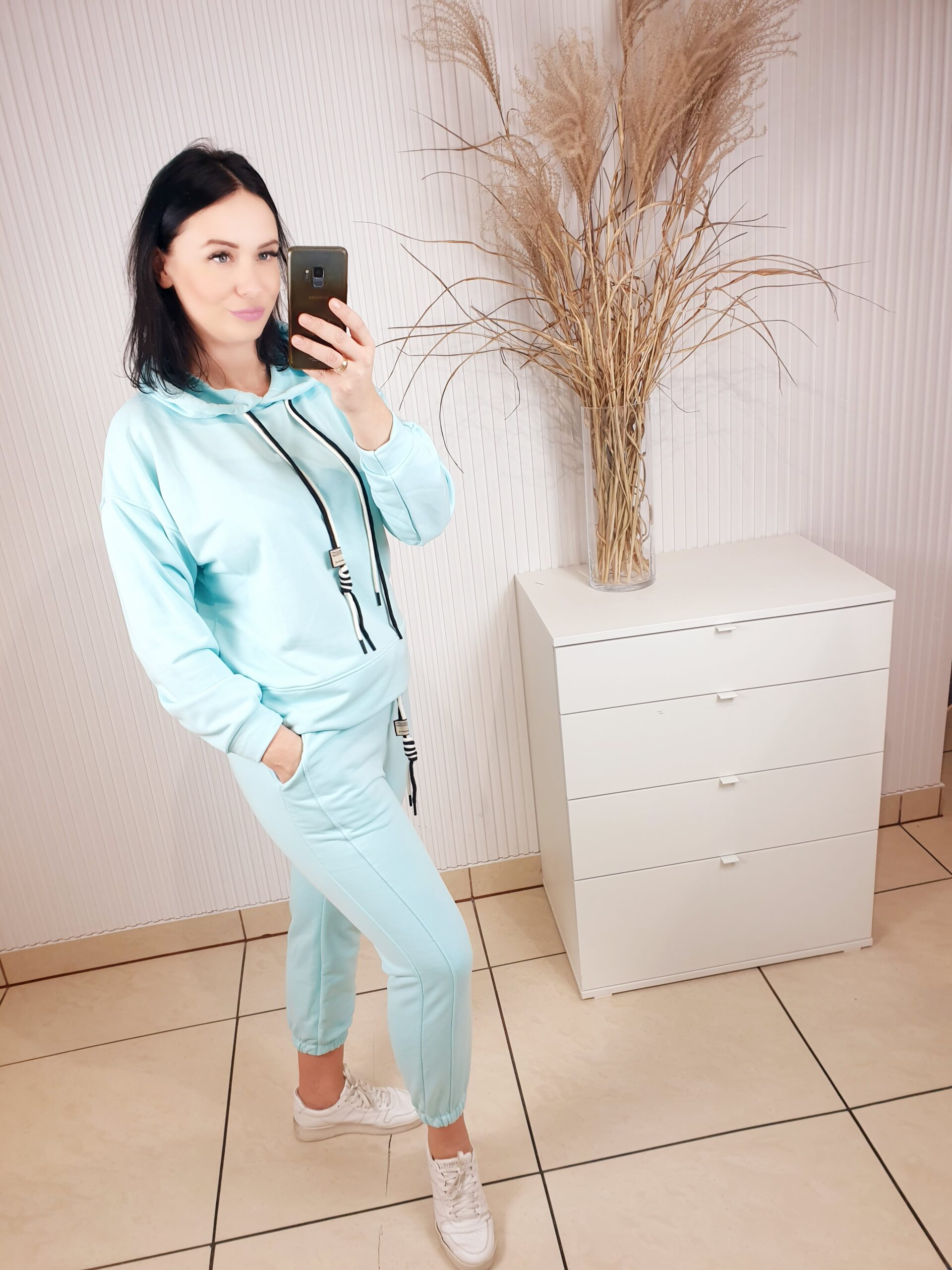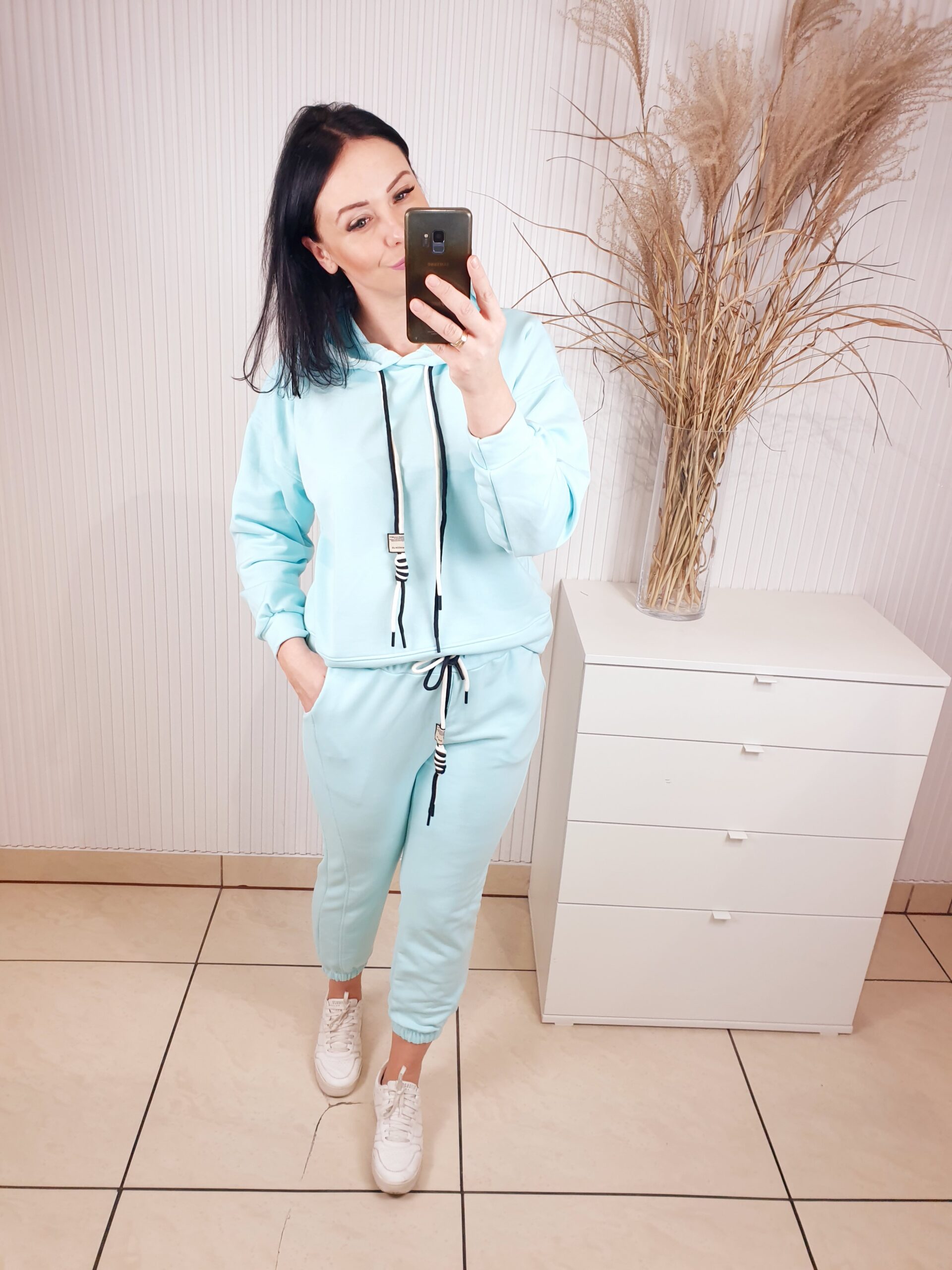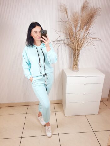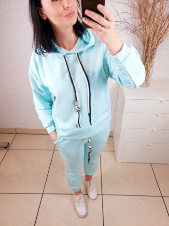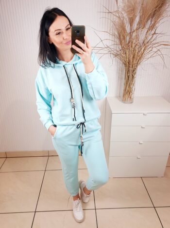 Cudowny komplet składający się z oversizowej bluzy i spodni o luźniejszym kroju. Całość wykonana z materiału typu masełko- bardzo lekkiego i przyjemnego w dotyku. Spodnie posiadają gumkę w pasie, po bokach kieszenie oraz ściągacz u dołu. Komfortowy i wygodny w noszeniu.