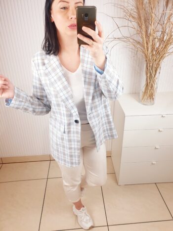 marynarka, na podszewce, rozmiar uniwersalny, na jeden guzik, z odwijanym kołnierzem, w kratkę, overisize, dzianinowa, niebiesko-beżowa