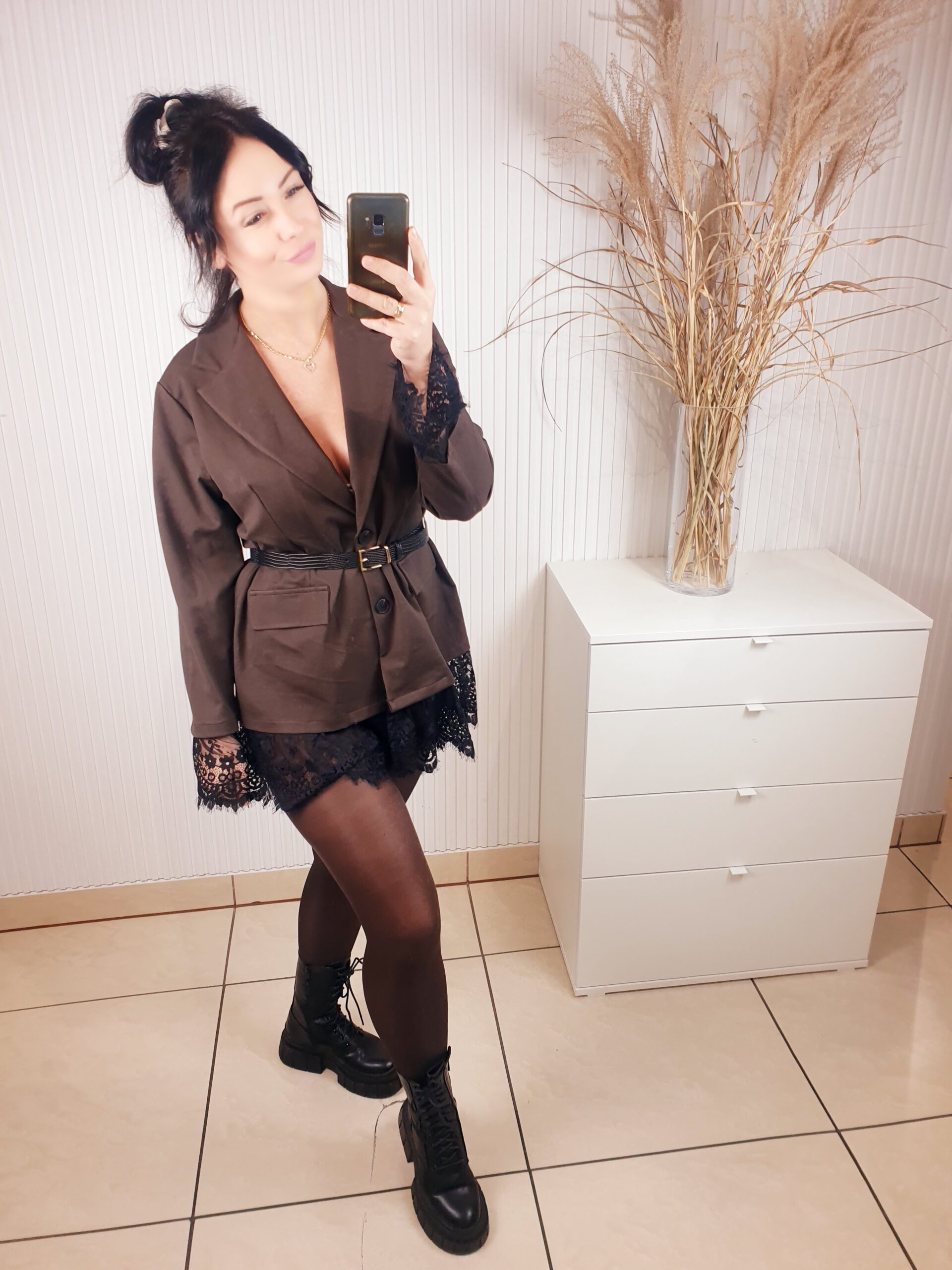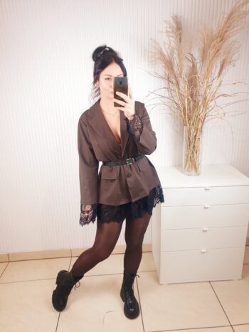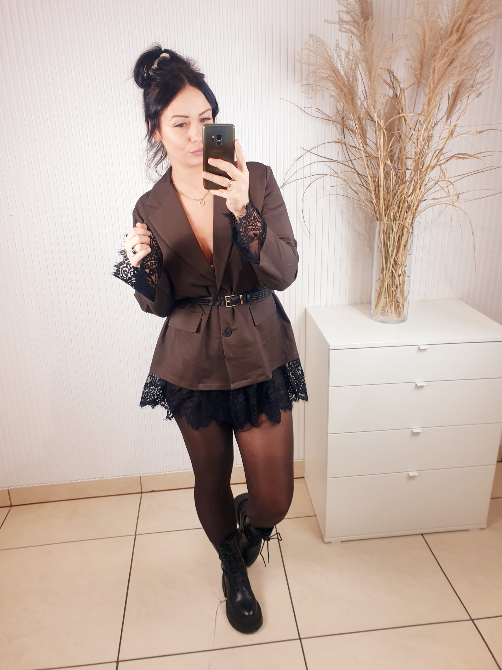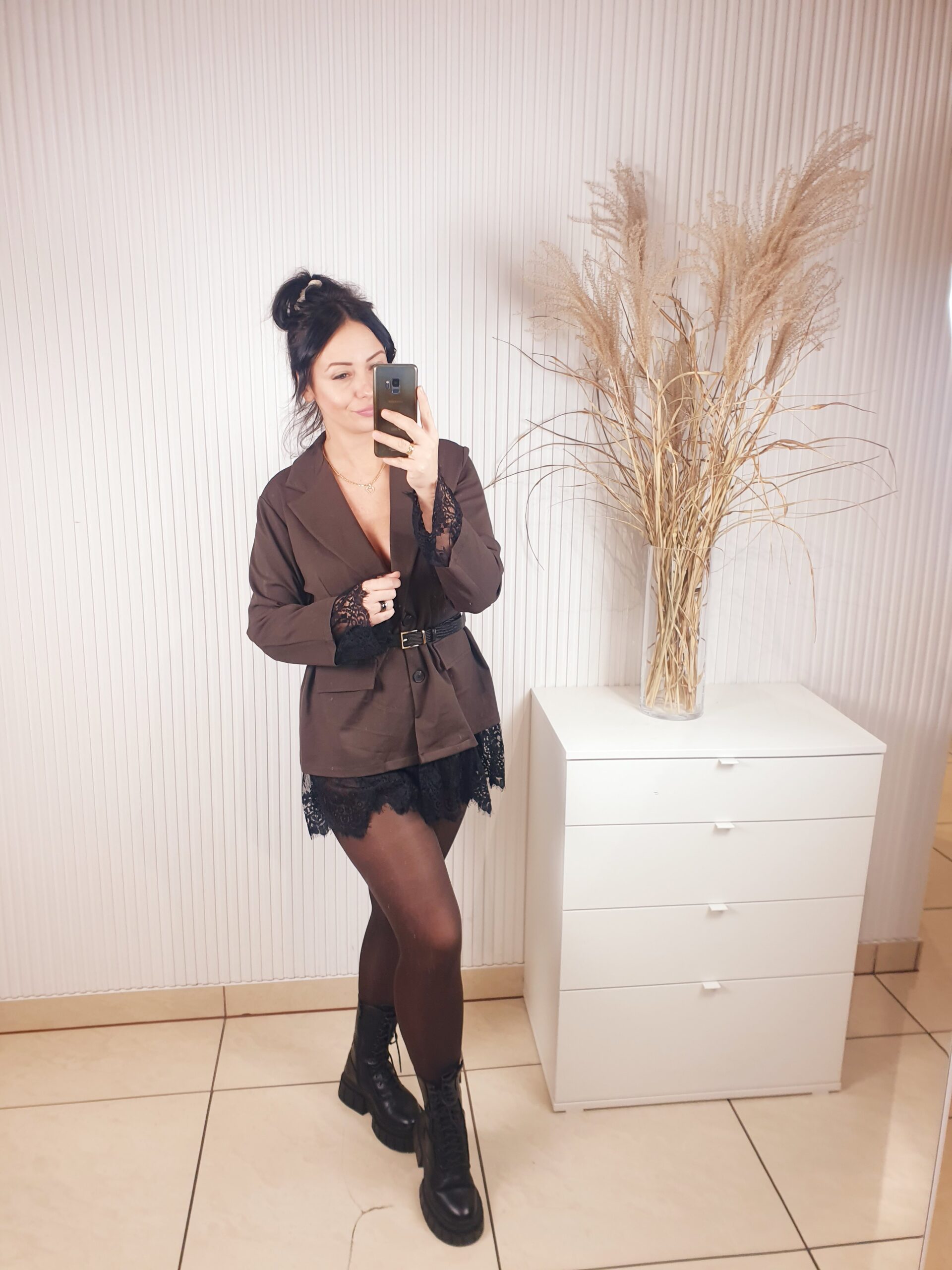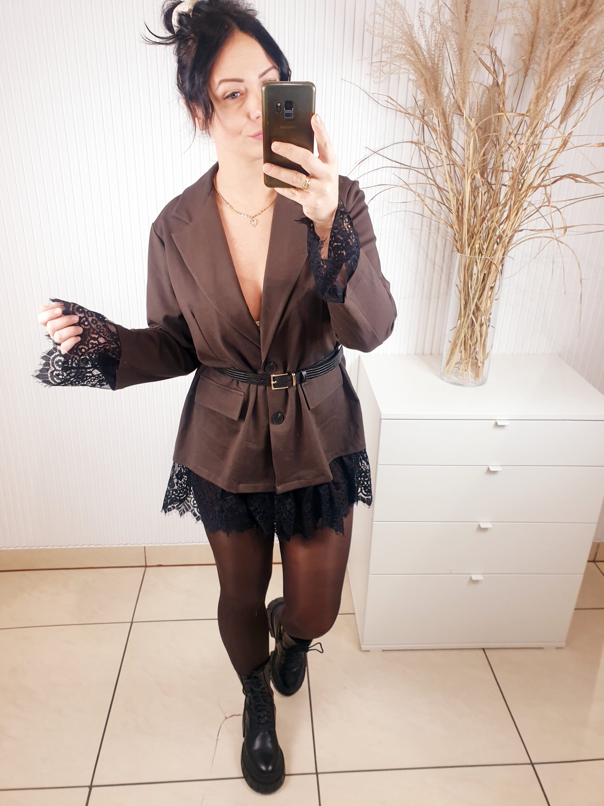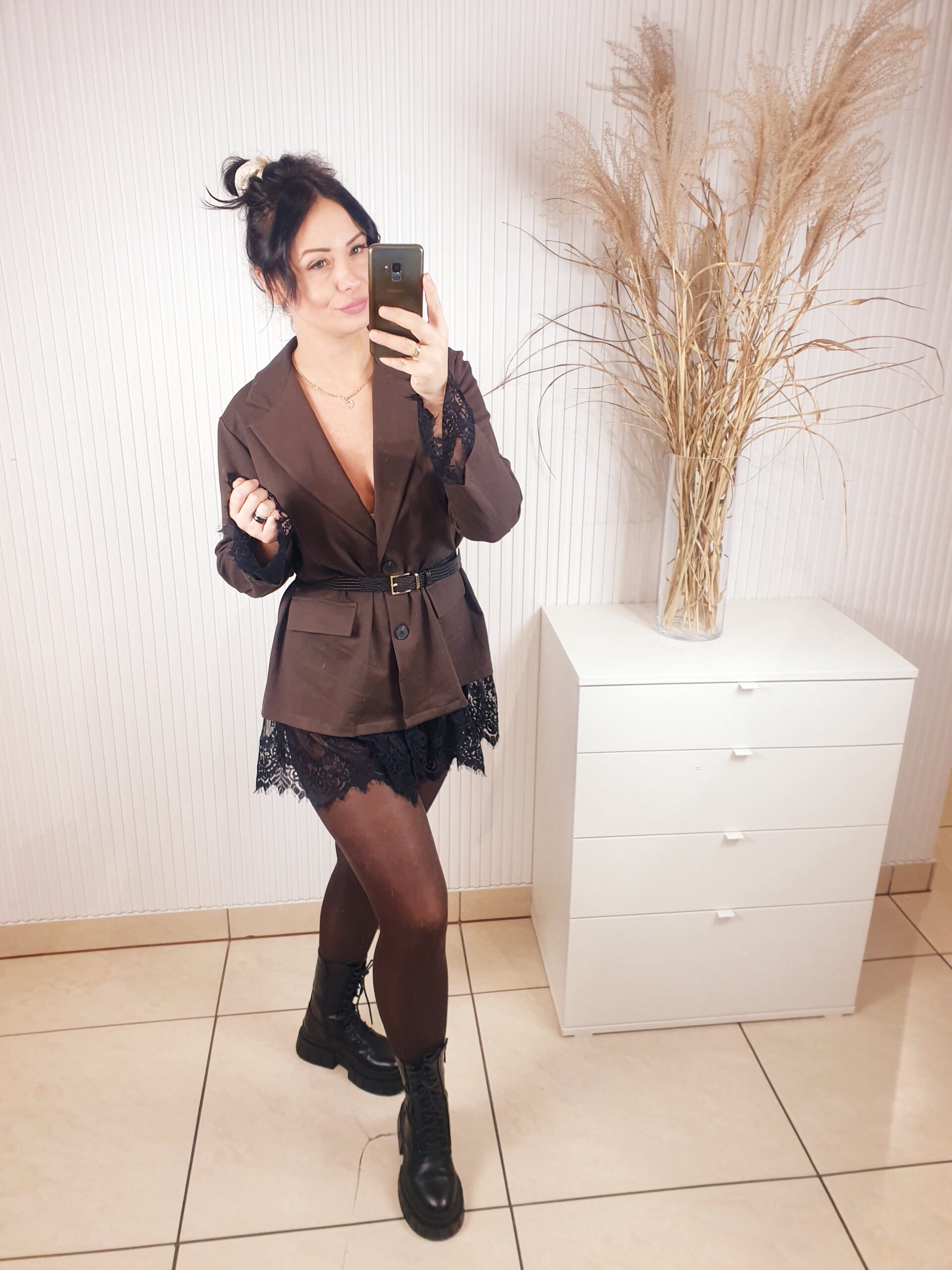 Marynarka o oversizowym fasonie w najmodniejszym stylu tego sezonu. Posiada czarną koronkę u dołu oraz przy rękawach. Zapinana na guziki. Świetnie sprawdzi się w stylizacji jako sukienka w połączeniu z modnym paskiem. Totalny hit tegorocznego sezonu jesienno-zimowego.