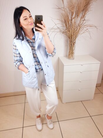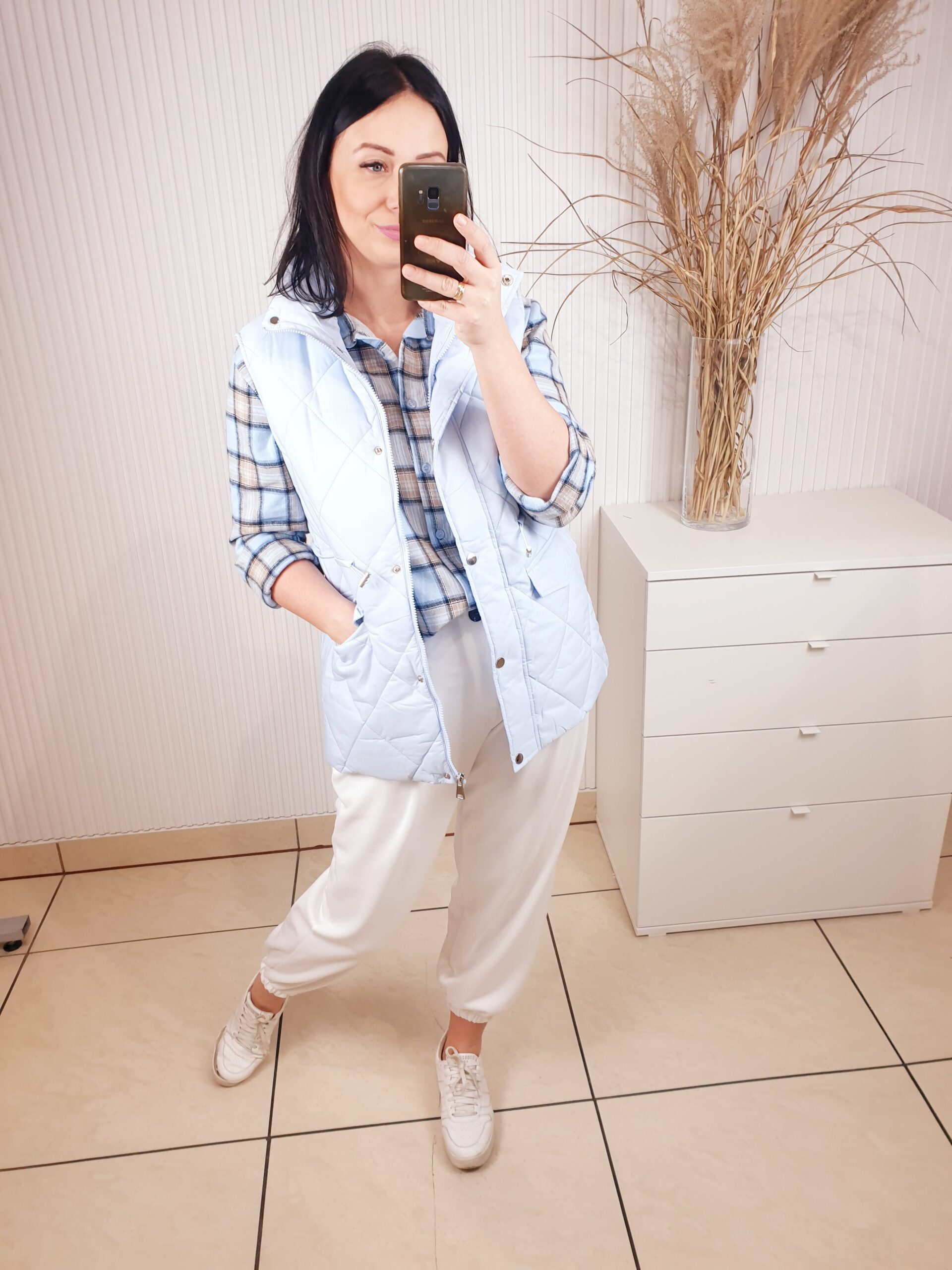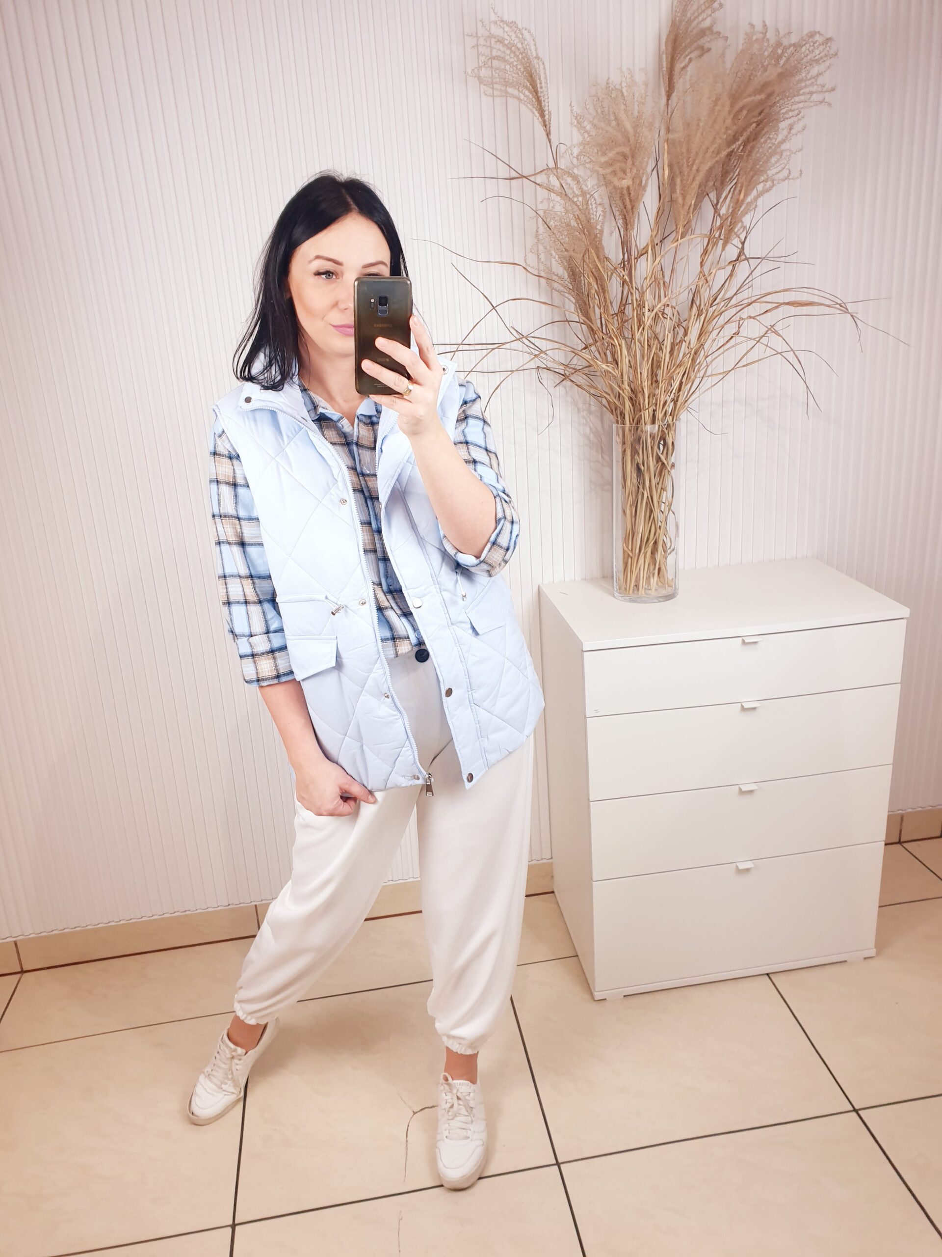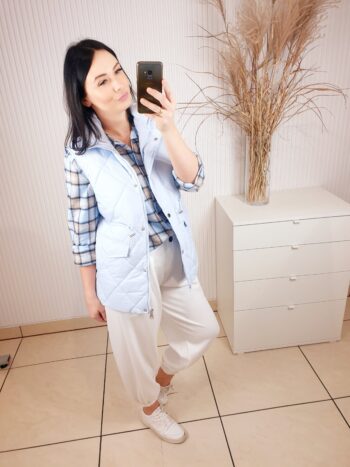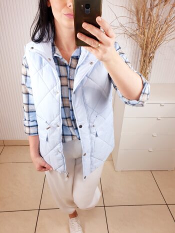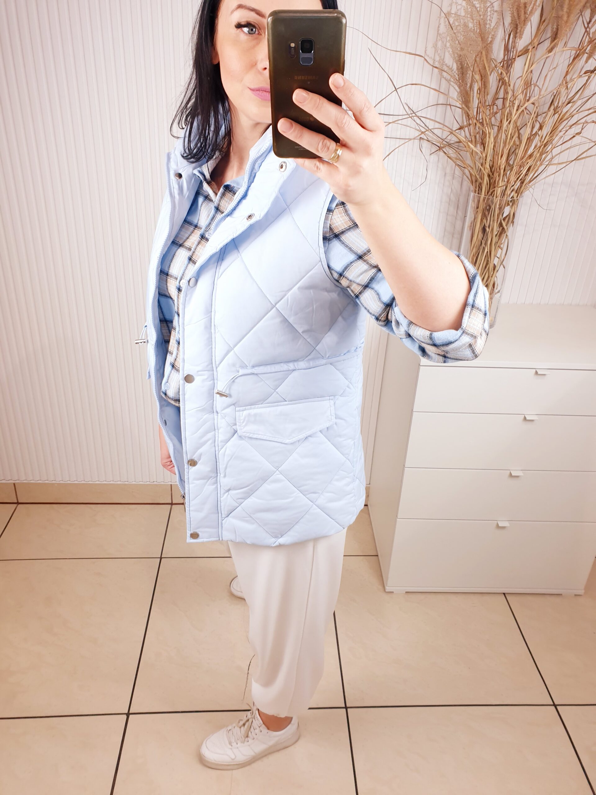 Pikowana kamizelka o nieco dłuższym fasonie zapinana na zamek. Idealnie sprawdzi się na wiosenne chłodniejsze poranki lub wieczory. Posiada kieszenie oraz ściągacz w pasie. W modnym, pastelowym odcieniu baby blue.