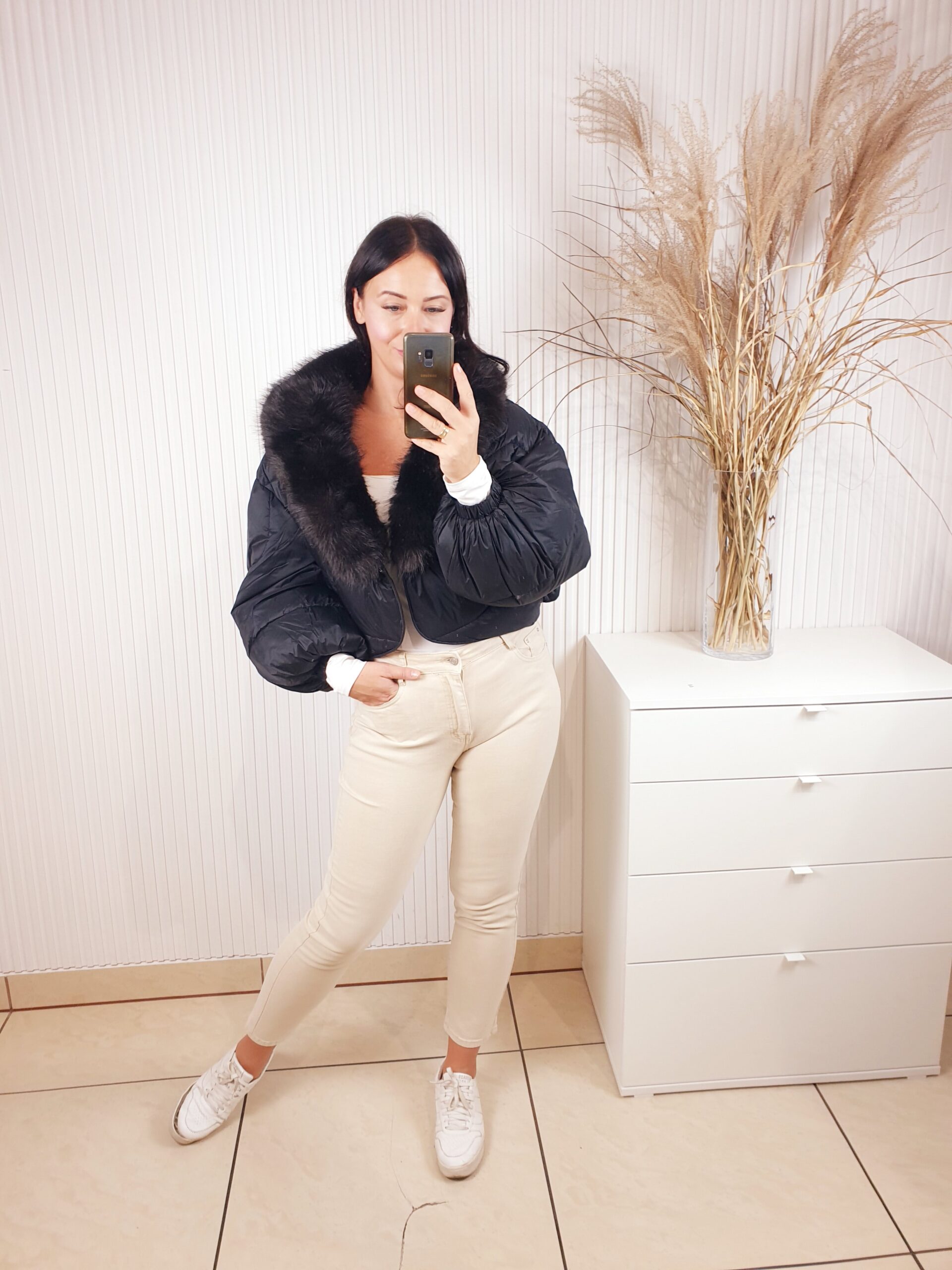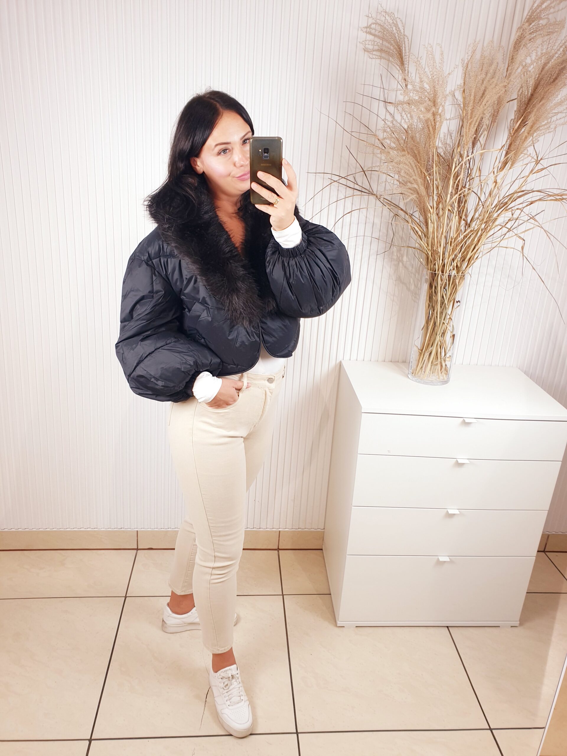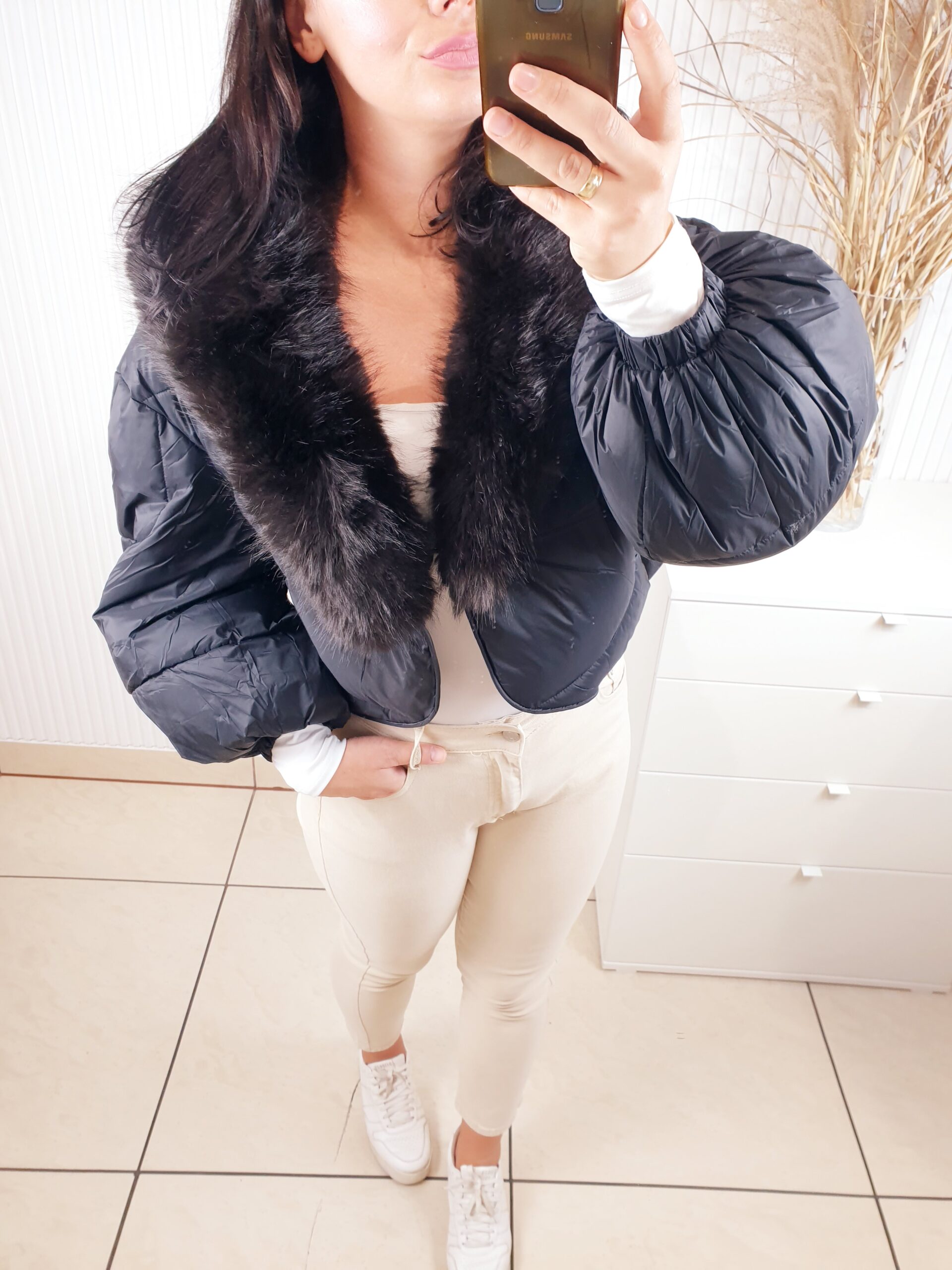 Krótka, pikowana kurtka z zapięciem na napy to świetny wybór na chłodniejsze dni. Model o oversizowym kroju posiada ciepłe wypełnienie oraz odpinane futro przy kołnierzu. Posiada kieszenie z przodu, rozszerzane rękawy oraz podszewkę. Bardzo stylowa, doda charakteru najprostszej stylizacji.