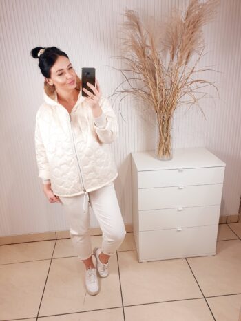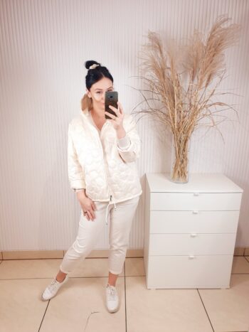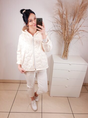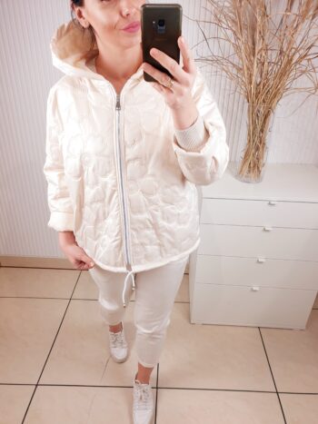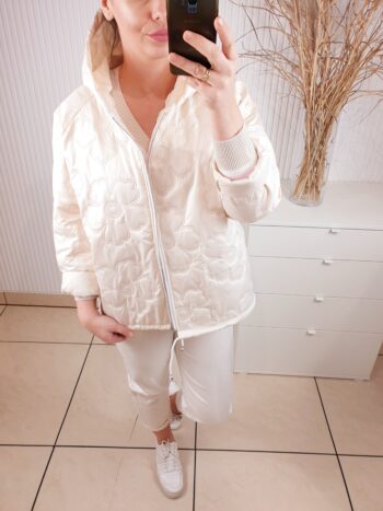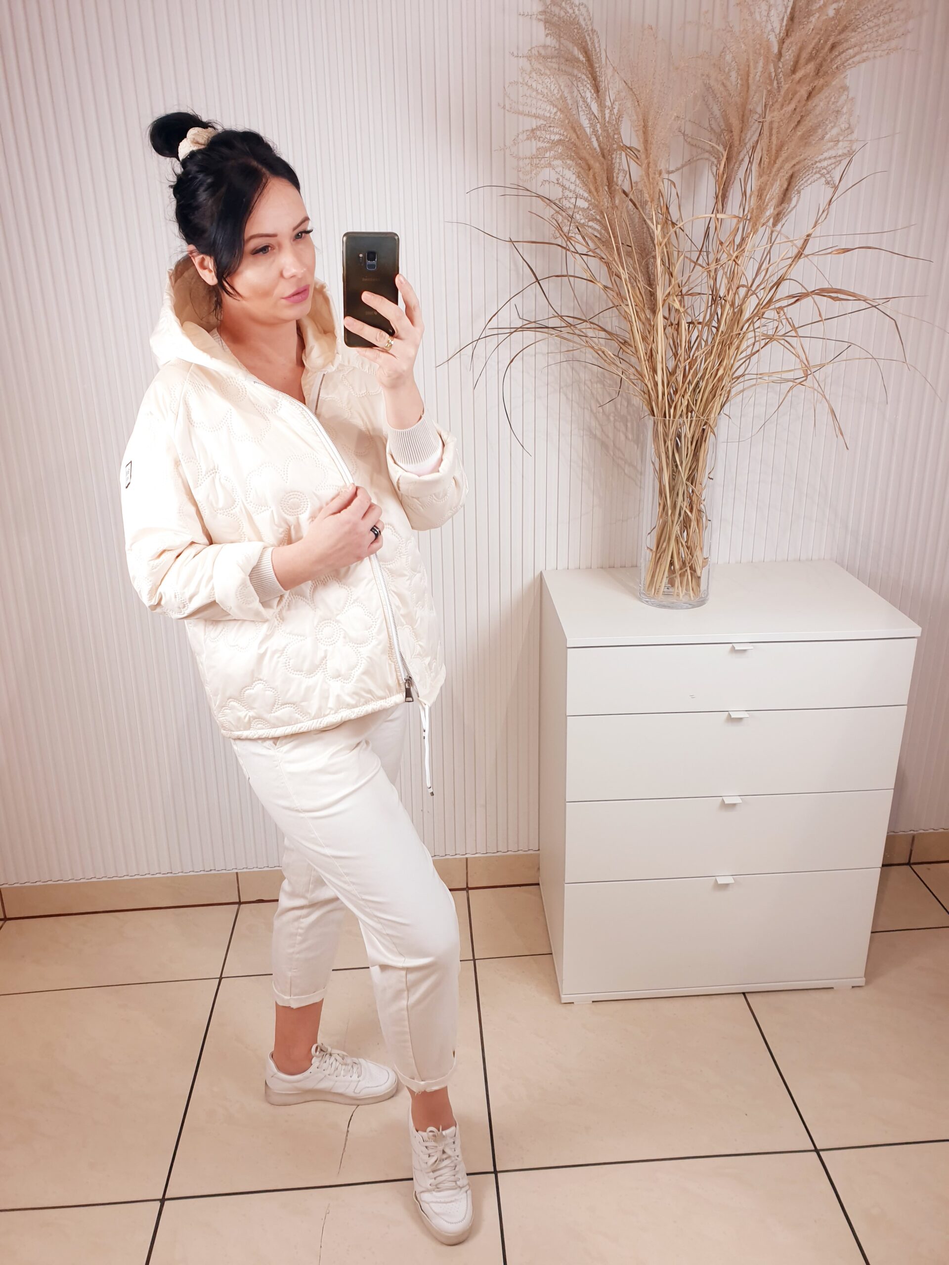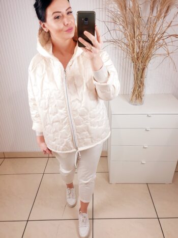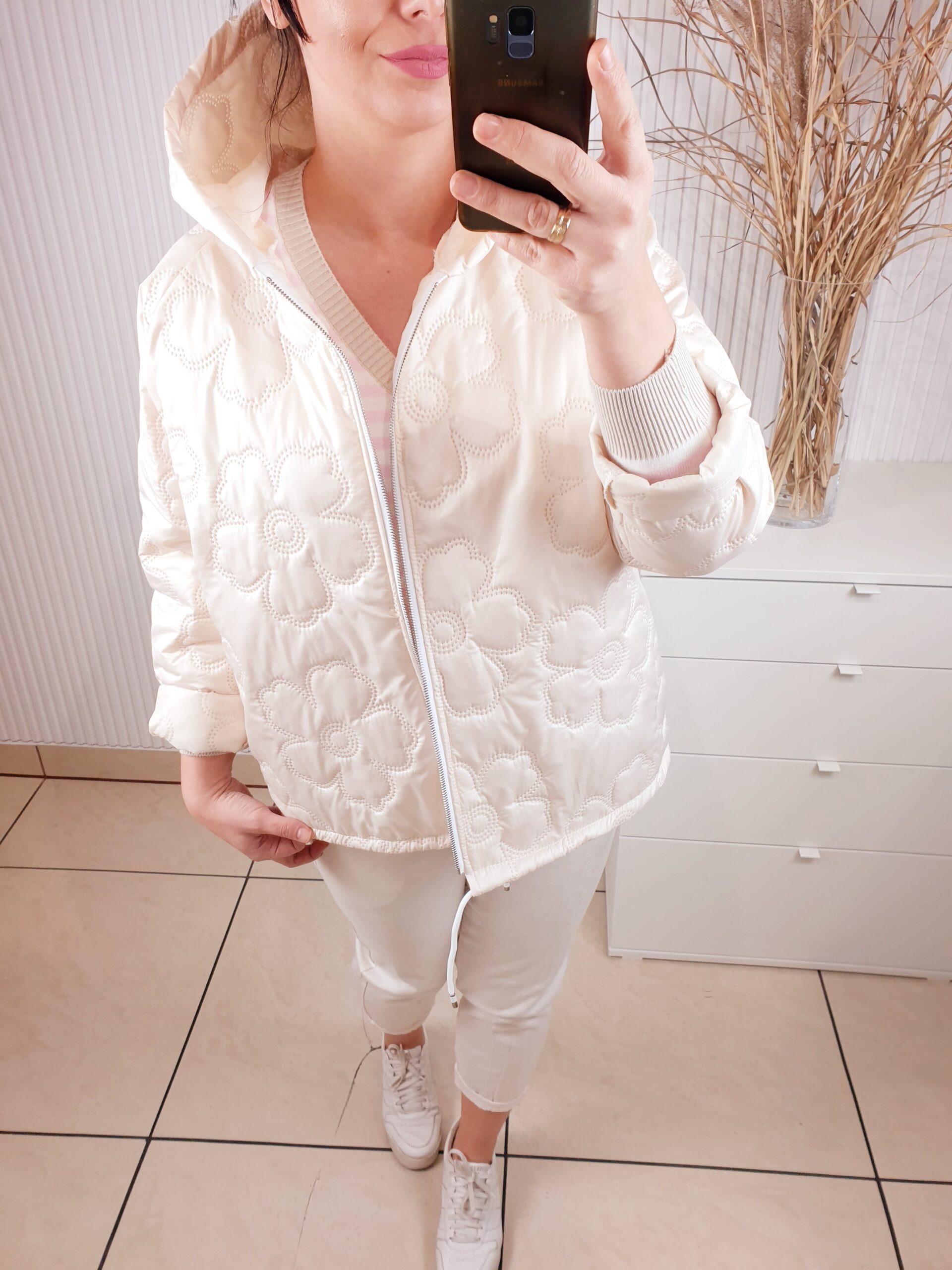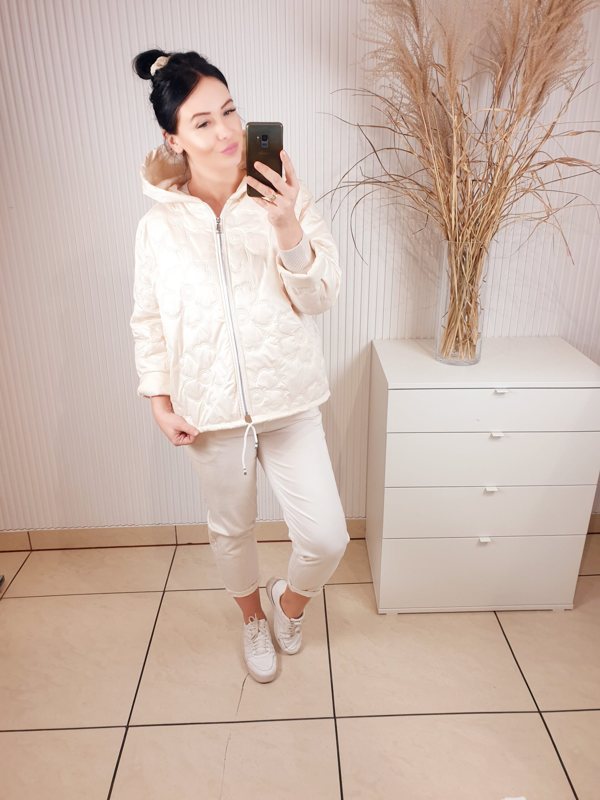 Lekka kurteczka zapinana na zamek z kapturem. Posiada dwie kieszenie po bokach. W cudownym budyniowym odcieniu w wytłaczane kwiaty. O prostym kroju, lekko oversizowym. Idealna na chłodniejsze wiosenne poranki oraz wieczory.