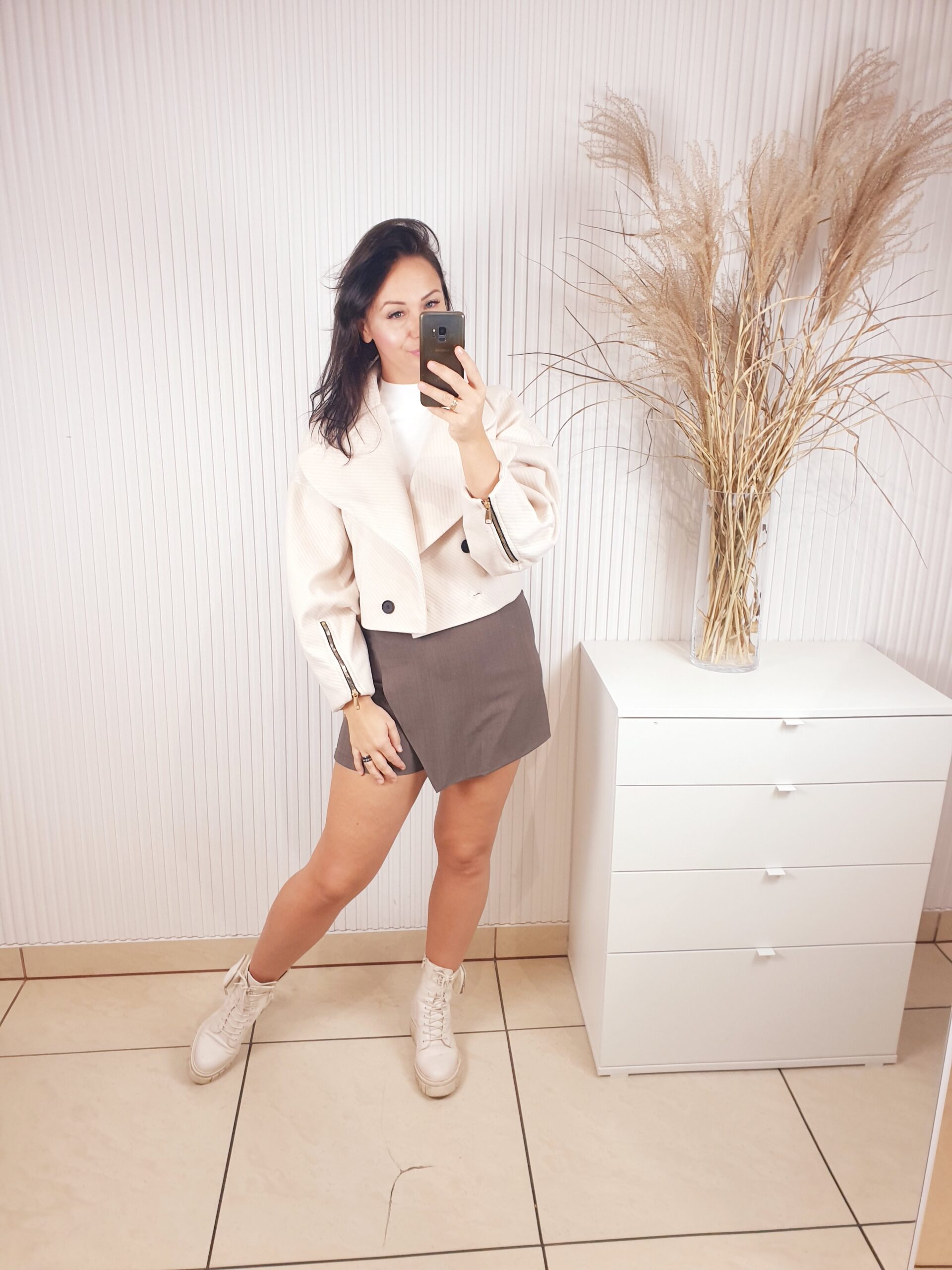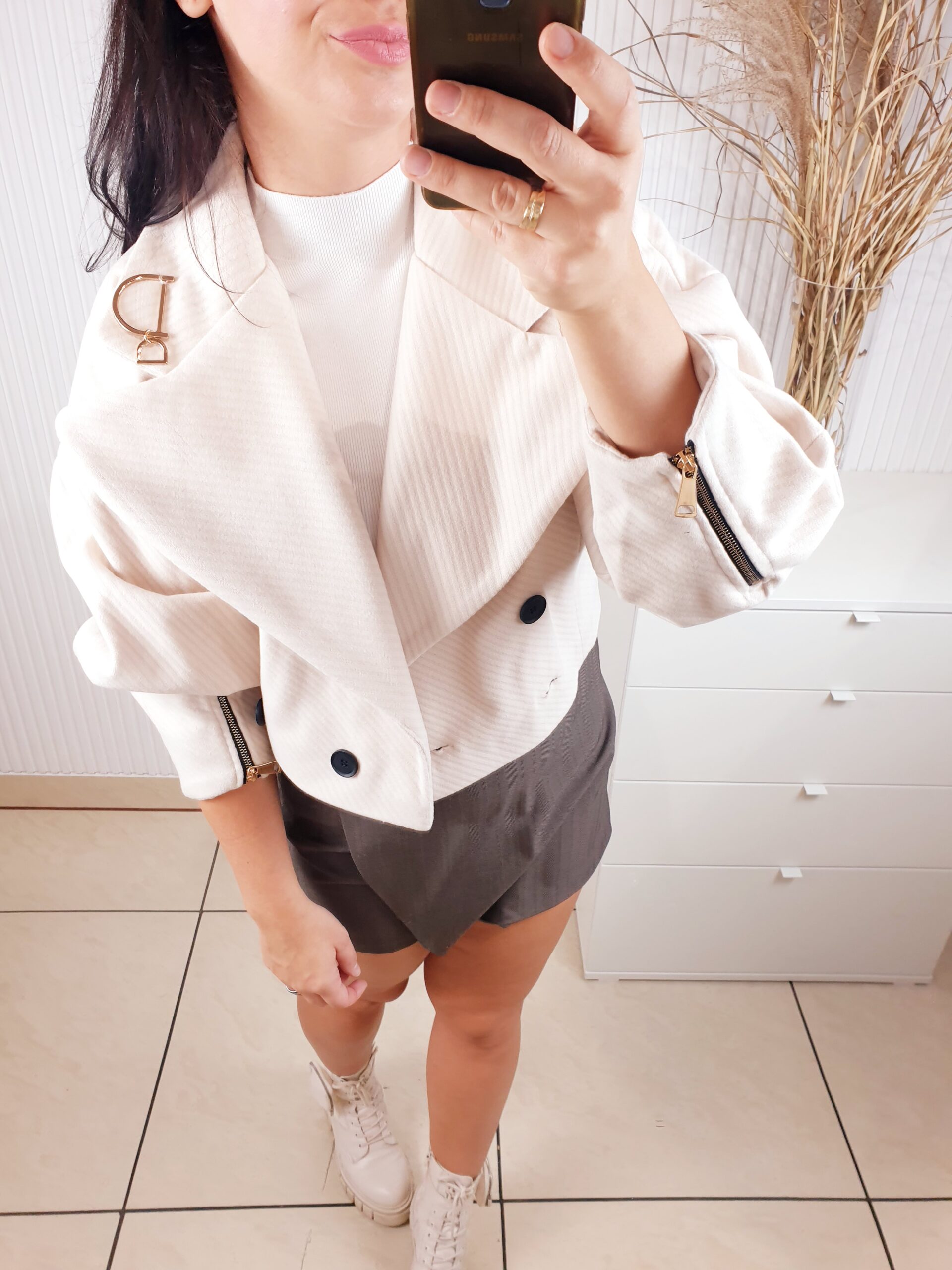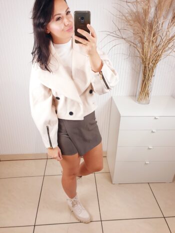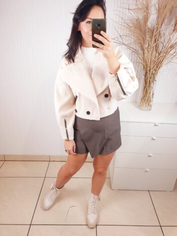 Stylowa, krótka kurtka do pasa, zaprojektowana z myślą o kobietach ceniących elegancję i wyjątkowy styl. Posiada szerokie rękawy, które zakończone są efektownym marszczeniem. Na dole zapięcie na dwa guziki, efektowny kołnierz ze złotą broszką.Rozmiar uniwersalny.