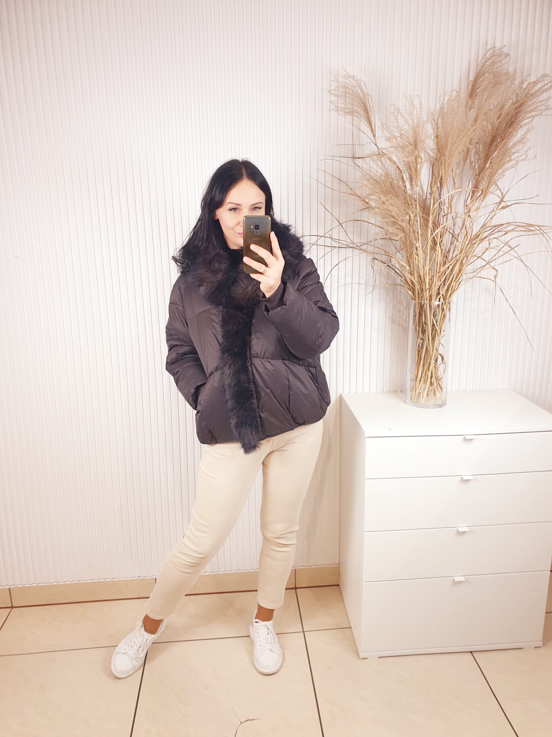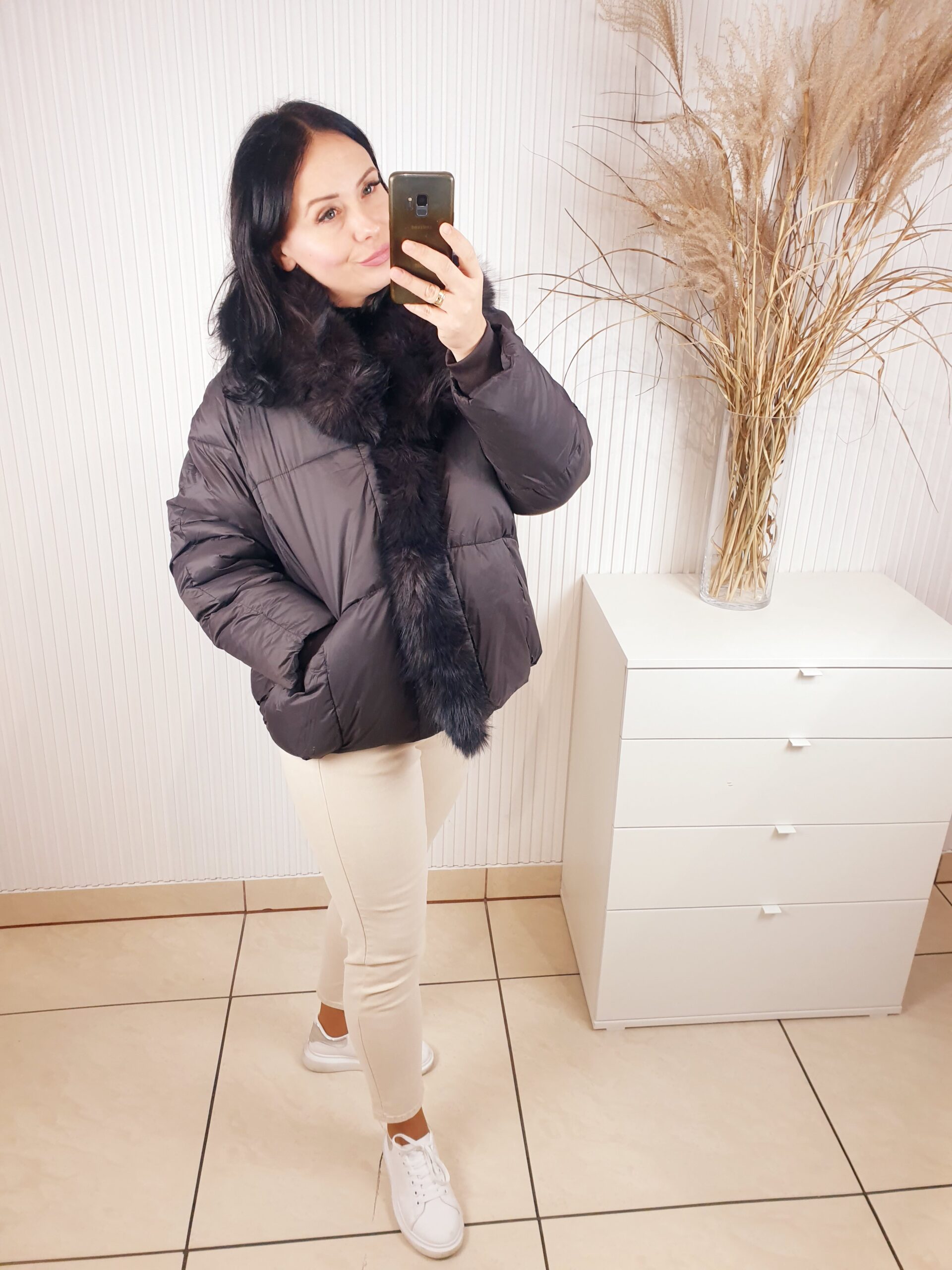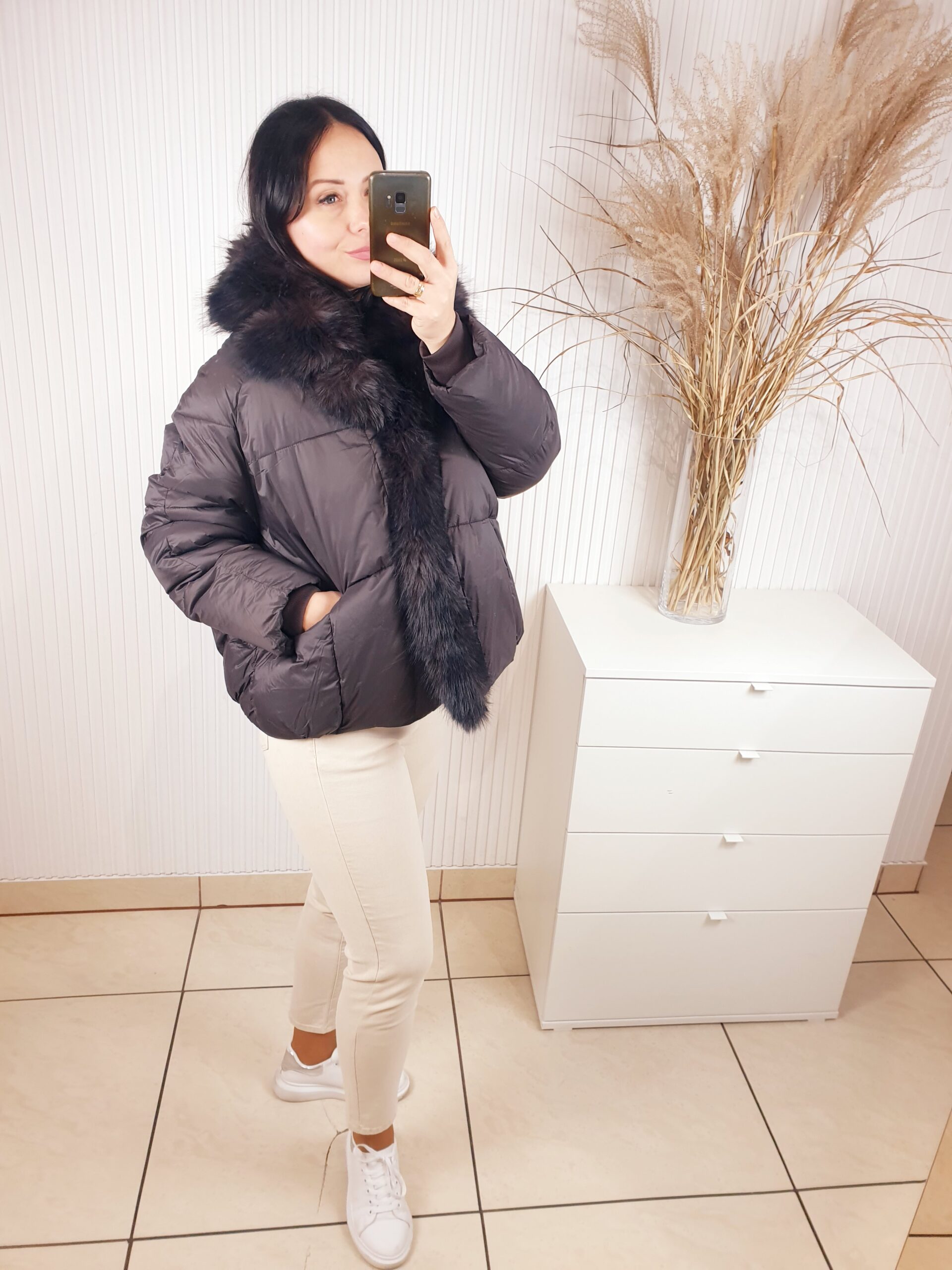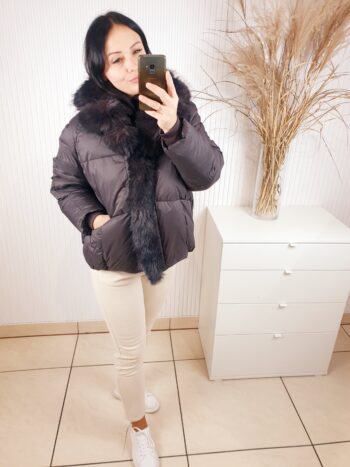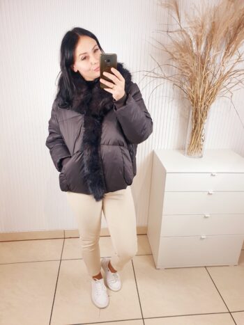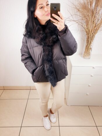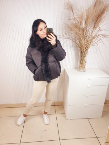 Ciepła kurtka w kolorze ciemnej czekolady zapinana na napy. Posiada kołnierz obszyty pięknym, brązowo-czarnym futerkiem. Z modnymi przeszyciami, o luźniejszym , swobodnym fasonie. Posiada z przodu dwie kieszenie. Idealna na chłodne, zimowe dni.
