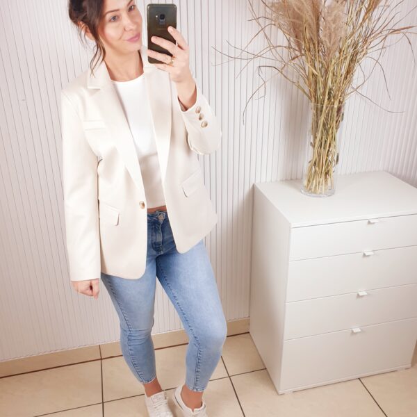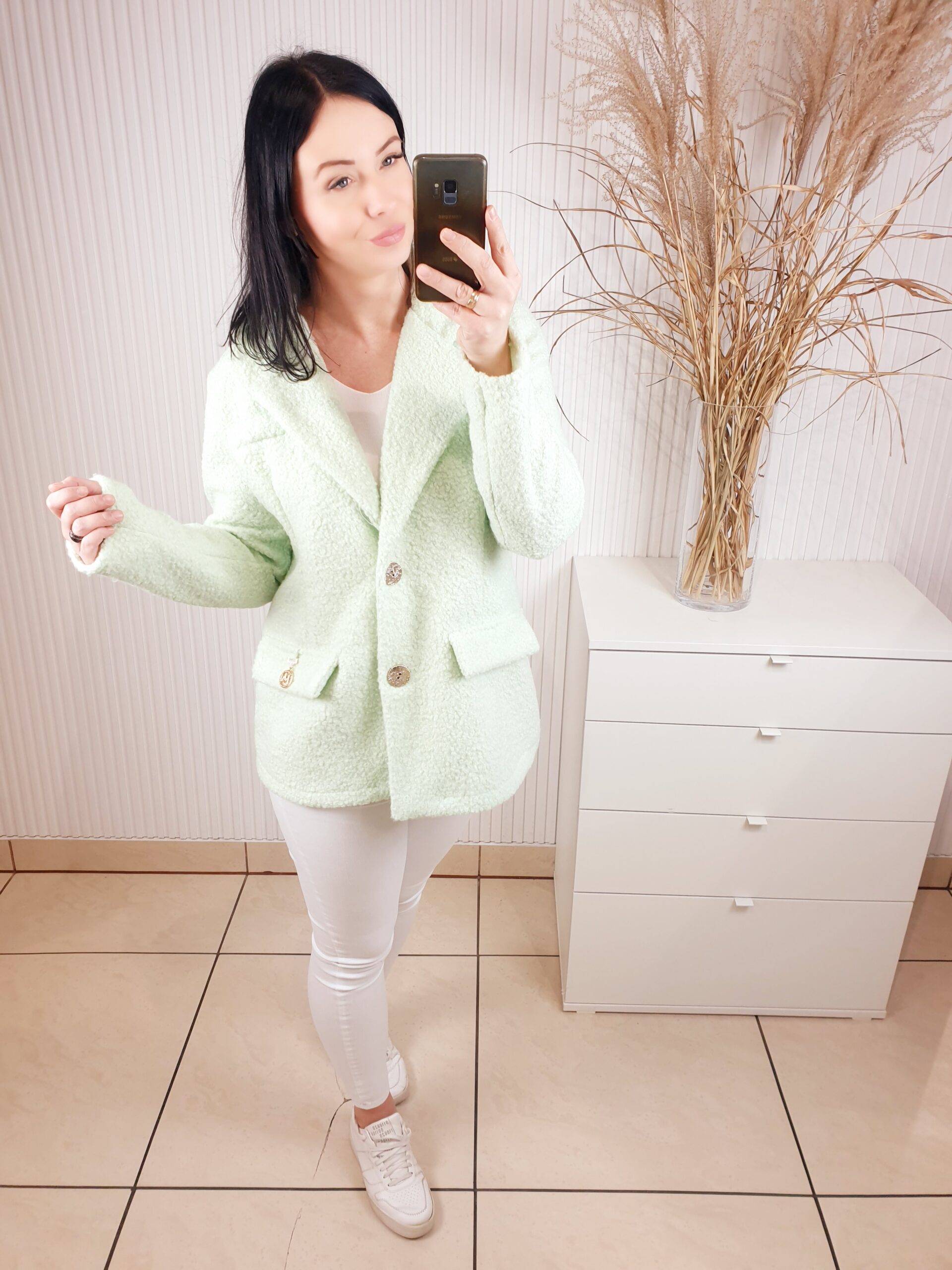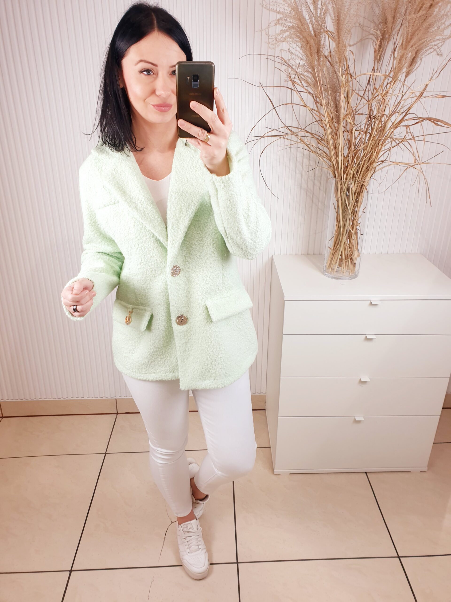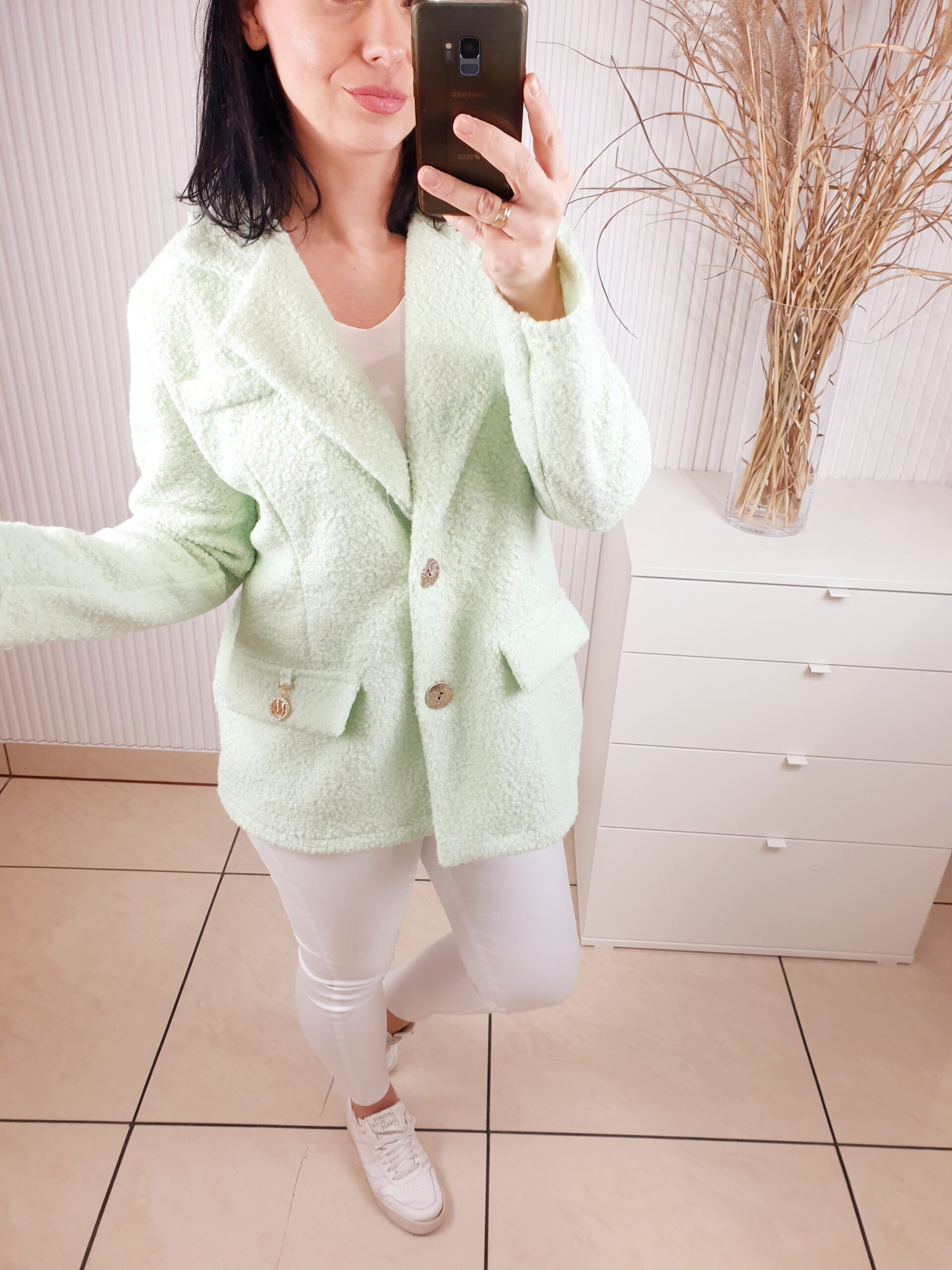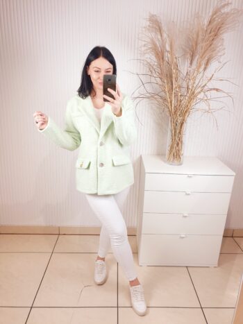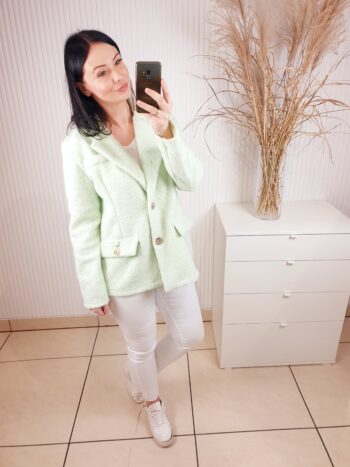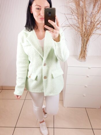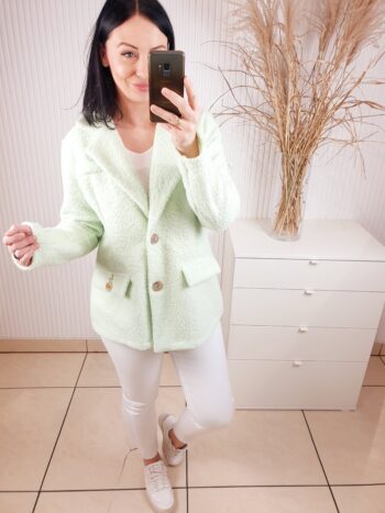 Marynarka w stylu kurtki wykonana z materiału typu bukla. Zapinana na złote guziki, posiada kołnierz oraz imitacje kieszeni. W cudownym, miętowym kolorze idealnym do wiosennych stylizacji.