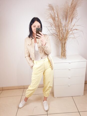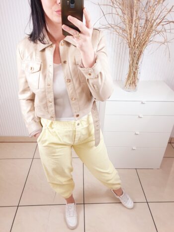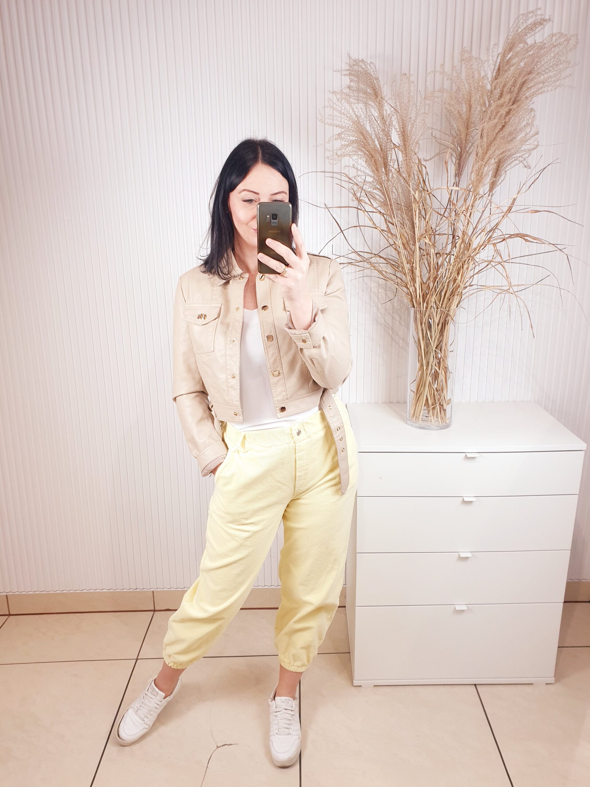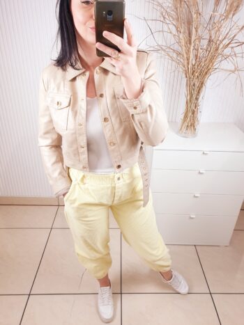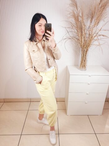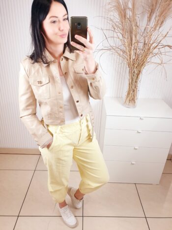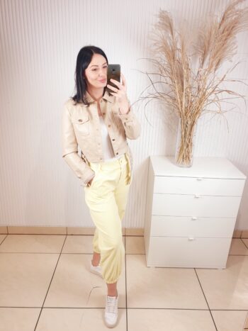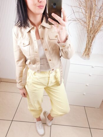 Ramoneska o niezwykle modnym fasonie, posiada kieszenie na przodzie i przeszycia. Rockowy styl przełamany eleganckim krojem, który świetnie dopasuje się do sylwetki i podkreśla kobiecą talie. Pozwoli na stworzenie ponadczasowych stylizacji zarówno w zestawie z jeansami jak i zwiewną sukienką. Niezbędna w szafie każdej modnej kobiety. Posiada złote dodatki.
