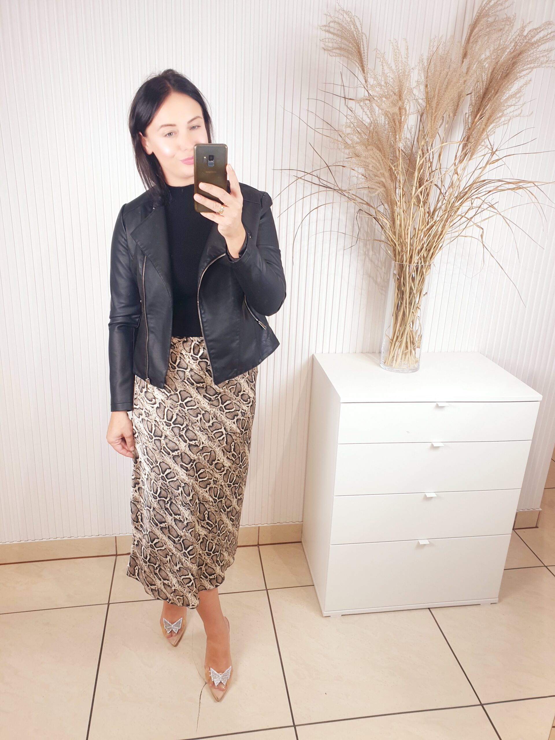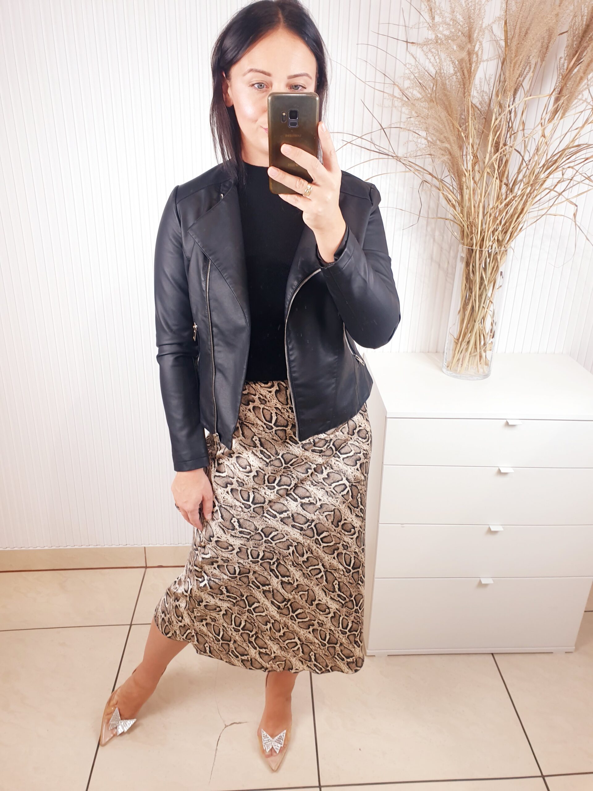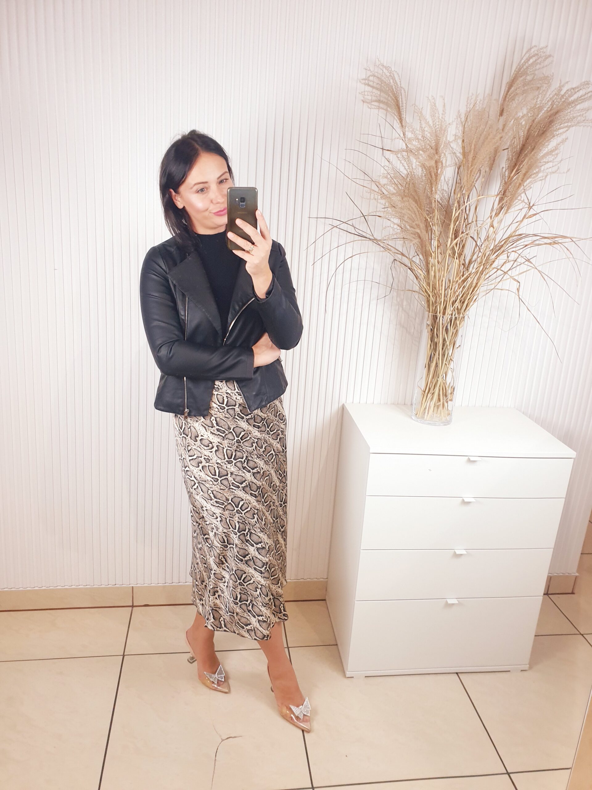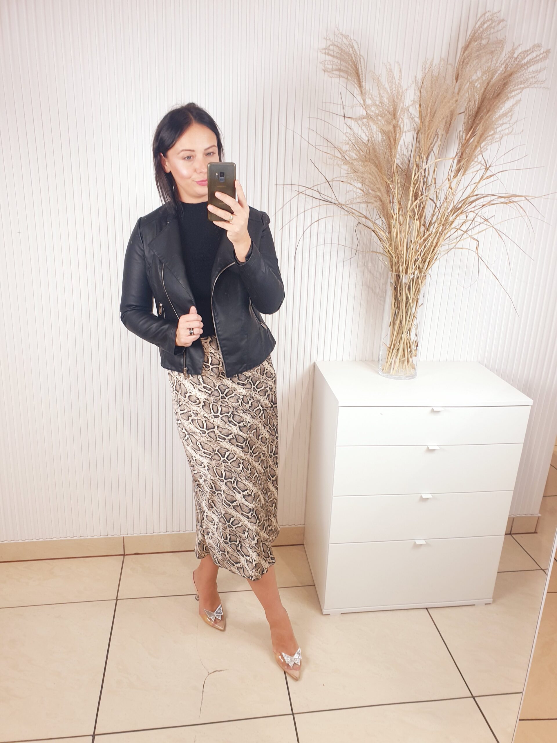 spódnica, satynowa, midi, w wężowy wzór, z gumką w pasie
