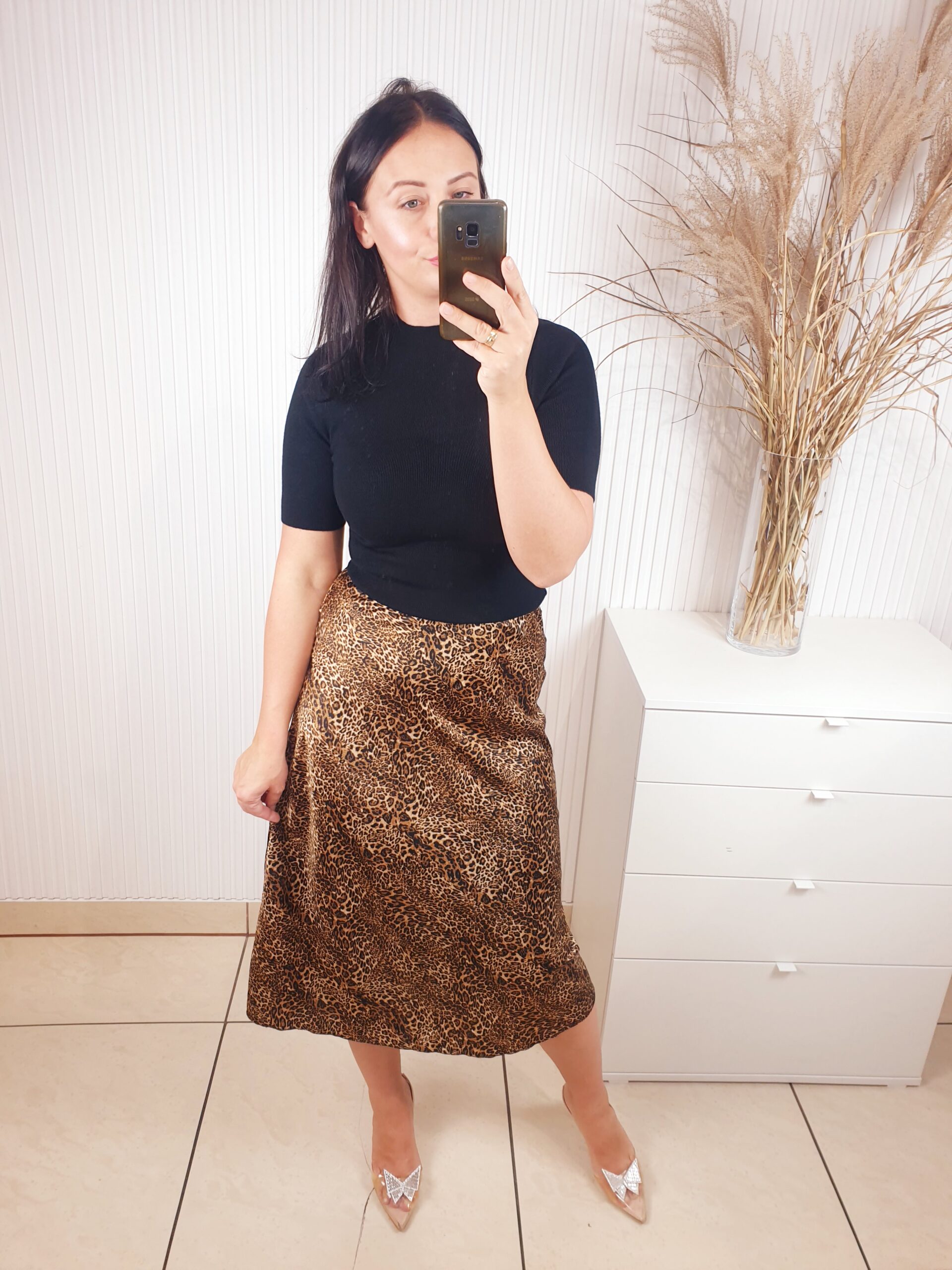 spódnica, satynowa, midi, w panterkę, gumka w pasie,