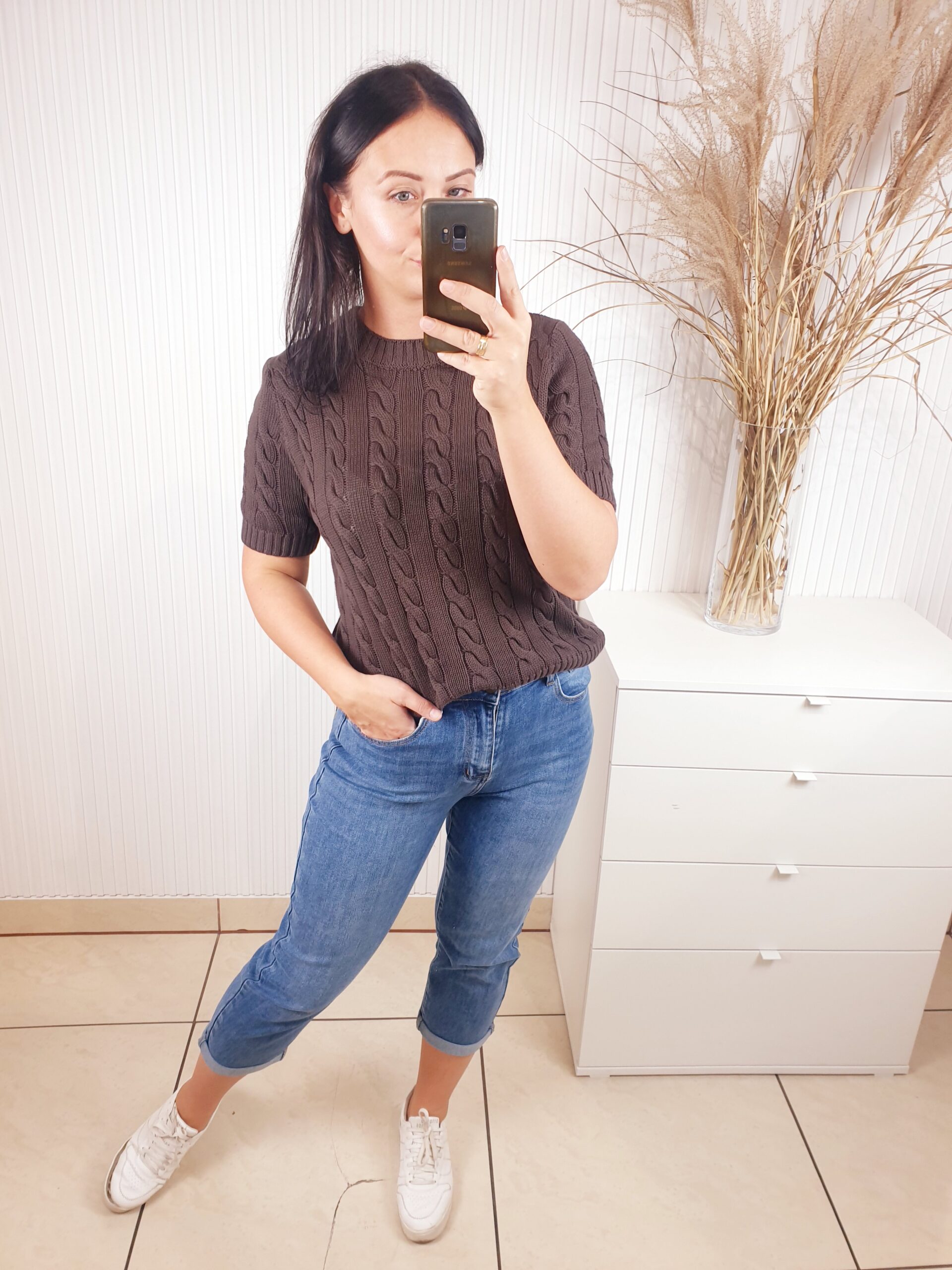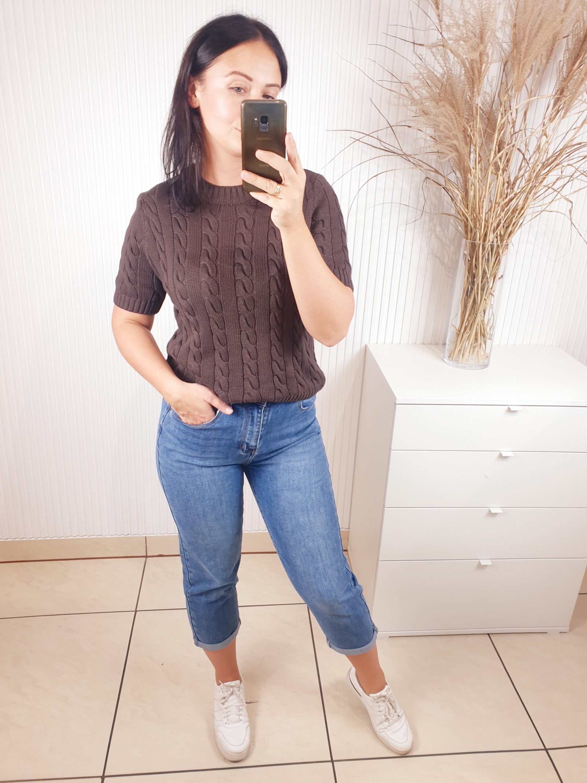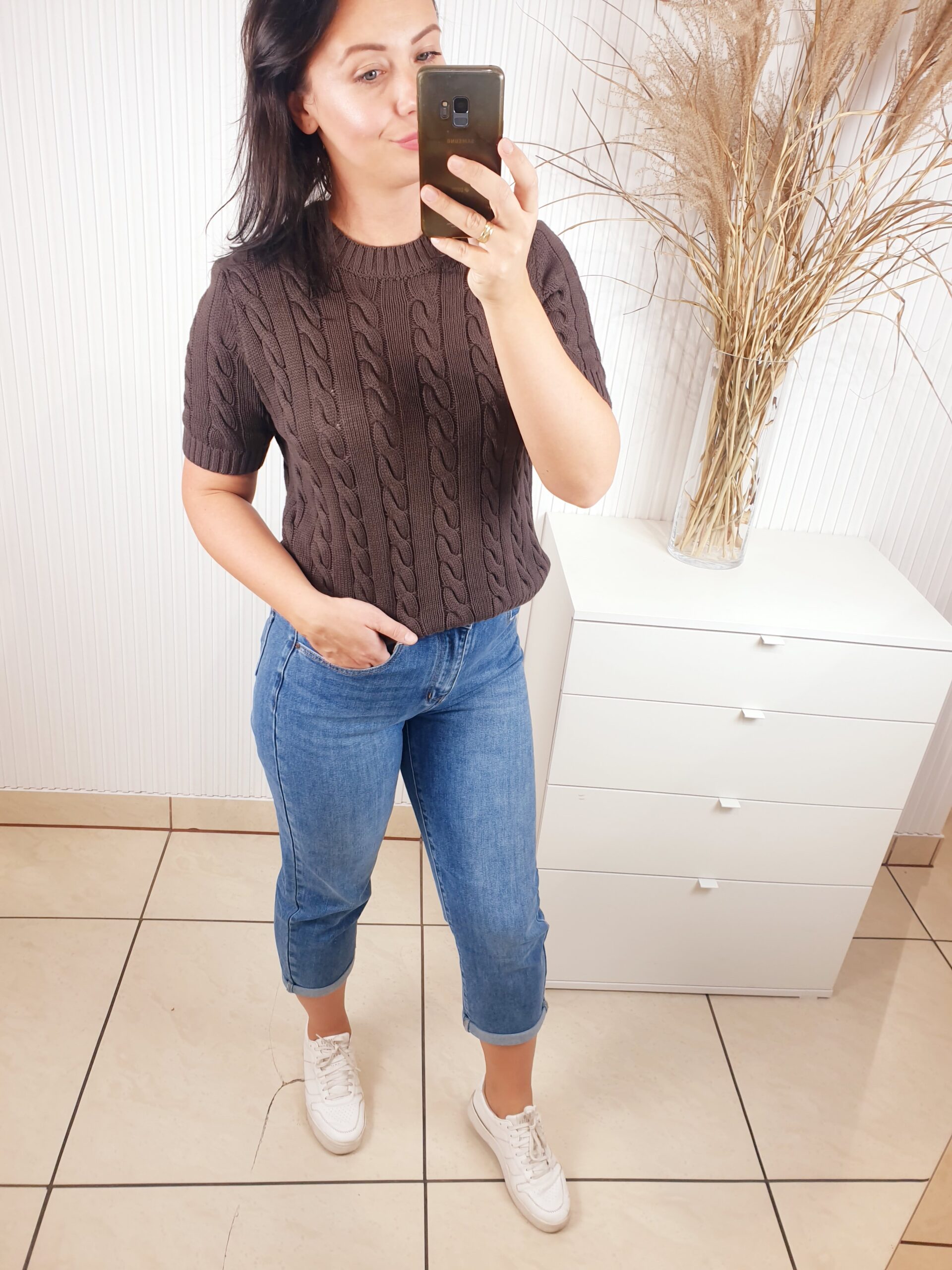 sweter, krótki, krótki rękaw, ze ściągaczem, w warkoczowy splot, luźny, rozmiar uniwersalny, kolor czekoladowy brąz